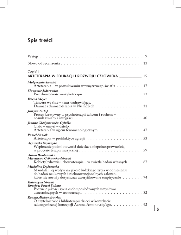 Spis treści Wstęp . . . . . . . . . . . . . . . . . . . . . . . . . . . . . . . . . . . . 9 Słowo od recenzenta . . . . . . . . . . . . . . . . . . . . . . . . . . . . 13 Część I ARTETERAPIA W EDUKACJI I ROZWOJU CZŁOWIEKA ____________ 15 Małgorzata Siemież Arteterapia – w poszukiwaniu wewnętrznego światła . . . . . . . . . 17 Sławomir Sidorowicz Prozdrowotność muzykoterapii . . . . . . . . . . . . . . . . . . . . 23 Verena Meyer Tancerz we śnie – teatr uzdrawiający. Dramat i dramatoterapia w Niemczech . . . . . . . . . . . . . . . . 31 Justyna Torłop Proces kreatywny w psychoterapii tańcem i ruchem – nośnik zmiany i integracji . . . . . . . . . . . . . . . . . . . . . . . 40 Joanna Gładyszewska-Cylulko Ciało – umysł – dzieło. Arteterapia w ujęciu fenomenologicznym . . . . . . . . . . . . . . . 47 Paweł Nowak Arteterapia w profilaktyce agresji . . . . . . . . . . . . . . . . . . . 53 Agnieszka Szymajda Wspieranie podmiotowości dziecka z niepełnosprawnością w procesie terapii muzycznej . . . . . . . . . . . . . . . . . . . . . . 59 Aniela Brudnowska Mirosława Cylkowska-Nowak Kobiety, zdrowie i choreoterapia – w świetle badań własnych . . . . . 67 Michalina Dąbrowska Mandala i jej wpływ na jakość ludzkiego życia w odniesieniu do badań naukowych i niekonwencjonalnych założeń, które nie zostały dotychczas zweryfikowane empirycznie . . . . . . . 74 Katarzyna Nowak Jarosław Paweł Sulima Poczucie jakości życia osób upośledzonych umysłowo uczestniczących w teatroterapii . . . . . . . . . . . . . . . . . . . . 82 Renata Aleksandrowicz O czytelnictwie i biblioterapii dzieci w kontekście salutogenicznej koncepcji Aarona Antonovsky’ego. . . . . . . . . . . 92 5 Małgorzata Modelska Muzykoterapia dzieci i młodzieży z głęboką, złożoną niepełnosprawnością . . . . . . . . . . . . . . . . . . . . 100 Katarzyna Kokot Rola arteterapii w życiu osób niepełnosprawnych ruchowo. Od zniewolenia ku wolności…. . . . . . . . . . . . . . . . . . . . 105 Mira Marcinów Przyzwolenie na szaleństwo czy forma terapii – taniec w ujęciu historycznym . . . . . . . . . . . . . . . . . . . . 115 Justyna Janiszewska-Krukowska Dzieło jako narzędzie pracy nad sobą . . . . . . . . . . . . . . . . 120 Katarzyna Ruda Znaczenie i terapeutyczna rola koncertów muzyki klasycznej w procesie rehabilitacji . . . . . . . . . . . . . . . . . . . . . . . . 126 Sławomir Krzyśka Lingwistyka statystyczna w terapii wierszem . . . . . . . . . . . . 133 Paulina Kużaj-Markiewicz Warsztaty teatralne w szkole . . . . . . . . . . . . . . . . . . . . . 138 Anna Dziad Dorota Gazurek Muzykoterapia w opinii terapeutów i rodziców dzieci niepełnosprawnych . . . . . . . . . . . . . . . . . . . . . . 141 Patrycja Blajer Arteterapia jako metoda rehabilitacji pacjentów oddziału psychiatrii sądowej o wzmocnionym zabezpieczeniu . . . . . . . . 149 Anita Stefańska Teatroterapia osób niepełnosprawnych intelektualnie. Wokół standardów jakości pracy terapeutycznej w porównaniu ze standardami imprez artystycznych. . . . . . . . . 156 ARTETERAPIA w edukacji i rozwoju człowieka Klaudia Kukiełczyńska-Krawczyk 6 Prozdrowotne i lecznicze oddziaływanie sztuki na przykładzie dziejów muzyki . . . . . . . . . . . . . . . . . . . 164 Dominika Siewniak-Maciuszek Sztuka w procesie kompleksowej terapii – Wyniki badań własnych . . . . . . . . . . . . . . . . . . . . . . . 171 CZĘŚĆ II ARTETERAPIA W PRAKTYCE EDUKACYJNEJ _____________________ 181 1. PRZYKŁADY DOBRYCH PRAKTYK ARTETERAPEUTYCZNYCH ___ 182 Maciej Szwed Dolnośląski Ośrodek Osób Twórczych (DOOT) we Wrocławiu Twórczość, która zasypuje przepaść, twórczość, która jest samospełnieniem . . . . . . . . . . . . . . . . 183 Marta Zagórska Stowarzyszenie św. Celestyna, Mikoszów Współistnieć, współtworzyć, współcierpieć . . . . . . . . . . . . . 188 Maciej Szwed Warsztat Terapii Zajęciowej, Ośrodek Rehabilitacyjno-Edukacyjno-Wychowawczy, Dzierżoniów Arteterapia – motywacja do autorehabilitacji . . . . . . . . . . . . 192 Marta Zagórska Harcówka i Stowarzyszenie Potęga Lasu, Twardogóra Dzieląc się swoimi umiejętnościami z innymi . . . . . . . . . . . . 196 Maciej Szwed Warsztaty Terapii Zajęciowej – Bardo Śląskie Twórczość, która pomaga wyrazić emocje, zdobyć zaufanie, pobudzić aktywność, stworzyć dzieło i pozyskać środki . . . . . . . 201 2. SCENARIUSZE ZAJĘĆ ARTETERAPEUTYCZNYCH _______________ 206 Anna Dąbek-Pesz Warsztaty choreoterapeutyczne . . . . . . . . . . . . . . . . . . . 207 Agnieszka Szymajda Warsztaty muzykoterapeutyczne . . . . . . . . . . . . . . . . . . . 210 Renata Aleksandrowicz Warsztaty biblioterapeutyczne . . . . . . . . . . . . . . . . . . . . 213 Artur Szabatowski Zabawy i działania plastyczne . . . . . . . . . . . . . . . . . . . . 216 Bibliografia . . . . . . . . . . . . . . . . . . . . . . . . . . . . . . . . 221 7