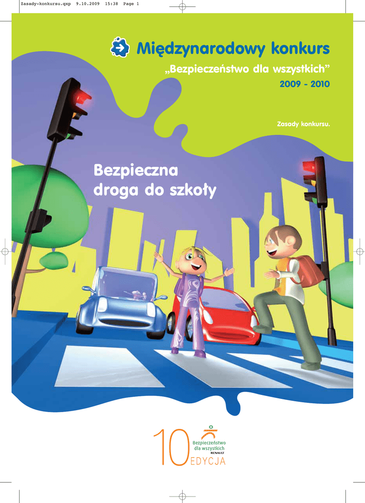 Zasady-konkursu.qxp 9.10.2009 15:38 Page 1 Mi´dzynarodowy konkurs „Bezpieczeƒstwo dla wszystkich” 2009 - 2010 Zasady konkursu. Bezpieczna droga do szko∏y Zasady-konkursu.qxp 9.10.2009 15:38 Page 2 Prezentacja Bezpieczna droga do szkoły droga do szko∏y Statystyki wykazujà, ˝e 44% wypadków drogowych*, których ofiarami sà dzieci, zdarza si´ na trasie pomi´dzy domem a szko∏à. W wi´kszoÊci przypadków ich przyczynà jest nieprawid∏owe zachowanie. W zwiàzku z tym dzieci powinny mieç ÊwiadomoÊç zagro˝eƒ, z jakimi wià˝e si´ poruszanie si´ po drogach i powinny byç na nie przygotowane, ˝eby lepiej reagowaç w trudnych sytuacjach. W∏aÊnie to powinno byç przedmiotem sta∏ej troski i uwagi ze strony dzieci, ich rodziców i nauczycieli. Dlatego te˝ w dziesiàtej edycji Mi´dzynarodowego Konkursu „Bezpieczeƒstwo dla wszystkich” Renault proponuje uczniom szkó∏ podstawowych temat: „Bezpieczna droga do szko∏y” oraz wykonanie poÊwi´conych mu plakatów. Konkurs jest organizowany przy wsparciu Dyrekcji do spraw Bezpieczeƒstwa i Ruchu Drogowego (DSCR). *èród∏o: INRETS (Krajowy Instytut Badawczy do spraw Transportu i Bezpieczeƒstwa). “Kierowcy! Wy tak˝e jesteÊcie rodzicami, zwolnijcie!” Szko∏a nr 696 w Moskwie (ROSJA) 2 Zasady-konkursu.qxp 9.10.2009 15:38 Page 3 „R´ka w r´k´, ˝eby ˝yç bezpiecznie.” Szko∏a nr 23 Nisan Ilkogretim Okulu w Samsun (TURCJA) „Zanim ruszysz, dobrze sprawdê, czy nie ma nas w pobli˝u.” Szko∏a Geoje-Okpo Elementary w Gyeongsang (KOREA) Szko∏a Eduardo Novoa w Meksyku (MEKSYK) „Przestrzeganie znaków i sygna∏ów = ˚ycie.” ASIE CORÉE DU SUD SUÈDE RUSSIE ROYAUME-UNI POLOGNE PAYS-BAS BELGIQUE Celem programu „Bezpieczeƒstwo dla wszystkich” jest uwzgl´dnienie g∏osu dzieci i m∏odzie˝y w dyskusji nad bezpieczeƒstwem drogowym, ich spojrzenia oraz opinii. Program realizowany obecnie w 20 krajach do tej pory pozwoli∏ uczuliç na sprawy bezpieczeƒstwa ponad 9 milionów m∏odych ludzi. ALLEMAGNE AUTRICHE SUISSE FRANCE ITALIE SLOVÉNIE ROUMANIE ESPAGNE GRÈCE TURQUIE PORTUGAL USA CHYPRE LIBAN MEXIQUE 3 Zasady-konkursu.qxp 9.10.2009 15:38 Page 4 Droga do fina∏u Konkurs plakatów Prze˝yjecie pasjonujàcà przygod´, a byç mo˝e kolejne etapy zaprowadzà Was do najciekawszego momentu Konkursu, na Mi´dzynarodowe Spotkanie organizowane w Pary˝u, w którym wezmà tak˝e udzia∏ laureaci ze wszystkich innych paƒstw uczestniczàcych w Konkursie. 1 4 Projekt wykonany przez klas´ Jury krajowe Projekt plakatu powinien zawieraç has∏o oraz ilustracj´ graficznà zgodnie z zasadami wykonania plakatów przedstawionymi w dalszej cz´Êci Informatora (lekcja 2): Jury krajowe, sk∏adajàce si´ z ekspertów w dziedzinie bezpieczeƒstwa drogowego i komunikacji, wybierze plakat, który najlepiej odpowiada edukacyjnym celom Konkursu „Bezpieczeƒstwo dla wszystkich”. Cz∏onkowie jury b´dà si´ kierowaç kryteriami takimi jak zgodnoÊç z tematem konkursu, pozytywne przes∏anie, jakoÊç, kreatywnoÊç i oryginalnoÊç plakatu. • ka˝da klasa bioràca udzia∏ w konkursie mo˝e wys∏aç maksymalnie 3 plakaty; • ostateczny termin wys∏ania prac wyznaczono na 1 marca 2010. 2 Pó∏fina∏ krajowy Wy∏onionych zostanie 7 finalistów, a 63 prace otrzymajà wyró˝nienia. 3 FinaliÊci Jury b´dzie wybieraç zwyci´zc´ spoÊród siedmiu zakwalifikowanych do fina∏u klas. Renault zapewni powielenie siedmiu plakatów zaprojektowanych przez finalistów w 50 egzemplarzach, aby umo˝liwiç zorganizowanie kampanii plakatowych. 4 5 Mi´dzynarodowe Spotkanie Zwyci´zca wy∏oniony w finale krajowym b´dzie móg∏ wziàç udzia∏ w Mi´dzynarodowym Spotkaniu laureatów ze wszystkich krajów uczestniczàcych w Konkursie, które odb´dzie si´ w Pary˝u w czerwcu 2010 r. W ciàgu tych trzech dni wype∏nionych atrakcjami dzieci z ró˝nych krajów b´dà mia∏y te˝ jedynà w swoim rodzaju okazj´, aby ze sobà rozmawiaç, dyskutowaç i prze˝ywaç wspólnie niezwyk∏e chwile w magicznym miejscu. Ich zaÊ nauczyciele b´dà mogli wymieniaç si´ doÊwiadczeniami. Zasady-konkursu.qxp 9.10.2009 15:38 Page 5 Praca w klasie Potrzebne umiej´tnoÊci Wychowanie obywatelskie Plastyka J´zyk polski ZnajomoÊç sytuacji, które wià˝à si´ z korzystaniem z praw i wykonywaniem obowiàzków obywatelskich. Pos∏ugiwanie si´ grà form, kolorów, obrazów; pos∏ugiwanie si´ odpowiednià technikà i uzyskiwanie zamierzonego efektu. Opracowanie komentarza do rysunku; zredagowanie krótkiego tekstu zawierajàcego jasne zalecenie s∏u˝àce zapobieganiu wypadkom; rozró˝nianie szczególnych znaczeƒ s∏ów. Organizacja lekcji Celem projektu jest sformu∏owanie przez uczniów propozycji, które mogà poprawiç warunki bezpieczeƒstwa na trasie pomi´dzy domem a szko∏à poprzez zmian´ zachowaƒ samych dzieci jako pieszych i postaw innych u˝ytkowników dróg (kierowców samochodów i Êrodków komunikacji zbiorowej) oraz doprowadzenie do zainstalowania lub ulepszenia odpowiednich urzàdzeƒ drogowych. Lekcja 1 Jak doje˝d˝asz do szko∏y? Dzieci wype∏niajà krótki kwestionariusz, który pozwoli nauczycielowi lepiej poznaç zwyczaje uczniów w drodze pomi´dzy domem a szko∏à. Chodzi o to, aby ka˝de dziecko samodzielnie zastanowi∏o si´ nad sposobem, w jaki na co dzieƒ si´ przemieszcza. Prawid∏owe zachowania w czasie drogi. Lekcja 2 Uczniowie przygotowujà list´ niebezpieczeƒstw, jakie mogà napotkaç po drodze do szko∏y. Nasz plakat. Chodzi o to, aby dzieci pracujàc w grupach zastanowi∏y si´ nad niebezpieczeƒstwami spotykanymi na trasie mi´dzy domem a szko∏à oraz zachowaniami, które pomogà ich uniknàç. Przypomnienie lub okreÊlenie tematu plakatu. Ustalenie tematów lub hase∏ nadajàcych si´ do umieszczenia na plakacie. • Uczniowie pracujà w grupach nad wykonaniem swoich plakatów. • SpoÊród wykonanych prac klasa wspólnie wybiera jeden, dwa lub trzy. 5 Zas