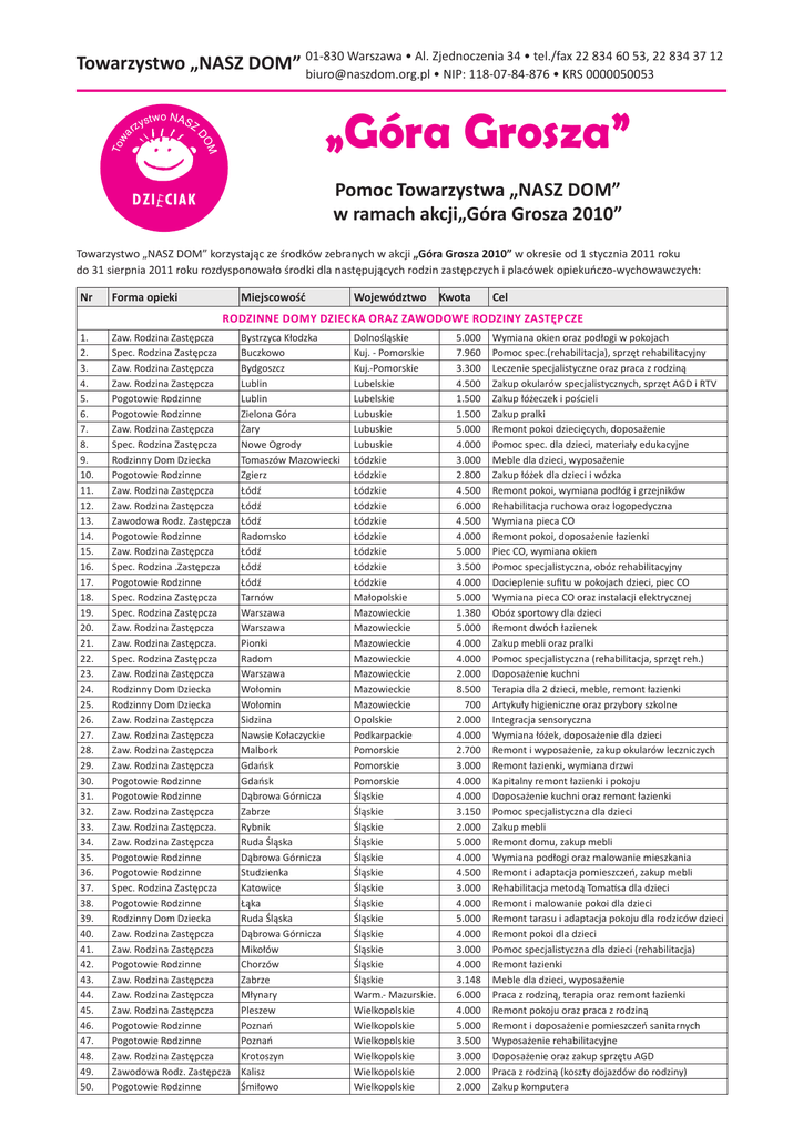 Warszawa • Al. Zjednoczenia 34 • tel./fax 22 834 60 53, 22 834 37 12 Towarzystwo „NASZ DOM” 01-830 [email protected] • NIP: 118-07-84-876 • KRS 0000050053 „Góra Grosza” Pomoc Towarzystwa „NASZ DOM” w ramach akcji„Góra Grosza 2010” Towarzystwo „NASZ DOM” korzystając ze środków zebranych w akcji „Góra Grosza 2010” w okresie od 1 stycznia 2011 roku do 31 sierpnia 2011 roku rozdysponowało środki dla następujących rodzin zastępczych i placówek opiekuńczo-wychowawczych: Nr Forma opieki Miejscowość Województwo Kwota Cel RODZINNE DOMY DZIECKA ORAZ ZAWODOWE RODZINY ZASTĘPCZE 1. 2. 3. 4. 5. 6. 7. 8. 9. 10. 11. 12. 13. 14. 15. 16. 17. 18. 19. 20. 21. 22. 23. 24. 25. 26. 27. 28. 29. 30. 31. 32. 33. 34. 35. 36. 37. 38. 39. 40. 41. 42. 43. 44. 45. 46. 47. 48. 49. 50. Zaw. Rodzina Zastępcza Spec. Rodzina Zastępcza Zaw. Rodzina Zastępcza Zaw. Rodzina Zastępcza Pogotowie Rodzinne Pogotowie Rodzinne Zaw. Rodzina Zastępcza Spec. Rodzina Zastępcza Rodzinny Dom Dziecka Pogotowie Rodzinne Zaw. Rodzina Zastępcza Zaw. Rodzina Zastępcza Zawodowa Rodz. Zastępcza Pogotowie Rodzinne Zaw. Rodzina Zastępcza Spec. Rodzina .Zastępcza Pogotowie Rodzinne Spec. Rodzina Zastępcza Spec. Rodzina Zastępcza Zaw. Rodzina Zastępcza Zaw. Rodzina Zastępcza. Spec. Rodzina Zastępcza Zaw. Rodzina Zastępcza Rodzinny Dom Dziecka Rodzinny Dom Dziecka Zaw. Rodzina Zastępcza Zaw. Rodzina Zastępcza Zaw. Rodzina Zastępcza Zaw. Rodzina Zastępcza Pogotowie Rodzinne Pogotowie Rodzinne Zaw. Rodzina Zastępcza Zaw. Rodzina Zastępcza. Zaw. Rodzina Zastępcza Pogotowie Rodzinne Pogotowie Rodzinne Spec. Rodzina Zastępcza Pogotowie Rodzinne Rodzinny Dom Dziecka Zaw. Rodzina Zastępcza Zaw. Rodzina Zastępcza Pogotowie Rodzinne Zaw. Rodzina Zastępcza Zaw. Rodzina Zastępcza Zaw. Rodzina Zastępcza Pogotowie Rodzinne Pogotowie Rodzinne Zaw. Rodzina Zastępcza Zawodowa Rodz. Zastępcza Pogotowie Rodzinne Bystrzyca Kłodzka Buczkowo Bydgoszcz Lublin Lublin Zielona Góra Żary Nowe Ogrody Tomaszów Mazowiecki Zgierz Łódź Łódź Łódź Radomsko Łódź Łódź Łódź Tarnów Warszawa Warszawa Pionki Radom Warszawa Wołomin Wołomin Sidzina Nawsie Kołaczyckie Malbork Gdańsk Gdańsk Dąbrowa Górnicza Zabrze Rybnik Ruda Śląska Dąbrowa Górnicza Studzienka Katowice Łąka Ruda Śląska Dąbrowa Górnicza Mikołów Chorzów Zabrze Młynary Pleszew Poznań Poznań Krotoszyn Kalisz Śmiłowo Dolnośląskie Kuj. - Pomorskie Kuj.-Pomorskie Lubelskie Lubelskie Lubuskie Lubuskie Lubuskie Łódzkie Łódzkie Łódzkie Łódzkie Łódzkie Łódzkie Łódzkie Łódzkie Łódzkie Małopolskie Mazowieckie Mazowieckie Mazowieckie Mazowieckie Mazowieckie Mazowieckie Mazowieckie Opolskie Podkarpackie Pomorskie Pomorskie Pomorskie Śląskie Śląskie Śląskie Śląskie Śląskie Śląskie Śląskie Śląskie Śląskie Śląskie Śląskie Śląskie Śląskie Warm.- Mazurskie. Wielkopolskie Wielkopolskie Wielkopolskie Wielkopolskie Wielkopolskie Wielkopolskie 5.000 7.960 3.300 4.500 1.500 1.500 5.000 4.000 3.000 2.800 4.500 6.000 4.500 4.000 5.000 3.500 4.000 5.000 1.380 5.000 4.000 4.000 2.000 8.500 700 2.000 4.000 2.700 3.000 4.000 4.000 3.150 2.000 5.000 4.000 4.500 3.000 4.000 5.000 4.000 3.000 4.000 3.148 6.000 4.000 5.000 3.500 3.000 2.000 2.000 Wymiana okien oraz podłogi w pokojach Pomoc spec.(rehabilitacja), sprzęt rehabilitacyjny Leczenie specjalistyczne oraz praca z rodziną Zakup okularów specjalistycznych, sprzęt AGD i RTV Zakup łóżeczek i pościeli Zakup pralki Remont pokoi dziecięcych, doposażenie Pomoc spec. dla dzieci, materiały edukacyjne Meble dla dzieci, wyposażenie Zakup łóżek dla dzieci i wózka Remont pokoi, wymiana podłóg i grzejników Rehabilitacja ruchowa oraz logopedyczna Wymiana pieca CO Remont pokoi, doposażenie łazienki Piec CO, wymiana okien Pomoc specjalistyczna, obóz rehabilitacyjny Docieplenie sufitu w pokojach dzieci, piec CO Wymiana pieca CO oraz instalacji elektrycznej Obóz sportowy dla dzieci Remont dwóch łazienek Zakup mebli oraz pralki Pomoc specjalistyczna (rehabilitacja, sprzęt reh.) Doposażenie kuchni Terapia dla 2 dzieci, meble, remont łazienki Artykuły higieniczne oraz przybory szkolne Integracja sensoryczna Wymiana łóżek, doposażenie dla dzieci Remont i wyposażenie, zakup okularów leczniczych Remont łazienki, wymiana drzwi Kapitalny remont łazienki i pokoju Doposażenie kuchni oraz remont łazienki Pomoc specjalistyczna dla dzieci Zakup mebli Remont domu, zakup mebli Wymiana podłogi oraz malowanie mieszkania Remont i adaptacja pomieszczeń, zakup mebli Rehabilitacja metodą Tomatisa dla dzieci Remont i malowanie pokoi dla dzieci Remont tarasu i adaptacja pokoju dla rodziców dzieci Remont pokoi dla dzieci Pomoc specjalistyczna dla dzieci (rehabilitacja) Remont łazienki Meble dla dzieci, wyposażenie Praca z rodziną, terapia oraz remont łazienki Remont pokoju oraz praca z rodziną Remont i doposażenie pomieszczeń sanitarnych Wyposażenie rehabilitacyjne Doposażenie oraz zakup sprzętu AGD Praca z rodziną (koszty dojazdów do rodziny) Zakup komputera 51. Zaw. Rodzina Zastępcza Turowo Zachodniopom. 5.000 52. Pogotowie Rodzinne Szczecin Zachodniopom. 6.000 53. 54. 55. 56. 57. Spec. Rodzina Zastępcza Pogotowie Rodzinne Zaw. Rodzina Zastępcza Pogotowie Rodzinne Pogotowie Rodzinne Razem: Manowo Kołobrzeg Szczecin Szczecin Szczecin Zachodniopom. Zachodniopom. Zachodniopom. Zachodniopom. Zachodniopom. 1.150 4.000 4.000 5.194 2.500 218.482 Pomoc specjalistyczna (rehabilitacja, logopedia) Pomoc specjalistyczna, adaptacja pokoju dla rodziców dzieci Kolonie terapeutyczne Remont i doposażenie trzech pokoi Zakup mebli i doposażenie domu Pomieszczenie do rehabilitacji oraz sprzęt spec. Doposażenie pokoi dziecięcych RODZINNE DOMY DZIECKA ORAZ ZAWODOWE RODZINY ZASTĘPCZE WNIOSKI W TRAKCIE OPRACOWANIA 58. 59. 60. 61. 62. 63. 64. 65. 66. 67. 68. 69. Zaw. Rodzina Zastępcza Zaw. Rodzina Zastępcza Zaw. Rodzina Zastęp