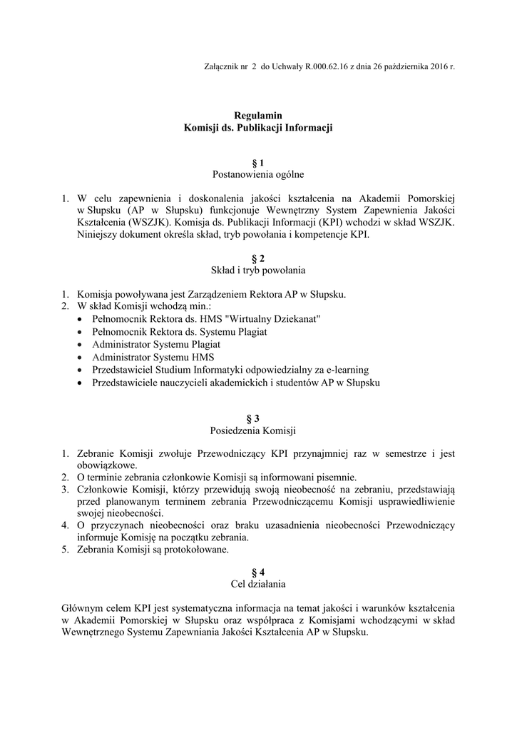 Załącznik nr 2 do Uchwały R.000.62.16 z dnia 26 października 2016 r. Regulamin Komisji ds. Publikacji Informacji §1 Postanowienia ogólne 1. W celu zapewnienia i doskonalenia jakości kształcenia na Akademii Pomorskiej w Słupsku (AP w Słupsku) funkcjonuje Wewnętrzny System Zapewnienia Jakości Kształcenia (WSZJK). Komisja ds. Publikacji Informacji (KPI) wchodzi w skład WSZJK. Niniejszy dokument określa skład, tryb powołania i kompetencje KPI. §2 Skład i tryb powołania 1. Komisja powoływana jest Zarządzeniem Rektora AP w Słupsku. 2. W skład Komisji wchodzą min.: Pełnomocnik Rektora ds. HMS "Wirtualny Dziekanat" Pełnomocnik Rektora ds. Systemu Plagiat Administrator Systemu Plagiat Administrator Systemu HMS Przedstawiciel Studium Informatyki odpowiedzialny za e-learning Przedstawiciele nauczycieli akademickich i studentów AP w Słupsku §3 Posiedzenia Komisji 1. Zebranie Komisji zwołuje Przewodniczący KPI przynajmniej raz w semestrze i jest obowiązkowe. 2. O terminie zebrania członkowie Komisji są informowani pisemnie. 3. Członkowie Komisji, którzy przewidują swoją nieobecność na zebraniu, przedstawiają przed planowanym terminem zebrania Przewodniczącemu Komisji usprawiedliwienie swojej nieobecności. 4. O przyczynach nieobecności oraz braku uzasadnienia nieobecności Przewodniczący informuje Komisję na początku zebrania. 5. Zebrania Komisji są protokołowane. §4 Cel działania Głównym celem KPI jest systematyczna informacja na temat jakości i warunków kształcenia w Akademii Pomorskiej w Słupsku oraz współpraca z Komisjami wchodzącymi w skład Wewnętrznego Systemu Zapewniania Jakości Kształcenia AP w Słupsku. §5 Kompetencje 2. Do zadań KPI należy: a) Wypracowanie i nadzór zasad gromadzenia oraz publikowania informacji na temat jakości kształcenia. b) Zapewnienie przejrzystości i odpowiedniej dostępności do informacji na temat Wewnętrznego Systemu Zapewniania Jakości Kształcenia AP w Słupsku. c) Podejmowanie działań na rzecz podnoszenia jakości kształcenia w AP w Słupsku. d) Publikowanie aktualnych i obiektywnych informacji, w ujęciu ilościowym i jakościowym, dotyczących min. raportów z oceny własnej wydziałów i jednostek dydaktycznych oraz wyników przeprowadzanych na uczelni ankietyzacji. e) Rozpowszechnianie informacji wśród studentów i nauczycieli akademickich na temat prowadzonych działań jakościowych. f) Podejmowanie działań zmierzających do uzyskania przejrzystej uczelnianej strony internetowej i ujednolicenia wydziałowych stron internetowych. W tym konieczność publikowania informacji na temat: a) programów kształcenia kierunków studiów, b) wyników z przeprowadzonych badań ankietowych, c) akredytacji w poszczególnych jednostkach. g) Pomoc w rozwiązywaniu bieżących problemów technicznych dotyczących funkcjonowania i obsługi sytemu e-HMS, systemu Plagiat oraz platformy e-learningowej. h) Organizacja i obsługa przebiegu akcji ankietowych oraz sposobu gromadzenia i rozsyłania danych w systemie e-HMS. i) Nadzór nad funkcjonowaniem i właściwym wykorzystaniem platformy e-learningowej, rozpowszechnianie wiedzy na temat możliwości jej stosowania w procesie dydaktycznym. j) Współpraca z firmami zewnętrznymi, realizującymi usługi w zakresie obsługi strony internetowej uczelni, systemu e-HMS, systemu Plagiat oraz platformy e-learningowej. §6 Procedury Procedury w zakresie obsługi systemów: e-HMS (Wirtualny Dziekanat), Plagiat oraz platformy e-learning oraz uczelnianego serwisu internetowego określa: 1. Procedura dotycząca publikacji informacji w systemie HMS (Załącznik nr 1) 2. Procedura dotycząca korzystania z systemu Plagiat. pl. (Załącznik nr 2) 3. Procedura dotycząca korzystania z platformy e-learningu (Załącznik nr 3) §7 Postanowienia końcowe 1. KPI przygotowuje sprawozdanie ze swojej działalności za miniony rok akademicki, które przekazuje Przewodniczącemu Uczelnianej Komisji ds. Jakości Kształcenia do dnia 5 października każdego roku. 2. We wrześniu komisja ustala na kolejny rok akademicki harmonogram działań dla poszczególnych obszarów swoich kompetencji. Kopię harmonogramu przekazuje Przewodniczącemu Uczelnianej Komisji ds. Jakości Kształcenia do dnia 15 października każdego roku. 3. W sprawach nieuregulowanych niniejszym Regulaminem znajdują zastosowanie obowiązujące przepisy prawa powszechnego oraz wewnętrzne regulacje Uczelni. 4. Regulamin wchodzi w życie z dniem podpisania. ZAŁĄCZNIKI Integralną częścią Regulaminu są następujące załączniki: Załącznik nr 1 – Procedura dotycząca publikacji informacji w systemie HMS. Załącznik nr 2 – Procedura dotycząca korzystania z systemu Plagiat. pl. Załącznik nr 3 – Procedura dotycząca korzystania z platformy e-learningu. Załącznik nr 1 do „Regulaminu Komisji ds. Publikacji Informacji” Procedura dotycząca publikacji informacji w systemie HMS W systemie e-HMS zamieszczone są dane, które usprawniają funkcjonowanie procesu kształcenia oraz umożliwiają swobodny i szybki dostęp studentom i pracownikom do informacji. Możliwa jest bezpośrednia korespondencja ze studentami, informowanie ich o ofertach, ankietach, nowościach, zmianach. Dzięki systemowi HMS „Wirtualny Dziekanat” możliwy jest dostęp do oferty dydaktycznej, planów studiów, protokołów zaliczeniowych, kart okresowych zaliczeń studentów, ankiet, suplementów, druków, wykazu studentów, wykazu pracowników naukowo-dydaktycznych. 1. Miesiąc przed rozpoczęciem semestru pracownicy sekretariatów Instytutów/Katedr są zobowiązani do wprowadzanie planów do systemu HMS Dziekanat. 2. Dwa tygodnie przed rozpoczęciem semestru Pełnomocnik Rektora ds. HMS "Wirtualny Dziekanat" przypisuje plany studiów dla poszczególnych kierunków oraz generuje plany zajęć dla poszczególnych kierunków. 3. Pracownicy naukowo-dydaktyczni na tydzień przed rozpoczęciem semestru zobowiązani są do zam