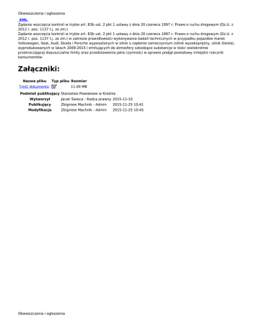 Obwieszczenia i ogłoszenia XML Żądanie wszczęcia kontroli w trybie art. 83b ust. 2 pkt 1 ustawy z dnia 20 czerwca 1997 r. Prawo o ruchu drogowym (Dz.U. z 2012 r. poz. 1137 t.j. ze zm.) Żądanie wszczęcia kontroli w trybie art. 83b ust. 2 pkt 1 ustawy z dnia 20 czerwca 1997 r. Prawo o ruchu drogowym (Dz.U. z 2012 r. poz. 1137 t.j. ze zm.) w zakresie prawidłowości wykonywania badań technicznych w przypadku pojazdów marek Volkswagen, Seat, Audi, Skoda i Porsche wyposażonych w silnik o zapłonie samoczynnym (silnik wysokoprężny, silnik Diesla), wyprodukowanych w latach 2009-2015 i emitujących do atmosfery szkodzące substancje w ilości wielokrotnie przekraczającej dopuszczalne limity oraz przedstawienia jakie czynności w sprawie podjął powiatowy (miejski) rzecznik konsumentów Załączniki: Nazwa pliku Typ pliku Rozmiar Treść dokumentu 11.00 MB Podmiot publikujący Starostwo Powiatowe w Krośnie Wytworzył Jacek Świeca - Radca prawny 2015-11-10 Publikujący Zbigniew Machnik - Admin 2015-11-25 10:41 Modyfikacja Zbigniew Machnik - Admin 2015-11-25 10:45 Obwieszczenia i ogłoszenia