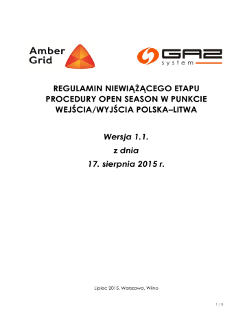 REGULAMIN NIEWIĄŻĄCEGO ETAPU PROCEDURY OPEN SEASON W PUNKCIE WEJŚCIA/WYJŚCIA POLSKA–LITWA Wersja 1.1. z dnia 17. sierpnia 2015 r. Lipiec 2015, Warszawa, Wilno 1/9 1. INFORMACJE OGÓLNE Na podstawie procedury przewidzianej przez niniejszy Regulamin, GAZ-SYSTEM S.A. oraz Amber Grid oszacują poziom popytu Uczestników rynku (Shipperów) na Zdolności przesyłowe w Punkcie wejścia/wyjścia Polska - Litwa, które zostaną udostępnione po oddaniu do użytku Gazowego Połączenia Międzysystemowego Polska - Litwa. 1.1. GAZ-SYSTEM S.A. i Amber Grid planują przeprowadzić wspólnie procedurę Open Season, niezbędną do podjęcia decyzji o budowie Gazowego Połączenia Międzysystemowego Polska – Litwa, w podziale na dwa etapy: niewiążący etap procedury Open Season, w czasie którego zostanie przeprowadzone badanie rynku odnośnie poziomu zainteresowania na usługi przesyłu gazu oraz Zdolności przesyłowych w Punkcie wejścia/wyjścia Polska - Litwa planowanego Gazowego Połączenia Międzysystemowego Polska - Litwa, wiążący etap Procedury Open Season, w czasie którego przydzielone zostaną Zdolności przesyłowe w Punkcie wejścia/wyjścia Polska - Litwa Gazowego Połączenia Międzysystemowego Polska-Litwa. OPIS PROJEKTU Amber Grid i GAZ-SYSTEM S.A. planują budowę nowego dwukierunkowego połączenia międzysystemowego łączącego systemy przesyłowe gazu ziemnego Polski i Litwy wraz z infrastrukturą towarzyszącą. Kluczowym elementem realizacji Projektu będzie budowa gazociągu o długości około 534 km. Głównym celem budowy Gazowego Połączenia Międzysystemowego Polska-Litwa jest stworzenie ciągłych Zdolności przesyłowych między polskim i litewskim systemem przesyłowym gazu ziemnego na poziomie określonym w poniższej tabeli: Kierunek kWh/h MWh/d mld(n)/r cm(n)/g (orientacyjna wartość) (orientacyjna wartość) PL-LT 3 080 000 73 920 2.4 275 000 LT-PL 2 128 000 51 072 1.7 190 000 Umożliwi to przesył gazu z rynków europejskich na Litwę i istotnie przyczyni się do realizacji polityki energetycznej Unii Europejskiej w zakresie integracji odizolowanych rynków energetycznych krajów bałtyckich ze wspólnym rynkiem energii UE oraz do zapewnienia tym krajom bezpieczeństwa energetycznego. Realizacja projektu Gazowego Połączenia Międzysystemowego Polska - Litwa wymaga zaprojektowania i wybudowania gazociągu prowadzącego od litewskiej tłoczni gazu w miejscowości Jauniunai przez granicę polsko-litewską do polskiej tłoczni gazu w miejscowości Rembelszczyzna oraz nowej tłoczni gazu w miejscowości Gustorzyn, a także rozbudowy tłoczni gazu w miejscowości Rembelszczyzna. 2/9 Zdolności przesyłowe w Punkcie wejścia/wyjścia Polska - Litwa będą udostępnione w ramach Procedury Open Season. 1.2. INFORMACJE O SPÓŁCE AMBER GRID AB Amber Grid odpowiada za przesył gazu ziemnego (transport gazu ziemnego gazociągami wysokociśnieniowymi) do użytkowników systemu oraz za eksploatację, utrzymanie i rozwój gazowego systemu przesyłowego na Litwie. Spółka AB Amber Grid rozpoczęła działalność 1 sierpnia 2013 r., kiedy to weszła w życie przyznana jej na czas określony licencja na przesył gazu ziemnego (wydana AB Amber Grid przez Państwową Komisję Kontroli Cen i Energetyki). 10 kwietnia 2015 r. pomyślnie zakończyła się Procedura certyfikacji litewskiego Operatora Systemu Przesyłowego Gazu Ziemnego – AB Amber Grid – i spółka uzyskała licencję Operatora Systemu Przesyłowego na czas nieokreślony. Struktura akcjonariatu AB Amber Grid: UAB EPSO-G (kontrolowane przez Ministerstwo Energetyki Republiki Litewskiej) posiada 96,58% akcji, akcjonariusze mniejszościowi posiadają 3,42% akcji. 1.3. INFORMACJE O SPÓŁCE GAZ-SYSTEM S.A. Podstawą działalności GAZ-SYSTEM S.A. jest transport gazu za pośrednictwem sieci przesyłowej na terenie Polski, dostarczanie gazu do sieci dystrybucyjnej oraz klientów końcowych podłączonych do systemu przesyłowego. 13 października 2010 r. Prezes Urzędu Regulacji Energetyki wydał decyzję, zgodnie z którą spółka GAZ-SYSTEM S.A. uzyskała status operatora systemu przesyłowego na terenie Polski na okres do 31 grudnia 2030 r. Spółka prowadzi działalność przesyłową w oparciu o sieć przesyłową na terenie Rzeczypospolitej Polskiej pozostającą w jej posiadaniu. Dnia 22 września 2014 r. spółka GAZ-SYSTEM S.A. uzyskała decyzję wydaną przez Prezesa URE nadającą jej certyfikat niezależności w związku z wykonywaniem funkcji operatora systemu na sieciach własnych. Kapitał zakładowy spółki wynosi 3 771 990 842 zł. 1.4. DEFINICJE 1.4.1. Amber Grid – litewski operator systemu przesyłowego gazu ziemnego pod nazwą AB “Amber Grid” z siedzibą w Wilnie; 1.4.2. Gazowe Połączenie Międzysystemowe Polska - Litwa – gazociąg łącznie z infrastrukturą towarzyszącą prowadzący od tłoczni gazu Jauniunai (Litwa) do tłoczni gazu Rembelszczyzna (Polska), łącznie z rozbudową tłoczni gazu Rembelszczyzna oraz budową nowej tłoczni gazu Gustorzyn; 1.4.3. GAZ-SYSTEM S.A. – spółka Operator Gazociągów Przesyłowych GAZ-SYSTEM S.A. z siedzibą w Warszawie; 1.4.4. Harmonogram – opisany w punkcie najistotniejszych etapów Projektu; 1.6 ramowy plan wykonania 1.4.5. kWh (kilowatogodzina) – oznacza jednostkę energii, równowartość ilości przesyłanego gazu, będąc zarazem produktem gazu przesyłanego w 3/9 danym Punkcie wejścia lub danym punkcie wyjścia w jednostkach objętości i wartości opałowej brutto charakterystycznych dla tego punktu; 1.4.6. NCC – Państwowa Komisja Kontroli Cen i Energetyki, krajowy organ regulacyjny na Litwie; 1.4.7. Procedura – niewiążący etap procedury Open Season prowadzony w celu określenia popytu Uczestników rynku na Zdolności przesyłowe w Punkcie wejścia/wyjścia Polska - Litwa Gazowego Połączenia Międzysystemowego Polska - Litwa w obu kierunkach przesyłu gazu, której zasady przebiegu określa niniejszy regula