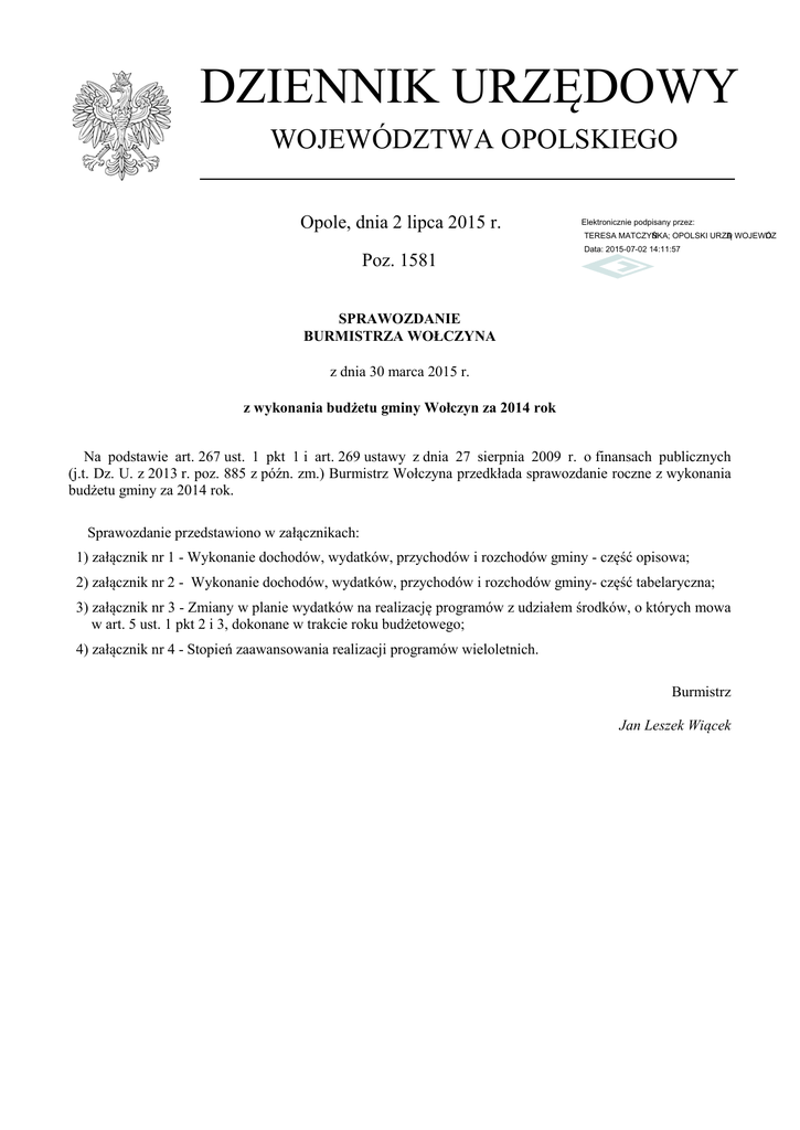 DZIENNIK URZĘDOWY WOJEWÓDZTWA OPOLSKIEGO Opole, dnia 2 lipca 2015 r. Elektronicznie podpisany przez: TERESA MATCZYŃSKA; OPOLSKI URZĄD WOJEWÓDZKI Poz. 1581 Data: 2015-07-02 14:11:57 SPRAWOZDANIE BURMISTRZA WOŁCZYNA z dnia 30 marca 2015 r. z wykonania budżetu gminy Wołczyn za 2014 rok Na podstawie art. 267 ust. 1 pkt 1 i art. 269 ustawy z dnia 27 sierpnia 2009 r. o finansach publicznych (j.t. Dz. U. z 2013 r. poz. 885 z późn. zm.) Burmistrz Wołczyna przedkłada sprawozdanie roczne z wykonania budżetu gminy za 2014 rok. Sprawozdanie przedstawiono w załącznikach: 1) załącznik nr 1 - Wykonanie dochodów, wydatków, przychodów i rozchodów gminy - część opisowa; 2) załącznik nr 2 - Wykonanie dochodów, wydatków, przychodów i rozchodów gminy- część tabelaryczna; 3) załącznik nr 3 - Zmiany w planie wydatków na realizację programów z udziałem środków, o których mowa w art. 5 ust. 1 pkt 2 i 3, dokonane w trakcie roku budżetowego; 4) załącznik nr 4 - Stopień zaawansowania realizacji programów wieloletnich. Burmistrz Jan Leszek Wiącek Dziennik Urzędowy Województwa Opolskiego –2– Poz. 1581 Załącznik nr 1 do Sprawozdania Burmistrza Wołczyna z dnia 30 marca 2015 r. Wykonanie dochodów, wydatków, przychodów i rozchodów gminy - część opisowa I. Dochody Dochody budżetowe zaplanowano w wysokości 41.922.143,68 zł, a wykonano w wysokości 41.474.765,17 zł, w tym: dochody bieżące - plan - 38.914.868,82 zł, wykonanie - 38.950.058,68 zł (100%), dochody majątkowe - plan- 3.007.274,86 zł, wykonanie - 2.524.706,49 zł (84%). Skutki obniżenia uchwałami Rady Gminy górnych stawek podatkowych w podatku od nieruchomości i podatku od środków transportowych wyniosły - 1.663.491,68 zł, skutki zwolnień wynikających z uchwał rady w podatku od nieruchomości wyniosły - 208.132,62 zł. Skutki umorzeń zaległości podatkowych wyniosły - 98.047,22 zł, skutki odroczeń i rozłożeń na raty wyniosły - 30.524,06 zł. Zaległości podatkowe wyniosły 8.109.884,74 zł to głównie zaległości w podatku od nieruchomości od osób prawnych - 6.961.873,64 zł. Odsetki od zaległości podatkowych na dzień 31.12.2014 r. wyniosły - 12.115.282,50 zł. W celu wyegzekwowania zobowiązań wysłano 1539 upomnień, skierowano 403 wnioski egzekucyjne, wysłano 42 wezwania do zapłaty opłaty z tytułu wieczystego użytkowania, skierowano 13 wniosków o wpis hipoteki przymusowej i 2 pozwy sądowe o egzekucję zaległości z tytułu wieczystego użytkowania. Wykonanie dochodów bieżących w poszczególnych działach klasyfikacji budżetowej przedstawia się następująco: Dział 010- Rolnictwo i łowiectwo plan -9 28.921,54 zł, wykonanie - 928.984,58 zł - odsetki - 63,04 zł - dotacja z budżetu państwa na zadanie - zwrot rolnikom podatku akcyzowego zawartego w cenie oleju napędowego - 928.921,54 zł Dziennik Urzędowy Województwa Opolskiego –3– Poz. 1581 Dział 020 - Leśnictwo plan 15.100 zł, wykonanie - 12.303,24 zł - wpłaty z dzierżawy obwodów łowieckich - 12.303,24 zł Dział 700 - Gospodarka mieszkaniowa Plan - 802.260 zł, wykonanie - 790.283,33 zł - wpływy za zarząd i użytkowanie wieczyste - 54.294,48 zł - dochody za czynsze realizowane przez PGKiM sp z o.o. - 680.580,42 zł - dochody z tytułu innych umów najmu i dzierżawy - 39.447,04 zł - odsetki - 15.478,39 zł - wpływy z tytułu opłaty adiacenckiej - 483 zł Dział 750 - Administracja publiczna plan - 176.169 zł, wykonanie- 206.138,90 zł - dotacja z budżetu państwa na zadania zlecone ustawami (finansowanie wynagrodzenia pracowników realizujących zadania zlecone z budżetu państwa np. Urząd Stanu Cywilnego) - 113.748 zł - dochody gminy związane z realizacją zadań zleconych - 54,25 zł - wpływy z usług - 31.380,11 zł - odsetki - 10,55 zł - refundacja płac - roboty publiczne - z PUP w Kluczborku - 46.884,43 zł - darowizny na Serce dla Wołczyna - 13.125,80 zł - pozostałe dochody -935,76 zł Dział 751 - Urzędy naczelnych organów władzy państwowej, kontroli i ochrony prawa oraz sądownictwa plan- 151.181 zł, wykonanie - 117.690 zł - dotacja z budżetu państwa na aktualizację rejestru wyborców - 2.405 zł, - dotacja z budżetu państwa na wybory do parlamentu europejskiego - 40.607 zł - dotacja z budżetu państwa na wybory do rady gminy i wybór burmistrza - 74.678 zł Dział 752 - Obrona narodowa plan - 1.000 zł, wykonanie - 1.000 zł - dotacja z budżetu państwa na zadania z zakresu obrony - 1.000 zł Dział 754 - Bezpieczeństwo publiczne i ochrona przeciwpożarowa plan 11.500 zł, wykonanie - 11.180,44 zł - mandaty - 2.180,44 zł - odszkodowanie za samochód Straży Miejskiej - 9.000 zł Dział 756 - Dochody od osób prawnych, od osób fizycznych i od innych jednostek nieposiadających osobowości prawnej oraz wydatki związane z ich poborem plan - 15.084.480 zł, wykonanie - 14.994.686,55 zł - podatek - karta podatkowa - 22.396,97 zł - podatek od nieruchomości - 6.076.865,19 zł - podatek rolny - 2.411.361,02 zł - podatek leśny - 121.380,91 zł - podatek od środków transportowych - 343.158,98 zł - podatek od spadków i darowizn - 27.329,24 zł - opłata od posiadania psów - 4.904,47 zł - opłata targowa - 133.074 zł - podatek od czynności cywilnoprawnych - 262.634,68 zł - odsetki podatkowe - 36.919,53 zł - rekompensata utraconych dochodów w podatku od nieruchomości - 5.254 zł - opłata skarbowa - 27.992,49 zł - wpływy z tytułu zezwoleń na sprzedaż napojów alkoholowych - 210.633,81 zł - opłaty za umieszczenie urządzeń w pasie drogi - 6.800,64 zł - pozostałe odsetki - 160,60 zł - wpływy z koncesji - 7.491,50 zł Dziennik Urzędowy Województwa Opolskiego –4– Poz. 1581 - udziały gminy w podatku dochodowym od osób fizycznych - 4.866.643 zł - udziały gminy w podatku dochodowym od osób prawnych - 429.685,52 zł Dział 758 - Różne rozliczenia plan - 12.637.190,43 zł , wykonanie - 12.635.485,06 zł - czę