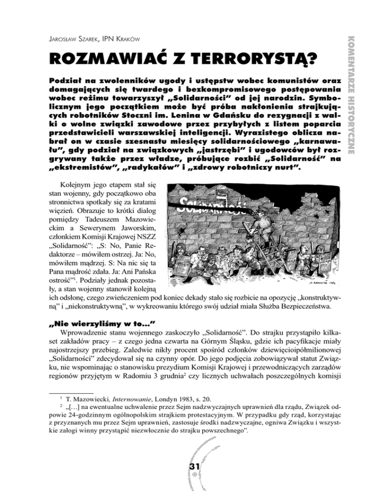 ROZM AWIAĆ Z TERRORYSTĄ? Podział na zwolenników ugody i ustępstw wobec komunistów oraz domagających się twardego i bezkompromisowego postępowania wobec reżimu towarzyszył „Solidarności” od jej narodzin. Symbolicznym jego początkiem może być próba nakłonienia strajkujących robotników Stoczni im. Lenina w Gdańsku do rezygnacji z walki o wolne związki zawodowe przez przybyłych z listem poparcia przedstawicieli warszawskiej inteligencji. Wyrazistego oblicza nabrał on w czasie szesnastu miesięcy solidarnościowego „karnawału”, gdy podział na związkowych „jastrzębi” i ugodowców był rozgrywany także przez władze, próbujące rozbić „Solidarność” na „ekstremistów”, „radykałów” i „zdrowy robotniczy nurt”. Kolejnym jego etapem stał się stan wojenny, gdy początkowo oba stronnictwa spotkały się za kratami więzień. Obrazuje to krótki dialog pomiędzy Tadeuszem Mazowieckim a Sewerynem Jaworskim, członkiem Komisji Krajowej NSZZ „Solidarność”: „S: No, Panie Redaktorze – mówiłem ostrzej. Ja: No, mówiłem mądrzej. S: Na nic się ta Pana mądrość zdała. Ja: Ani Pańska ostrość”1. Podziały jednak pozostały, a stan wojenny stanowił kolejną ich odsłonę, czego zwieńczeniem pod koniec dekady stało się rozbicie na opozycję „konstruktywną” i „niekonstruktywną”, w wykreowaniu którego swój udział miała Służba Bezpieczeństwa. „Nie wierzyliśmy w to...” Wprowadzenie stanu wojennego zaskoczyło „Solidarność”. Do strajku przystąpiło kilkaset zakładów pracy – z czego jedna czwarta na Górnym Śląsku, gdzie ich pacyfikacje miały najostrzejszy przebieg. Zaledwie nikły procent spośród członków dziewięcioipółmilionowej „Solidarności” zdecydował się na czynny opór. Do jego podjęcia zobowiązywał statut Związku, nie wspominając o stanowisku prezydium Komisji Krajowej i przewodniczących zarządów regionów przyjętym w Radomiu 3 grudnia2 czy licznych uchwałach poszczególnych komisji 1 T. Mazowiecki, Internowanie, Londyn 1983, s. 20. „[…] na ewentualne uchwalenie przez Sejm nadzwyczajnych uprawnień dla rządu, Związek odpowie 24-godzinnym ogólnopolskim strajkiem protestacyjnym. W przypadku gdy rząd, korzystając z przyznanych mu przez Sejm uprawnień, zastosuje środki nadzwyczajne, ogniwa Związku i wszystkie załogi winny przystąpić niezwłocznie do strajku powszechnego”. 2 31 KOMENTARZE HISTORYCZNE JAROSŁAW SZAREK, IPN KRAKÓW KOMENTARZE HISTORYCZNE zakładowych i regionów – przyjmowanych pod koniec jesieni 1981 r. w reakcji na coraz liczniejsze antyzwiązkowe represje oraz przygotowanie przez władze ustawy o specjalnych pełnomocnictwach dla rządu. Aresztowanie przywódców „Solidarności” i przerwanie łączności okazało się wystarczające dla skutecznego rozbrojenia oporu. Wcześniejsze deklaracje o przygotowaniach do konfrontacji z reżimem, składane przez niektórych działaczy, rozwiały się wraz z pojawieniem się w telewizorze, rankiem 13 grudnia, Wojciecha Jaruzelskiego. Mimo że kierownictwo związku miało liczne informacje o przygotowaniach reżimu do rozprawy z „Solidarnością”, zostały one zlekceważone. Przyznał to już w miesiąc po wprowadzeniu stanu wojennego w rozmowie z Janiną Jankowską sam Zbigniew Bujak, lider mazowieckiej „Solidarności”, a następnie przewodniczący podziemnego kierownictwa Związku. „Jeżeli my, działacze, do których różne informacje w jakiś sposób docierały, dla nas były niewiarygodne, nie wierzyliśmy w to i dla nas cały ten stan i forma, w jakiej został zrobiony, było wielkim zaskoczeniem, to wyobrażam sobie, jakim to zaskoczeniem musiało być dla wszystkich ludzi, dla członków związku, w zakładach pracy. Ogromne zaskoczenie. […] Po prostu prawda jest taka, że wbrew oficjalnej propagandzie, myśmy nigdy się nie przygotowywali tak naprawdę do żadnej konfrontacji. Myśmy w kalkulacjach mówili o tym, że to możliwe, natomiast tak naprawdę nasze działania nigdy w tym kierunku, żeby się do tego przygotować, nie szły. Były one szczątkowe […]. Tylko niektóre regiony, i to w dość ograniczonym zakresie – trochę maszyn, trochę papieru, pieniądze – w tym zakresie przygotowywały się do jakiejś konfrontacji. […] Po prostu myśmy już myśleli raczej o różnych formach konfrontacji politycznej, a nie o konfrontacjach siłowych, […] do jakich doszło”3. Stan wojenny Reżim Wojciecha Jaruzelskiego bardzo szybko opanował sytuację. Po pacyfikacji kopalni „Wujek” wygasła większość strajków. Do Wigilii ostatnimi redutami pozostały kopalnia „Ziemowit” i Huta „Katowice”; po rozbiciu tej ostatniej, pod ziemią wytrwali jeszcze cztery dni górnicy z „Piasta”. Pierwsza bitwa wojny polsko-jaruzelskiej, która – o czym jeszcze wtedy nie wiedziano – miała trwać do 1989 r., została zdecydowanie wygrana przez reżim. O jego sukcesie – pogodzeniu się większości społeczeństwa z nową sytuacją i rezygnacji z czynnego oporu – może świadczyć również fakt, że praktycznie bez protestów przyjęto wprowadzenie 1 lutego 1982 r. podwyżki cen żywności o 241 proc., a opału i energii o 171 proc. Zejście do podziemia części przywódców niezależnego Związku, powstawanie nowych struktur konspiracyjnych i wydawnictw, pierwsze manifestacje i hasło „Zima wasza, wiosna nasza” nie mogły przysłonić łatwości, z jaką Jaruzelskiemu udało się rozbić prawie dziesięciomilionowy Związek – jeszcze pod koniec marca 1981 r. potrafiący zatrzymać cały kraj4. 3 Z. Bujak, Prawda raz powiedziana, Warszawa 1987, s. 107–108. Mowa o czterogodzinnym strajku powszechnym, po pobiciu działaczy „Solidarności” w Bydgoszczy, przeprowadzonym 27 III 1981 r. 4 32 Między etyką a pragmatyzmem Tezy Prymasowskiej Rady Społecznej w sprawie ugody społecznej zostały opublikowane 5 kwietnia 1982 r. Dokument wzywał do po