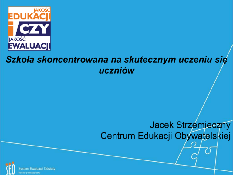 Szkoła skoncentrowana na skutecznym uczeniu się uczniów Jacek Strzemieczny Centrum Edukacji Obywatelskiej 1 Kluczowe pytanie Po co prowadzimy szkoły? Czy po to, by: • uczniowie z sukcesem zdawali kolejne egzaminy? • nadzór, rodzice, samorząd pozytywnie ocenili szkołę? • nauczyciele nauczali uczniów zgodnie z programem nauczania? • uczniowie zdobywali w szkole wartościową wiedzę i umiejętności (skutecznie się uczyli)? 2 Kluczowe pytanie Po co prowadzimy szkoły? Czy po to, by: • uczniowie z sukcesem zdawali kolejne egzaminy? • nadzór, rodzice, samorząd pozytywnie ocenili szkołę? • nauczyciele nauczali uczniów zgodnie z programem nauczania? • uczniowie zdobywali w szkole wartościową wiedzę i umiejętności (skutecznie się uczyli)? 3 Kompetencje kluczowe w celach kształcenia ogólnego*: 1 Przyswojenie przez uczniów określonego zasobu wiadomości na temat faktów, zasad, teorii i praktyk. 2 Zdobycie przez uczniów umiejętności wykorzystania posiadanych wiadomości podczas wykonywania zadań i rozwiązywania problemów. 3 Kształtowanie u uczniów postaw warunkujących sprawne i odpowiedzialne funkcjonowanie we współczesnym świecie. * Cele na III i IV etapie edukacyjnym - obowiązująca podstawa programowa 4 Umiejętności kluczowe w podstawie programowej Do najważniejszych umiejętności zdobywanych przez ucznia należą*: czytanie – umiejętność rozumienia, wykorzystywania i refleksyjnego przetwarzania tekstów, w tym tekstów kultury, prowadząca do osiągnięcia własnych celów, rozwoju osobowego oraz aktywnego uczestnictwa w życiu społeczeństwa; myślenie matematyczne – umiejętność wykorzystania narzędzi matematyki w życiu codziennym oraz formułowania sądów opartych na rozumowaniu matematycznym; umiejętność komunikowania się w języku ojczystym i w językach obcych, zarówno w mowie, jak i w piśmie; * obowiązująca podstawa programowa 5 Umiejętności kluczowe w podstawie (cd.) myślenie naukowe – umiejętność wykorzystania wiedzy o charakterze naukowym; umiejętność sprawnego posługiwania się nowoczesnymi technologiami informacyjno-komunikacyjnymi; umiejętność wyszukiwania, selekcjonowania i krytycznej analizy informacji; umiejętność rozpoznawania własnych potrzeb edukacyjnych oraz uczenia się; umiejętność pracy zespołowej. 6 Kształcenie umiejętności kluczowych stanowi wyzwanie dla każdego nauczyciela, każdej szkoły i całego systemu edukacyjnego. 7 Wyzwanie dla systemu edukacji Podstawowe wyzwanie współczesnej edukacji i zadanie dla systemu rozwoju szkół: • Rozwijanie kompetencji kluczowych • Powszechność kształcenia 8 Wstępne przygotowanie nauczycieli • dobre przygotowanie przedmiotowe • na ogół słabe przygotowanie w zakresie przedmiotowej metodyki nauczania • praktycznie żadne przygotowanie w zakresie wiedzy, jak ludzie się uczą • praktycznie żadne przygotowanie z organizacji nauczania w klasie • praktycznie żadne przygotowanie do szkolnej współpracy nauczycieli Studia nie przygotowały nas do bycia nauczycielami. 9 Potrzeba zmian na poziomie każdej szkoły i całego systemu szkolnego Szkoła to zespół nauczycieli wspólnie prowadzących proces nauczania i wychowania. Dlaczego ta definicja szkoły jest tak ważna? Nieadekwatne wstępne przygotowanie nauczycieli Ambitne cele programowe Zadanie, jakim jest nauczanie wszystkich uczniów Szkoła stanowi całość 10 Nalewanie wiedzy do głów uczniów W polskiej oświacie ciągle dominuje model nauczania, który opisuje metafora „nalewania wiedzy do głów uczniów”. 11 Wykorzystanie nauki o uczeniu się W ostatnim 20-leciu nastąpił rozwój nauki o uczeniu się (Learning Science, Cognitive Science), wykorzystującej dokonania: psychologii rozwojowej, psychologii poznawczej, neurologii, antropologii, lingwistyki. Z nauk tych wiemy, że sukces wszystkich uczniów w szkole jest możliwy. Sukces ten zależy od stosowania wiedzy o uczeniu się w projektowaniu systemu edukacyjnego, zarządzaniu pracą szkoły oraz w pracy każdego nauczyciela. 12 Wiedza buduje się w mózgu ucznia? Uczący się jest podmiotem procesu uczenia się. To nie nauczyciel „umieszcza” wiedzę w głowie ucznia. Im lepiej rozumiemy, jak uczeń się uczy, tym lepiej wiemy, jak tworzyć efektywne sytuacje edukacyjne. 13 Wnioski z nauk poznawczych Powiązania. Uczenie się polega na znajdowaniu powiązań między nową wiedzą i nowymi umiejętnościami a doświadczeniami, wiedzą i umiejętnościami już posiadanymi. Powstaje w ten sposób „model świata” – modele zjawisk, relacji i doświadczeń – o uporządkowanej, hierarchicznej strukturze. Uczenie się to rozbudowywanie w mózgu ucznia „modelu świata”, uzupełnianie w nim braków, korygowanie błędnych koncepcji, znajdowanie nowych powiązań. 14 Rozumienie Nowe doświadczenia oraz fakty przyswojone w trakcie uczenia się muszą zostać przetworzone przez mózg, czyli połączone z doświadczeniami, informacjami i wiedzą już posiadanymi. Rozumienie to znajdowanie powiązań między nowymi doświadczeniami i informacjami a doświadczeniami i strukturami wiedzy już „uwewnętrznionymi”. Rozumienie jest głębsze, gdy powiązań jest więcej i dotyczą one ważnych doświadczeń i centralnych koncepcji. 15 Uczymy się społecznie Proces uczenia się zachodzi w interakcji z innymi ludźmi. Uczymy się porozumiewając, słuchając innych i mówiąc do nich. Uczenie się wymaga obserwowania innych, interakcji, dyskusji, współpracy. Nieefektywny model: nauczyciel wykłada, uczeń zapamiętuje, nauczyciel sprawdza. 16 Raport McKinsey & Company Jak najlepiej doskonalone systemy szkolne na świecie stają się jeszcze lepsze. Jacek Strzemieczny Centrum Edukacji Obywatelskiej Kraków, 31 marca 2012 r. 17 McKinsey & Company - globalna firma doradcza Raporty na temat ważnych kwestii społecznych, w tym edukacji • Wrzesień 2007 - Jak najlepsze systemy szkolne na ś