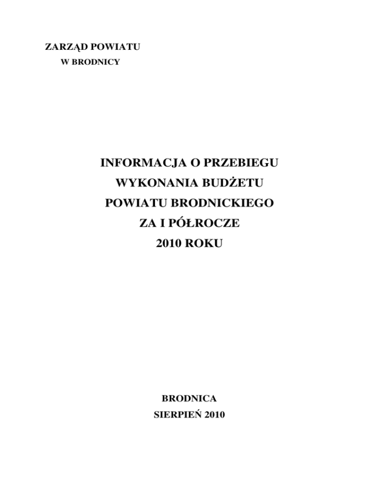 ZARZĄD POWIATU W BRODNICY INFORMACJA O PRZEBIEGU WYKONANIA BUDśETU POWIATU BRODNICKIEGO ZA I PÓŁROCZE 2010 ROKU BRODNICA SIERPIEŃ 2010 SPIS TREŚCI ………………………………………………………………………………………………… STRONY I. Wstęp ………………………………………………………………………………………………………………….7 II. Realizacja dochodów budŜetu powiatu …………………………………………………..9 III. Realizacja wydatków budŜetu powiatu ………………………………………………..42 IV. Rozliczenie dochodów i wydatków budŜetu powiatu ……………………...95 V. Planowane i wykonane przychody i rozchody powiatu …………………95 VI. Informacja dotycząca realizacji wydatków inwestycyjnych ………..96 VII. Informacja dotycząca realizacji wieloletniego planu inwestycyjnego ………………………………………………………………………………………………96 VIII. Informacja dotycząca wykonania programów i projektów realizowanych ze środków pochodzących z funduszy strukturalnych i Funduszu Spójności …………………………….97 IX. Informacja dotycząca wykonania zadań z zakresu administracji rządowej i innych zadań zleconych odrębnymi ustawami …………………………………………………………………………………97 X. Informacja dotycząca wykonania przychodów i wydatków gospodarstw pomocniczych ……………………………………………...98 1. Informacja dotycząca wykonania przychodów i wydatków PODGiK w Brodnicy …………………………………………………………….99 2. Informacja dotycząca wykonania przychodów i wydatków Zakładu Obsługi Starostwa i Utrzymania Dróg Powiatowych w Brodnicy …………………………………………………………………….………99 3. Informacja dotycząca wykonania przychodów i wydatków ZU KPPSP w Brodnicy ………………………………………….……..……101 4. Informacja dotycząca wykonania przychodów i wydatków ZAZ w Brodnicy ……………………………………………………….…….……102 XI. Informacja dotycząca wykonania dotacji celowych na zadania własne i zlecone powiatu realizowane przez podmioty naleŜące i nienaleŜące do sektora finansów publicznych ……………..103 XII. Informacja dotycząca wykonania dotacji podmiotowych na zadania własne powiatu realizowane przez podmioty nienaleŜące do sektora finansów publicznych ……...…………………………………………………..106 1 XIII. Informacja dotycząca realizacji przychodów i wydatków PFGZGiK ……………………………………………………………………………..108 XIV. Informacje dodatkowe ……………………………………………………………………………..109 XV. Podsumowanie………………..……………………………………………………………………………111 Załączniki …………………………………………………………………………………………………………………..112 2 ZAŁĄCZNIKI − Załącznik Nr 1 – Informacja z przebiegu wykonania budŜetu Powiatu Brodnickiego w I półroczu 2010 roku w porównaniu z planem oraz wykonaniem roku 2009 – Dochody − Załącznik Nr 2 – Informacja z przebiegu wykonania budŜetu Powiatu Brodnickiego w I półroczu 2010 roku w porównaniu z planem oraz wykonaniem roku 2009 – Wydatki − Załącznik Nr 3 – Rozliczenie dochodów i wydatków budŜetu powiatu w I pół. 2010 r. − Załącznik Nr 4 – Planowane i wykonane przychody i rozchody budŜetu powiatu w I pół. 2010 r. − Załącznik Nr 5 – Informacja dotycząca realizacji inwestycyjnych w I pół. 2010 r. planu wydatków − Załącznik Nr 5A – Wydatki na wieloletnie programy inwestycyjne w latach 2009 – 2012 (WPI) − Załącznik Nr 6 – Wydatki na programy i projekty realizowane ze środków pochodzących z funduszy strukturalnych i Funduszu Spójności w latach 2009 – 2011 − Załącznik Nr 7 – Informacja dotycząca wykonania zadań z zakresu administracji rządowej i innych zadań zleconych odrębnymi ustawami w I pół. 2010 r. − Załącznik Nr 8 – Wykonanie planu przychodów i wydatków gospodarstw pomocniczych w I pół. 2010 roku − Załącznik Nr 8A – Plan i wykonanie przychodów i wydatków Powiatowego Ośrodka Dokumentacji Geodezyjnej i Kartograficznej w Brodnicy w I pół. 2010 roku − Załącznik Nr 8B – Plan i wykonanie przychodów i wydatków Zakładu Obsługi Starostwa i Utrzymania Dróg Powiatowych w Brodnicy w I pół. 2010 roku − Załącznik Nr8C – Plan i wykonanie przychodów i wydatków Zakładu Usługowego Komendy Powiatowej Państwowej StraŜy PoŜarnej w Brodnicy w I pół. 2010 roku − Załącznik Nr8D – Plan i wykonanie przychodów i wydatków Zakładu Aktywności Zawodowej w Brodnicy w I pół. 2010 roku 3 − Załącznik Nr 9 – Dotacje celowe na zadania własne i zlecone powiatu realizowane przez podmioty naleŜące i nienaleŜące do sektora finansów publicznych w I pół. 2010 r. − Załącznik Nr 9A – Dotacje podmiotowe na zadania własne powiatu realizowane przez podmioty nienaleŜące do sektora finansów publicznych w I pół. 2010 r. − Załącznik Nr 10 Plan i wykonanie przychodów i wydatków PFGZGiK w I pół. 2010 roku – 4 WYKAZ TABEL − Tabela Nr 1. Wykonanie dochodów budŜetu Powiatu Brodnickiego w I pół. 2010 roku w porównaniu z planem i wykonaniem roku 2009 …………………………………………………………………………………36 − Tabela Nr 2. Wykonanie wydatków w I pół. roku 2010 (wg rodzajów) …...43 − Tabela Nr 3. Wykonanie wydatków w I pół. 2010 r. w poszczególnych działach …………………………………………………………
