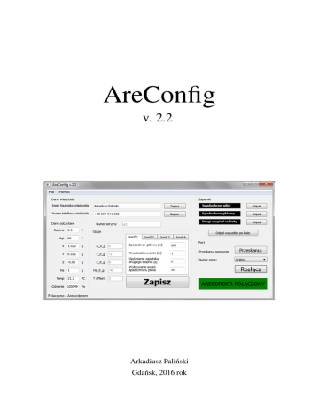 AreConfig v. 2.2 Arkadiusz Paliński Gdańsk, 2016 rok Spis treści 1. Wst˛ep . . . . . . . . . . . . . . . . . . . . . . . . . . . . . . . . . . . . . . . 2 2. Opis poszczególnych elementów programu . . . . . . . . . . . . . . . . . . 3 2.1. Menu główne . . . . . . . . . . . . . . . . . . . . . . . . . . . . . . . . 3 2.2. Dane właściciela . . . . . . . . . . . . . . . . . . . . . . . . . . . . . . 4 2.3. Numer seryjny . . . . . . . . . . . . . . . . . . . . . . . . . . . . . . . 4 2.4. Dane odczytane z Arecordera . . . . . . . . . . . . . . . . . . . . . . . 4 2.5. Pasek stanu . . . . . . . . . . . . . . . . . . . . . . . . . . . . . . . . . 4 2.6. Opcje . . . . . . . . . . . . . . . . . . . . . . . . . . . . . . . . . . . . 4 2.7. Połaczenie ˛ z Arecorderem . . . . . . . . . . . . . . . . . . . . . . . . . 5 2.8. Zapalniki . . . . . . . . . . . . . . . . . . . . . . . . . . . . . . . . . . 5 3. Opis działania . . . . . . . . . . . . . . . . . . . . . . . . . . . . . . . . . . 6 3.1. Podłaczenie ˛ Arecordera do komputera . . . . . . . . . . . . . . . . . . . 6 3.2. Programowanie i podglad ˛ parametrów . . . . . . . . . . . . . . . . . . . 6 3.3. Testowanie zapalników . . . . . . . . . . . . . . . . . . . . . . . . . . . 7 A. Historia zmian . . . . . . . . . . . . . . . . . . . . . . . . . . . . . . . . . . 9 1. Wst˛ep AreConfig jest programem pozwalajacym ˛ na zmian˛e opcji oraz kalibracj˛e rejestratora danych Arecorder. Program istnieje w dwóch wersjach - przeznaczonej dla użytkownika Arecordera oraz w wersji kalibracyjnej. Areconfig umożliwia: — zmian˛e wszystkich czterech zestawów konfiguracji - wysokości, na której ma zostać wyzwolony spadochron główny, wysokości wyrzutni, opóźnienie wyzwolenia drugiego stopnia rakiety i pr˛edkości opadania rakiety koniecznej do zadziałania awaryjnego wyzwalania spadochronu głównego lub jego wyłacza˛ nia, — przetestowanie wykrywania obecności oraz wyzwalania zapalników w kontrolowanych warunkach, — zmian˛e danych właściciela Arecordera, — odczyt pomiarów z akcelerometrów, czujnika ciśnienia, czujnika temperatury i napi˛ecia zasilana oraz wyliczany na ich podstawie kat ˛ pochylenia Arecordera do pionu, — kalibracj˛e akcelerometrów oraz czujnika temperatury (tylko wersja kalibracyjna), — zmian˛e numeru seryjnego Arecordera (tylko wersja kalibracyjna). 2. Opis poszczególnych elementów programu Rysunek 2.1. Opis poszczególnych elementów programu. 1. menu główne 2.1, 2. dane właściciela 2.2, 3. numer seryjny 2.3, 4. dane odczytane z Arecordera 2.4, 5. pasek stanu 2.5, 6. opcje 2.6, 7. połaczenie ˛ z Arecorderem 2.7, 8. zapalniki 2.8. 2.1. Menu główne Ponieważ w AreConfigu wszystko robi si˛e z poziomu aplikacji, w menu głównym nie ma wielu opcji. Rozwijajac ˛ menu Plik jest do wyboru jedynie opcja Zakończ, która kończy działanie programu. Rozwijajac ˛ menu Pomoc jest do wyboru opcja Pomoc, która wyświetla instrukcje jak połaczyć ˛ si˛e z Arecorderem oraz opcja O programie, która wyświetla informacje o programie AreConfig, jego wersji oraz adres mailowy do twórcy oprogramowania i adresy internetowe stron poświ˛econych Arecorderowi oraz AreConfigowi. ROZDZIAŁ 2. OPIS POSZCZEGÓLNYCH ELEMENTÓW PROGRAMU 2.2. Dane właściciela W sekcji Dane właściciela można zmienić imi˛e i nazwisko jak i numer telefonu właściciela Arecordera. Dane te zapisywane sa˛ na poczatku ˛ każdego pliku z pomiarami zapisywanymi przez Arecorder. W polu Imi˛e i Nazwisko właściciela nie można używać polskich znaków diakrytycznych. 2.3. Numer seryjny W tej sekcji wyświetlany jest numer seryjny danego egzemplarza Arecordera. 2.4. Dane odczytane z Arecordera W tej sekcji prezentowane sa˛ dane odczytane z Arecordera: — Bateria - napi˛ecie na baterii zasilajacej ˛ Arecorder (podczas konfiguracji Arecorder jest zasilany przez port USB komputera i bateria nie musi być do niego dołaczona ˛ - stad ˛ pomiar napi˛ecia 0 V na baterii), — Kat ˛ - kat ˛ pochylenia Arecordera do pionu, — X - składowa akcelerometru ± 24 g wzdłuż osi Arecordera, — Y - składowa akcelerometru ± 24 g skierowana na szerokość Arecordera, — Z - składowa akcelerometru ± 24 g skierowana z od górnej strony płytki Arecordera na dolna,˛ — Ha - składowa akcelerometru ± 80 g wzdłuż osi Arecordera, — Temp - temperatura, — Ciśnienie - ciśnienie atmosferyczne aktualnie mierzone przez czujnik ciśnienia. 2.5. Pasek stanu Pasek stanu prezentuje dodatkowe informacje na temat połaczenia ˛ z Arecorderem. 2.6. Opcje W tej sekcji można dokonać konfiguracji opcji wysokości, na której ma zostać wyzwolony spadochron główny, wysokości wyrzutni, opóźnienia wyzwolenia drugiego stopnia rakiety oraz pr˛edkości opadania rakiety koniecznej do zadziałania awaryjnego wyzwalania spadochronu głównego lub jego wyłaczania ˛ dla każdego zestawu konfiguracji. Zestawy konfiguracji można przełaczać ˛ zakładkami w tej sekcji. ROZDZIAŁ 2. OPIS POSZCZEGÓLNYCH ELEMENTÓW PROGRAMU Wersja kalibracyjna umożliwia także zmian˛e parametrów kalibracyjnych akcelerometrów i czujnika temperatury. Wersja dla użytkownika umożliwia jedynie podglad ˛ tych wartości. 2.7. Połaczenie ˛ z Arecorderem Sekcja połaczenia ˛ z Arecorderem. W tej sekcji znajduje si˛e przycisk Połacz/Rozł ˛ acz, ˛ przycisk do skanowania dost˛epnych na komputerze portów, lista portów, do których można si˛e połaczyć ˛ oraz etykieta wskazujaca ˛ aktualny stan połaczenia. ˛ 2.8. Zapalniki W tej sekcji można podejrzeć czy do któregoś ze złacz ˛ do podłaczenia ˛ zapalników podłaczony ˛ jest zapalnik. W tej sekcji znajduja˛ si˛e również przyciski do wyzwalania wybranego zapalnika oraz przycisk wyzwalajacy ˛ wszystkie zapalniki po kolei. UWAGA - Zapalniki sa˛ wyzwalane wyłacznie ˛ zasilaniem z baterii, zasilanie z portu USB komputera zasila pozostała˛ cz˛eść Arecordera. W celu 