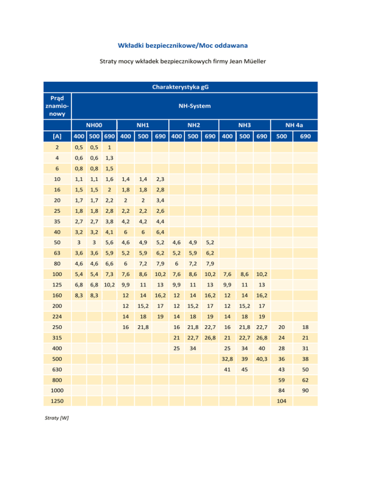 Wkładki bezpiecznikowe/Moc oddawana Straty mocy wkładek bezpiecznikowych firmy Jean Müeller Charakterystyka gG Prąd znamionowy NH-System NH00 [A] NH1 NH2 NH3 NH 4a 400 500 690 400 500 690 400 500 690 400 500 690 2 0,5 0,5 1 4 0,6 0,6 1,3 6 0,8 0,8 1,5 10 1,1 1,1 1,6 1,4 1,4 2,3 16 1,5 1,5 2 1,8 1,8 2,8 20 1,7 1,7 2,2 2 2 3,4 25 1,8 1,8 2,8 2,2 2,2 2,6 35 2,7 2,7 3,8 4,2 4,2 4,4 40 3,2 3,2 4,1 6 6 6,4 50 3 3 5,6 4,6 4,9 5,2 4,6 4,9 5,2 63 3,6 3,6 5,9 5,2 5,9 6,2 5,2 5,9 6,2 80 4,6 4,6 6,6 6 7,2 7,9 6 7,2 7,9 100 5,4 5,4 7,3 7,6 8,6 10,2 7,6 8,6 10,2 7,6 8,6 10,2 125 6,8 6,8 10,2 9,9 11 13 9,9 11 13 9,9 11 13 160 8,3 8,3 12 14 16,2 12 14 16,2 12 14 16,2 200 12 15,2 17 12 15,2 17 12 15,2 17 224 14 18 19 14 18 19 14 18 19 250 16 21,8 500 690 16 21,8 22,7 16 21,8 22,7 20 18 315 21 22,7 26,8 21 22,7 26,8 24 21 400 25 25 34 40 28 31 500 32,8 39 40,3 36 38 630 41 45 43 50 800 59 62 1000 84 90 1250 104 Straty [W] 34