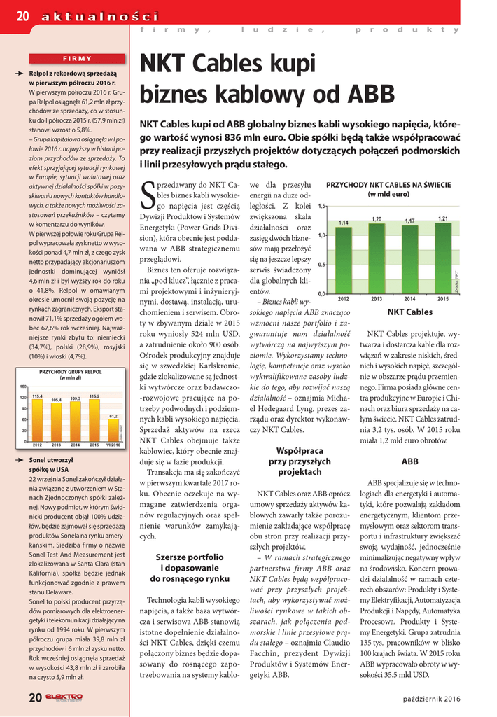 20 f FIRMY Relpol z rekordową sprzedażą w pierwszym półroczu 2016 r. W pierwszym półroczu 2016 r. Grupa Relpol osiągnęła 61,2 mln zł przychodów ze sprzedaży, co w stosunku do I półrocza 2015 r. (57,9 mln zł) stanowi wzrost o 5,8%. – Grupa kapitałowa osiągnęła w I połowie 2016 r. najwyższy w historii poziom przychodów ze sprzedaży. To efekt sprzyjającej sytuacji rynkowej w Europie, sytuacji walutowej oraz aktywnej działalności spółki w pozyskiwaniu nowych kontaktów handlowych, a także nowych możliwości zastosowań przekaźników – czytamy w komentarzu do wyników. W pierwszej połowie roku Grupa Relpol wypracowała zysk netto w wysokości ponad 4,7 mln zł, z czego zysk netto przypadający akcjonariuszom jednostki dominującej wyniósł 4,6 mln zł i był wyższy rok do roku o 41,8%. Relpol w omawianym okresie umocnił swoją pozycję na rynkach zagranicznych. Eksport stanowił 71,1% sprzedaży ogółem wobec 67,6% rok wcześniej. Najważniejsze rynki zbytu to: niemiecki (34,7%), polski (28,9%), rosyjski (10%) i włoski (4,7%). PRZYCHODY GRUPY RELPOL (w mln zł) Sonel utworzył spółkę w USA 22 września Sonel zakończył działania związane z utworzeniem w Stanach Zjednoczonych spółki zależnej. Nowy podmiot, w którym świdnicki producent objął 100% udziałów, będzie zajmował się sprzedażą produktów Sonela na rynku amerykańskim. Siedziba firmy o nazwie Sonel Test And Measurement jest zlokalizowana w Santa Clara (stan Kalifornia), spółka będzie jednak funkcjonować zgodnie z prawem stanu Delaware. Sonel to polski producent przyrządów pomiarowych dla elektroenergetyki i telekomunikacji działający na rynku od 1994 roku. W pierwszym półroczu grupa miała 39,8 mln zł przychodów i 6 mln zł zysku netto. Rok wcześniej osiągnęła sprzedaż w wysokości 43,8 mln zł i zarobiła na czysto 5,9 mln zł. 20 i r m y , l u d z i e , p r o d u k t y NKT Cables kupi biznes kablowy od ABB NKT Cables kupi od ABB globalny biznes kabli wysokiego napięcia, którego wartość wynosi 836 mln euro. Obie spółki będą także współpracować przy realizacji przyszłych projektów dotyczących połączeń podmorskich i linii przesyłowych prądu stałego. S przedawany do NKT Cables biznes kabli wysokiego napięcia jest częścią Dywizji Produktów i Systemów Energetyki (Power Grids Division), która obecnie jest poddawana w ABB strategicznemu przeglądowi. Biznes ten oferuje rozwiązania „pod klucz”, łącznie z pracami projektowymi i inżynieryjnymi, dostawą, instalacją, uruchomieniem i serwisem. Obroty w zbywanym dziale w 2015 roku wyniosły 524 mln USD, a zatrudnienie około 900 osób. Ośrodek produkcyjny znajduje się w szwedzkiej Karlskronie, gdzie zlokalizowane są jednostki wytwórcze oraz badawczo-rozwojowe pracujące na potrzeby podwodnych i podziemnych kabli wysokiego napięcia. Sprzedaż aktywów na rzecz NKT Cables obejmuje także kablowiec, który obecnie znajduje się w fazie produkcji. Transakcja ma się zakończyć w pierwszym kwartale 2017 roku. Obecnie oczekuje na wymagane zatwierdzenia organów regulacyjnych oraz spełnienie warunków zamykających. Szersze portfolio i dopasowanie do rosnącego rynku Technologia kabli wysokiego napięcia, a także baza wytwórcza i serwisowa ABB stanowią istotne dopełnienie działalności NKT Cables, dzięki czemu połączony biznes będzie dopasowany do rosnącego zapotrzebowania na systemy kablo- we dla przesyłu PRZYCHODY NKT CABLES NA ŚWIECIE (w mld euro) energii na duże odległości. Z kolei zwiększona skala działalności oraz zasięg dwóch biznesów mają przełożyć się na jeszcze lepszy serwis świadczony dla globalnych klientów. – Biznes kabli wysokiego napięcia ABB znacząco NKT Cables wzmocni nasze portfolio i zagwarantuje nam działalność NKT Cables projektuje, wywytwórczą na najwyższym po- twarza i dostarcza kable dla rozziomie. Wykorzystamy techno- wiązań w zakresie niskich, średlogię, kompetencje oraz wysoko nich i wysokich napięć, szczególwykwalifikowane zasoby ludz- nie w obszarze prądu przemienkie do tego, aby rozwijać naszą nego. Firma posiada główne cendziałalność – oznajmia Micha- tra produkcyjne w Europie i Chiel Hedegaard Lyng, prezes za- nach oraz biura sprzedaży na carządu oraz dyrektor wykonaw- łym świecie. NKT Cables zatrudczy NKT Cables. nia 3,2 tys. osób. W 2015 roku miała 1,2 mld euro obrotów. Współpraca przy przyszłych projektach NKT Cables oraz ABB oprócz umowy sprzedaży aktywów kablowych zawarły także porozumienie zakładające współpracę obu stron przy realizacji przyszłych projektów. – W ramach strategicznego partnerstwa firmy ABB oraz NKT Cables będą współpracować przy przyszłych projektach, aby wykorzystywać możliwości rynkowe w takich obszarach, jak połączenia podmorskie i linie przesyłowe prądu stałego – oznajmia Claudio Facchin, prezydent Dywizji Produktów i Systemów Energetyki ABB. ABB ABB specjalizuje się w technologiach dla energetyki i automatyki, które pozwalają zakładom energetycznym, klientom przemysłowym oraz sektorom transportu i infrastruktury zwiększać swoją wydajność, jednocześnie minimalizując negatywny wpływ na środowisko. Koncern prowadzi działalność w ramach czterech obszarów: Produkty i Systemy Elektryfikacji, Automatyzacja Produkcji i Napędy, Automatyka Procesowa, Produkty i Systemy Energetyki. Grupa zatrudnia 135 tys. pracowników w blisko 100 krajach świata. W 2015 roku ABB wypracowało obroty w wysokości 35,5 mld USD. październik 2016 21 f i r m y , l u d z i e , p r o d u k t y Rittal buduje nowoczesny zakład za 250 mln euro Rittal w niemieckim Haiger zbuduje supernowoczesną fabrykę obudów kompaktowych. Największa inwestycja w historii firmy pochłonie 250 mln euro i da zatrudnienie 290 osobom. Produkcja w zakładzie będzie opierać się na idei Przemysłu 4.0. N owa fabryka w Haiger rozpocznie działalność w 2018 roku. 