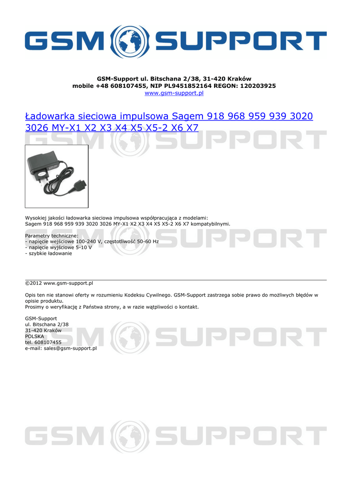 GSM-Support ul. Bitschana 2/38, 31-420 Kraków mobile +48 608107455, NIP PL9451852164 REGON: 120203925 www.gsm-support.pl Ładowarka sieciowa impulsowa Sagem 918 968 959 939 3020 3026 MY-X1 X2 X3 X4 X5 X5-2 X6 X7 Wysokiej jakości ładowarka sieciowa impulsowa współpracująca z modelami: Sagem 918 968 959 939 3020 3026 MY-X1 X2 X3 X4 X5 X5-2 X6 X7 kompatybilnymi. Parametry techniczne: - napięcie wejściowe 100-240 V, częstotliwość 50-60 Hz - napięcie wyjściowe 5-10 V - szybkie ładowanie ©2012 www.gsm-support.pl Opis ten nie stanowi oferty w rozumieniu Kodeksu Cywilnego. GSM-Support zastrzega sobie prawo do możliwych błędów w opisie produktu. Prosimy o weryfikację z Państwa strony, a w razie wątpliwości o kontakt. GSM-Support ul. Bitschana 2/38 31-420 Kraków POLSKA tel. 608107455 e-mail: [email protected] Powered by TCPDF (www.tcpdf.org)