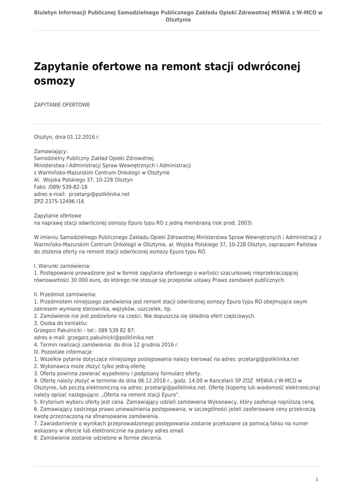 Biuletyn Informacji Publicznej Samodzielnego Publicznego Zakładu Opieki Zdrowotnej MSWiA z W-MCO w Olsztynie Zapytanie ofertowe na remont stacji odwróconej osmozy ZAPYTANIE OFERTOWE Olsztyn, dnia 01.12.2016 r. Zamawiający: Samodzielny Publiczny Zakład Opieki Zdrowotnej Ministerstwa i Administracji Spraw Wewnętrznych i Administracji z Warmińsko-Mazurskim Centrum Onkologii w Olsztynie Al. Wojska Polskiego 37, 10-228 Olsztyn Faks: /089/ 539-82-18 adres e-mail: [email protected] ZPZ-2375-12496 /16 Zapytanie ofertowe na naprawę stacji odwróconej osmozy Epuro typu RO z jedną membraną (rok prod. 2003) W imieniu Samodzielnego Publicznego Zakładu Opieki Zdrowotnej Ministerstwa Spraw Wewnętrznych i Administracji z Warmińsko-Mazurskim Centrum Onkologii w Olsztynie, al. Wojska Polskiego 37, 10-228 Olsztyn, zapraszam Państwa do złożenia oferty na remont stacji odwróconej osmozy Epuro typu RO. I. Warunki zamówienia: 1. Postępowanie prowadzone jest w formie zapytania ofertowego o wartości szacunkowej nieprzekraczającej równowartości 30 000 euro, do którego nie stosuje się przepisów ustawy Prawo zamówień publicznych. II. Przedmiot zamówienia: 1. Przedmiotem niniejszego zamówienia jest remont stacji odwróconej osmozy Epuro typu RO obejmująca swym zakresem wymianę sterownika, wężyków, uszczelek, itp. 2. Zamówienie nie jest podzielone na części. Nie dopuszcza się składnia ofert częściowych. 3. Osoba do kontaktu: Grzegorz Pakulnicki – tel.: 089 539 82 87; adres e-mail: [email protected] 4. Termin realizacji zamówienia: do dnia 12 grudnia 2016 r. III. Pozostałe informacje 1. Wszelkie pytanie dotyczące niniejszego postępowania należy kierować na adres: [email protected] 2. Wykonawca może złożyć tylko jedną ofertę. 3. Oferta powinna zawierać wypełniony i podpisany formularz oferty. 4. Ofertę należy złożyć w terminie do dnia 06.12.2016 r., godz. 14.00 w Kancelarii SP ZOZ MSWiA z W-MCO w Olsztynie, lub pocztą elektroniczną na adres: [email protected]. Ofertę (kopertę lub wiadomość elektroniczną) należy opisać następująco: „Oferta na remont stacji Epuro”. 5. Kryterium wyboru oferty jest cena. Zamawiający udzieli zamówienia Wykonawcy, który zaoferuje najniższą cenę. 6. Zamawiający zastrzega prawo unieważnienia postępowania, w szczególności jeżeli zaoferowane ceny przekroczą kwotę przeznaczoną na sfinansowanie zamówienia. 7. Zawiadomienie o wynikach przeprowadzonego postępowania zostanie przekazane za pomocą faksu na numer wskazany w ofercie lub elektronicznie na podany adres email. 8. Zamówienie zostanie udzielone w formie zlecenia. 1 Biuletyn Informacji Publicznej Samodzielnego Publicznego Zakładu Opieki Zdrowotnej MSWiA z W-MCO w Olsztynie Załącznik: 1) wzór formularza oferty, 2