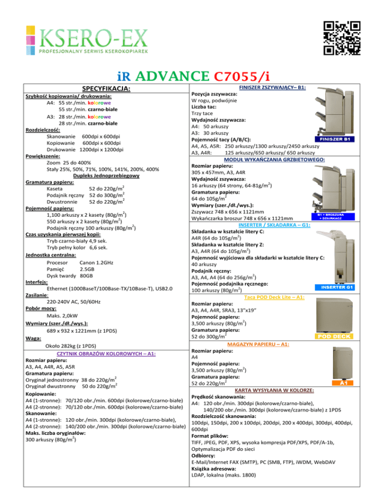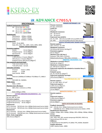 iR ADVANCE C7055/i FINISZER ZSZYWAJĄCY– B1: Pozycja zszywacza: Szybkość kopiowania/ drukowania: W rogu, podwójnie A4: 55 str./min. kolorowe Liczba tac: 55 str./min. czarno-białe Trzy tace A3: 28 str./min. kolorowe Wydajność zszywacza: 28 str./min. czarno-białe A4: 50 arkuszy Rozdzielczość: A3: 30 arkuszy Skanowanie 600dpi x 600dpi Pojemność tacy (A/B/C): Kopiowanie 600dpi x 600dpi A4, A5, A5R: 250 arkuszy/1300 arkuszy/2450 arkuszy Drukowanie 1200dpi x 1200dpi A3, A4R: 125 arkuszy/650 arkuszy/ 650 arkuszy Powiększenie: MODUŁ WYKAŃCZANIA GRZBIETOWEGO: Zoom 25 do 400% Rozmiar papieru: Stały 25%, 50%, 71%, 100%, 141%, 200%, 400% 305 x 457mm, A3, A4R Dupleks Jednoprzebiegowy Wydajność zszywacza: Gramatura papieru: 2 16 arkuszy (64 strony, 64-81g/m ) 2 Kaseta 52 do 220g/m Gramatura papieru: 2 Podajnik ręczny 52 do 300g/m 2 64 do 105g/m 2 Dwustronnie 52 do 220g/m Wymiary (szer./dł./wys.): Pojemność papieru: Zszywacz 748 x 656 x 1121mm 2 1,100 arkuszy x 2 kasety (80g/m ) Wykańczarka broszur 748 x 656 x 1121mm 2 550 arkuszy x 2 kasety (80g/m ) INSERTER / SKŁADARKA – G1: 2 Podajnik ręczny 100 arkuszy (80g/m ) Składanka w kształcie litery C: Czas uzyskania pierwszej kopii: 2 A4R (64 do 105g/m ) Tryb czarno-biały 4,9 sek. Składanka w kształcie litery Z: Tryb pełny kolor 6,6 sek. 2 A3, A4R (64 do 105g/m ) Jednostka centralna: Pojemność wyjściowa dla składarki w kształcie litery C: Procesor Canon 1.2GHz 40 arkuszy Pamięć 2.5GB Podajnik ręczny: 2 Dysk twardy 80GB A3, A4, A4 (64 do 256g/m ) Interfejs: Pojemność podajnika ręcznego: 2 Ethernet (1000BaseT/100Base-TX/10Base-T), USB2.0 100 arkuszy (80g/m ) Zasilanie: Taca POD Deck Lite – A1: 220-240V AC, 50/60Hz Rozmiar papieru: Pobór mocy: A3, A4, A4R, SRA3, 13”x19” Maks. 2,0kW Pojemność papieru: 2 Wymiary (szer./dł./wys.): 3,500 arkuszy (80g/m ) Gramatura papieru: 689 x 932 x 1221mm (z 1PDS) 2 52 do 300g/m Waga: MAGAZYN PAPIERU – A1: Około 282kg (z 1PDS) Rozmiar papieru: CZYTNIK OBRAZÓW KOLOROWYCH – A1: A4 Rozmiar papieru: Pojemność papieru: A3, A4, A4R, A5, A5R 2 3,500 arkuszy (80g/m ) Gramatura papieru: Gramatura papieru: 2 Oryginał jednostronny 38 do 220g/m 2 52 do 220g/m 2 Oryginał dwustronny 50 do 220g/m KARTA WYSYŁANIA W KOLORZE: Kopiowanie: Prędkość skanowania: A4 (1-stronne): 70/120 obr./min. 600dpi (kolorowe/czarno-białe) A4: 120 obr./min. 300dpi (kolorowe/czarno-białe), A4 (2-stronne): 70/120 obr./min. 600dpi (kolorowe/czarno-białe) 140/200 obr./min. 300dpi (kolorowe/czarno-białe) z 1PDS Skanowanie: Rozdzielczość skanowania: A4 (1-stronne): 120 obr./min. 300dpi (kolorowe/czarno-białe), 100dpi, 150dpi, 200 x 100dpi, 200dpi, 200 x 400dpi, 300dpi, 400dpi, A4 (2-stronne): 140/200 obr./min. 300dpi (kolorowe/czarno-białe) 600dpi Maks. liczba oryginałów: Format plików: 2 300 arkuszy (80g/m ) TIFF, JPEG, PDF, XPS, wysoka kompresja PDF/XPS, PDF/A-1b, Optymalizacja PDF do sieci Odbiorcy: E-Mail/Internet FAX (SMTP), PC (SMB, FTP), iWDM, WebDAV Książka adresowa: LDAP, lokalna (maks. 1800) SPECYFIKACJA: ZESTAW ZAAWANSOWANYCH FUNKCJI WYSYŁANIA – D1: Format plików: Format Outline PDF (funkcja Trace & Smooth), Przeszukiwalny PDF/XPS Reader Extensions PDF, Office Open XML ZESTAW FUNKCJI BEZPIECZŃSTWA WYSYŁANIA – D1: Format plików: Szyfrowany PDF, PDF/XPS z podpisem urządzenia KARTA DRUKOWANIA UFRII/PCL: Obsługiwane systemy operacyjne: Windows 2000/XP/Server2003/Vista/7/8 Mac OSX (10.4.9 lub późniejszy) PDL: UFRII, PCL5c/6, Adobe PostScript 3 Protokół sieciowy: TCP/IP (LPD/Port9100/IPP/IPPS/SMB/FTP), IPv6, IPX/SPX (NDS,Bindery), AppleTalk Sterownik skanera: Sieciowy sterownik TWAIN (75 do 600dpi 24bit kolor/8bit skala szarości /2 bit czarno-białe) Ksero-Ex Ul. Lewartowskiego 5 58-300 Wałbrzych Tel./Fax.: (74) 84 235 00 Tel. kom.: 604 529 186 Tel. kom.: 604 529 205 E-mail: [email protected]
