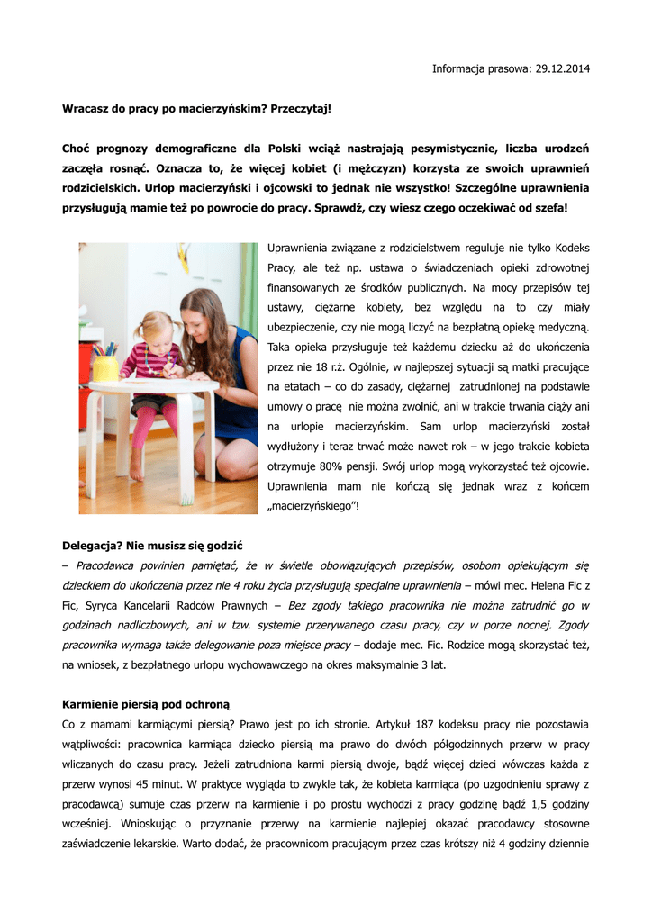 Informacja prasowa: 29.12.2014 Wracasz do pracy po macierzyńskim? Przeczytaj! Choć prognozy demograficzne dla Polski wciąż nastrajają pesymistycznie, liczba urodzeń zaczęła rosnąć. Oznacza to, że więcej kobiet (i mężczyzn) korzysta ze swoich uprawnień rodzicielskich. Urlop macierzyński i ojcowski to jednak nie wszystko! Szczególne uprawnienia przysługują mamie też po powrocie do pracy. Sprawdź, czy wiesz czego oczekiwać od szefa! Uprawnienia związane z rodzicielstwem reguluje nie tylko Kodeks Pracy, ale też np. ustawa o świadczeniach opieki zdrowotnej finansowanych ze środków publicznych. Na mocy przepisów tej ustawy, ciężarne kobiety, bez względu na to czy miały ubezpieczenie, czy nie mogą liczyć na bezpłatną opiekę medyczną. Taka opieka przysługuje też każdemu dziecku aż do ukończenia przez nie 18 r.ż. Ogólnie, w najlepszej sytuacji są matki pracujące na etatach – co do zasady, ciężarnej zatrudnionej na podstawie umowy o pracę nie można zwolnić, ani w trakcie trwania ciąży ani na urlopie macierzyńskim. Sam urlop macierzyński został wydłużony i teraz trwać może nawet rok – w jego trakcie kobieta otrzymuje 80% pensji. Swój urlop mogą wykorzystać też ojcowie. Uprawnienia mam nie kończą się jednak wraz z końcem „macierzyńskiego”! Delegacja? Nie musisz się godzić – Pracodawca powinien pamiętać, że w świetle obowiązujących przepisów, osobom opiekującym się dzieckiem do ukończenia przez nie 4 roku życia przysługują specjalne uprawnienia – mówi mec. Helena Fic z Fic, Syryca Kancelarii Radców Prawnych – Bez zgody takiego pracownika nie można zatrudnić go w godzinach nadliczbowych, ani w tzw. systemie przerywanego czasu pracy, czy w porze nocnej. Zgody pracownika wymaga także delegowanie poza miejsce pracy – dodaje mec. Fic. Rodzice mogą skorzystać też, na wniosek, z bezpłatnego urlopu wychowawczego na okres maksymalnie 3 lat. Karmienie piersią pod ochroną Co z mamami karmiącymi piersią? Prawo jest po ich stronie. Artykuł 187 kodeksu pracy nie pozostawia wątpliwości: pracownica karmiąca dziecko piersią ma prawo do dwóch półgodzinnych przerw w pracy wliczanych do czasu pracy. Jeżeli zatrudniona karmi piersią dwoje, bądź więcej dzieci wówczas każda z przerw wynosi 45 minut. W praktyce wygląda to zwykle tak, że kobieta karmiąca (po uzgodnieniu sprawy z pracodawcą) sumuje czas przerw na karmienie i po prostu wychodzi z pracy godzinę bądź 1,5 godziny wcześniej. Wnioskując o przyznanie przerwy na karmienie najlepiej okazać pracodawcy stosowne zaświadczenie lekarskie. Warto dodać, że pracownicom pracującym przez czas krótszy niż 4 godziny dziennie przerwy nie przysługują. Kobiety pracujące w wymiarze nieprzekraczającym 6 godzin, mogą liczyć na 1 przerwę. -Dystrybucja materiałów: Kinga Przybysz [email protected] kom./+48/ 519-181-900