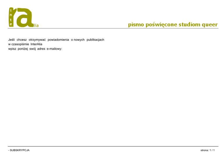 Jeśli chcesz otrzymywać powiadomienia o nowych publikacjach w czasopiśmie InterAlia wpisz poniżej swój adres e-mailowy: - SUBSKRYPCJA strona: 1 / 1