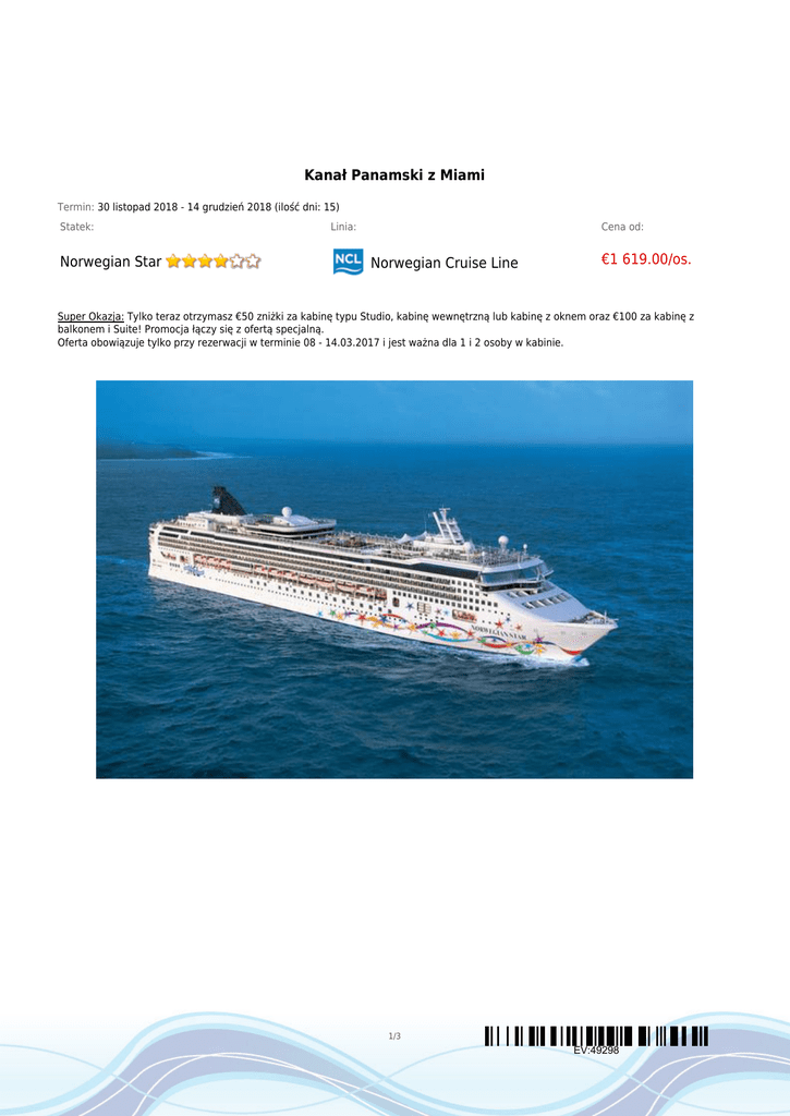 Kanał Panamski z Miami Termin: 30 listopad 2018 - 14 grudzień 2018 (ilość dni: 15) Statek: Norwegian Star Linia: Cena od: Norwegian Cruise Line €1 619.00/os. Super Okazja: Tylko teraz otrzymasz €50 zniżki za kabinę typu Studio, kabinę wewnętrzną lub kabinę z oknem oraz €100 za kabinę z balkonem i Suite! Promocja łączy się z ofertą specjalną. Oferta obowiązuje tylko przy rezerwacji w terminie 08 - 14.03.2017 i jest ważna dla 1 i 2 osoby w kabinie. 1/3 EV:49298 TRASA REJSU dzień 1 Data Port Wpłynięcie Wypłynięcie piątek 30.11.2018 Miami, Floryda --:-- 17:00 Stany Zjednoczone dzień 2 sobota 01.12.2018 Dzień na morzu --:-- --:-- dzień 3 niedziela 02.12.2018 Dzień na morzu --:-- --:-- dzień 4 poniedziałek 03.12.2018 Cartagena de Indias 08:00 14:00 wtorek 04.12.2018 Kanał Panamski --:-- --:-- dzień 6 środa 05.12.2018 Dzień na morzu --:-- --:-- dzień 7 czwartek 06.12.2018 Puntarenas 07:00 17:00 09:00 18:00 08:00 18:00 dzień 5 dzień 8 dzień 9 piątek 07.12.2018 Kolumbia Panama Kostaryka Corinto Nikaragua sobota 08.12.2018 Puerto Quetzal dzień 10 niedziela 09.12.2018 Dzień na morzu --:-- --:-- dzień 11 poniedziałek 10.12.2018 Acapulco 08:00 18:00 dzień 12 wtorek 11.12.2018 Dzień na morzu --:-- --:-- dzień 13 środa 12.12.2018 Cabo San Lucas 07:00 14:00 czwartek 13.12.2018 Dzień na morzu --:-- --:-- dzień 14 Gwatemala Meksyk Meksyk 2/3 EV:49298 Legenda dzień 15 Data Port Wpłynięcie Wypłynięcie piątek 14.12.2018 Los Angeles, Kalifornia 08:00 --:-- Legenda Stany Zjednoczone CENNIK Cena katalogowa Kabina wewnętrzna od €1 619.00 Kabina zewnętrzna z oknem od €2 109.00 Kabina zewnętrzna z balkonem od €2 759.00 Suite (apartament) od €3 249.00 Kabina jednoosobowa na zapytanie 3 i 4 osoba dorosła w kabinie na zapytanie dziecko od 2 do 17 lat jako 3 i 4 osoba w kabinie na zapytanie dziecko od 0 do 2 lat jako 3 i 4 osoba w kabinie na zapytanie Opłaty portowe Cena promocyjna w cenie Uwaga! Ceny za osobę w kabinie dwuosobowej. Cena zawiera: zakwaterowanie w kabinie wybranej kategorii; wyżywienie - 3 główne posiłki, przekąski między posiłkami, bufet lub przekąski o północy; napoje serwowane do śniadania i w bufetach samoobsługowych; serwis bagażowy podczas wejścia i zejścia ze statku; serwis kabinowy; korzystanie ze wszystkich urządzeń sportowo - rekreacyjnych znajdujących się na pokładzie statku (basen, jacuzzi, sala fitness, itp.); udział we wszystkich imprezach organizowanych na statku (przedstawienia w teatrze, koncerty, programy animacyjne itp.). Cena nie zawiera: kosztów dojazdu do portu; ewentualnych noclegów w hotelu przed/po rejsie i transferów; wycieczek fakultatywnych w trakcie rejsu; korzystania z barów, mini baru w kabinie oraz napojów zamawianych w restauracji; korzystania z punktów usługowych (fryzjer, pralnia, fotograf, salon piękności i odnowy biologicznej, internet) i wydatków osobistych; napiwków dla obsługi na statku (kwota uzależniona od długości rejsu); ubezpieczenia KL, NNW i bagaż, kosztów wiz (tam gdzie wymagane). 3/3 EV:49298