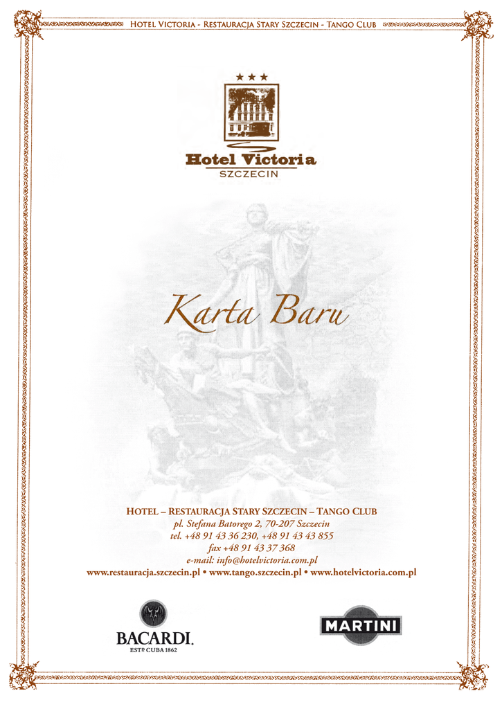 HOTEL – RESTAURACJA STARY SZCZECIN – TANGO CLUB pl. Stefana Batorego 2, 70-207 Szczecin tel. +48 91 43 36 230, +48 91 43 43 855 fax +48 91 43 37 368 e-mail: [email protected] www.restauracja.szczecin.pl • www.tango.szczecin.pl • www.hotelvictoria.com.pl Napoje zimne Softdrinks/Kalte Getranke 1. Coca–Cola .................................................... 0,2 l . .............................................................. 5 zł 2. Coca–Cola Light ...................................... 0,2 l . ............................................................... 5 zł 3. Fanta ................................................................. 0,2 l . ............................................................... 5 zł 4. Sprite . ............................................................... 0,2 l . ............................................................... 5 zł 5. Tonic .................................................................. 0,2 l . .............................................................. 5 zł 6. Woda mineralna gazowana .......... 0,3 l . ............................................................... 5 zł Mineralwater with gas/Mineralwasser mit Gas 7. Woda mineralna niegazowana... 0,3 l . ............................................................... 5 zł Mineral water without gas/Stilles Mineralwasser 8. Soki ...................................................................... 0,2 l . ............................................................... 4 zł pomarańczowy, grejpfrutowy, z czarnej porzeczki jabłkowy, pomidorowy, ananasowy Orangen juice/Orangen saft, Grapefruit juice/Grapefruitsaft Black currant juice/Saft von schwarzen Johannisbeeren Apple juice/Apfelsaft, Tomato juice/Tomatenssaft Pineapple juice/Ananassaft 9. Kawa mrożona z gałką lodów i bitą śmietaną ....................................... 13 zł Ice coffee with ice-cream knob and whipped carem Eiskaffe mit Eiskugel und Schlagsanne 10. Red Bull ........................................................... 0,2 l . ............................................................ 12 zł SZCZECIN, PL. STEFANA BATOREGO 2 www.tango.szczecin.pl • www.restauracja.szczecin.pl • www.hotelvictoria.com.pl Herbaty Tea/tee 1. Dilmah . ....................................................................................................................................... The single origin tea 100% Pure Ceylon 5 zł 2. Herbaty zielone ..................................................................................................................... 5 zł Green Tea Jasmine Green Tea 3. Herbaty czarne ...................................................................................................................... 5 zł Ceylon Supreme Tea Englisch Breakfast Tea Darjeeling Tea Earl Grey 4. Herbaty czarne aromatyczne .................................................................................... 5 zł Ginger Spice Tea Raspberry Tea Lemon Tea Vanilla Tea 5. Zioła ................................................................................................................................................ 5 zł Pure Pepermint Rosehip & Hibiscus Napoje gorące Hot Beverages/Heisse Getranke 1. Kawa ............................................................ 125 ml . .............................................................. 7 zł Coffee/Kaffee 2. Espresso ........................................................ 30 ml . .............................................................. 7 zł 3. Cappucino ............................................... 125 ml . .............................................................. 7 zł 4. Latte macchiato . ................................ 150 ml . ........................................................... 10 zł 5. Irish Coffee . ............................................ 175 ml . .......................................................... 24 zł Kawa z dodatkiem – 50ml Irish whisky Coffee with 50 ml Irish Whiski 6. Kawa z likierem ................................. 145 ml . ........................................................... 15 zł Coffee with liqueur/Kaffe mit Likor (Balley’s, Amaretto, Kahlua – 20 ml) 7. Gorąca czekolada ............................ 250 ml . .............................................................. 7 zł Hot chocolate/Heisse Schokolade SZCZECIN, PL. STEFANA BATOREGO 2 www.tango.szczecin.pl • www.restauracja.szczecin.pl • www.hotelvictoria.com.pl Piwo z beczki Barrelea beer/Bier vom Fass 1. Bosman Full . ............................................... 0,3 l . ............................................................... 6 zł Jasny/Hell 2. Bosman . ........................................................... 0,5 l . ............................................................... 8 zł Jasny/Hell Piwo butelkowe 1. Okocim Porter ........................................... 0,5 l . ............................................................ 12 zł 2. Okocim Pszeniczne . ............................ . 0,5 l . ............................................................ 12 zł 3. Bitburger Drive .................................... 0,33 l . ............................................................... 7 zł (bezalkoholowe/no alcohol/Alkoholfrei) 4. Żywiec ........................................................... 0,33 l . ............................................................... 6 zł 5. Heineken ..................................................... 0,33 l . ............................................................ 10 zł 6. Lech ................................................................. 0,33 l . ............................................................... 6 zł 7. Tyskie ............................................................. 0,33 l . ............................................................... 6 zł Dodatki do piwa 1. Paluszki ................................................