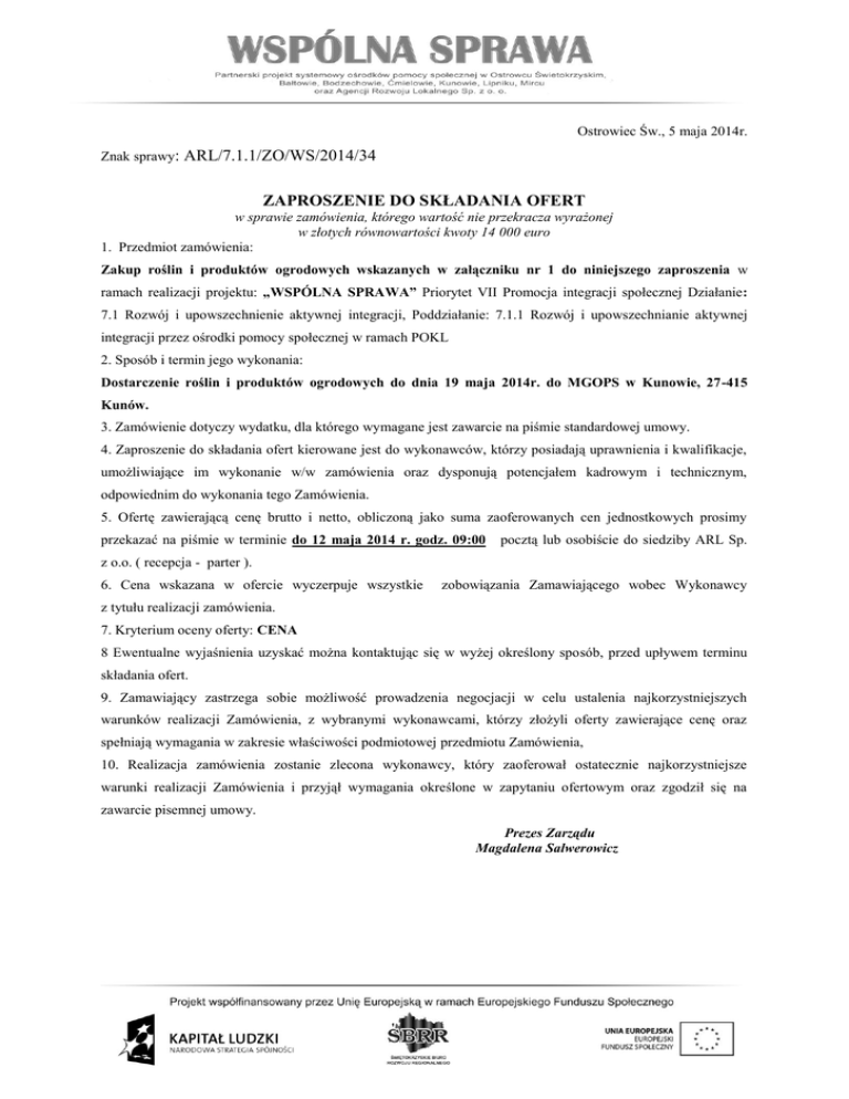 Ostrowiec Św., 5 maja 2014r. Znak sprawy: ARL/7.1.1/ZO/WS/2014/34 ZAPROSZENIE DO SKŁADANIA OFERT w sprawie zamówienia, którego wartość nie przekracza wyrażonej w złotych równowartości kwoty 14 000 euro 1. Przedmiot zamówienia: Zakup roślin i produktów ogrodowych wskazanych w załączniku nr 1 do niniejszego zaproszenia w ramach realizacji projektu: „WSPÓLNA SPRAWA” Priorytet VII Promocja integracji społecznej Działanie: 7.1 Rozwój i upowszechnienie aktywnej integracji, Poddziałanie: 7.1.1 Rozwój i upowszechnianie aktywnej integracji przez ośrodki pomocy społecznej w ramach POKL 2. Sposób i termin jego wykonania: Dostarczenie roślin i produktów ogrodowych do dnia 19 maja 2014r. do MGOPS w Kunowie, 27-415 Kunów. 3. Zamówienie dotyczy wydatku, dla którego wymagane jest zawarcie na piśmie standardowej umowy. 4. Zaproszenie do składania ofert kierowane jest do wykonawców, którzy posiadają uprawnienia i kwalifikacje, umożliwiające im wykonanie w/w zamówienia oraz dysponują potencjałem kadrowym i technicznym, odpowiednim do wykonania tego Zamówienia. 5. Ofertę zawierającą cenę brutto i netto, obliczoną jako suma zaoferowanych cen jednostkowych prosimy przekazać na piśmie w terminie do 12 maja 2014 r. godz. 09:00 pocztą lub osobiście do siedziby ARL Sp. z o.o. ( recepcja - parter ). 6. Cena wskazana w ofercie wyczerpuje wszystkie zobowiązania Zamawiającego wobec Wykonawcy z tytułu realizacji zamówienia. 7. Kryterium oceny oferty: CENA 8 Ewentualne wyjaśnienia uzyskać można kontaktując się w wyżej określony sposób, przed upływem terminu składania ofert. 9. Zamawiający zastrzega sobie możliwość prowadzenia negocjacji w celu ustalenia najkorzystniejszych warunków realizacji Zamówienia, z wybranymi wykonawcami, którzy złożyli oferty zawierające cenę oraz spełniają wymagania w zakresie właściwości podmiotowej przedmiotu Zamówienia, 10. Realizacja zamówienia zostanie zlecona wykonawcy, który zaoferował ostatecznie najkorzystniejsze warunki realizacji Zamówienia i przyjął wymagania określone w zapytaniu ofertowym oraz zgodził się na zawarcie pisemnej umowy. Prezes Zarządu Magdalena Salwerowicz Załącznik nr 1 Lp. NAZWA TOWARU Jednostka miary Orientacyjna ilość towaru 1. Lasix Kaempferi „Stiff Wepper” – szczep 1,5 m sztuk 6 2. Berberis thunbergi “ Pink sztuk 9 Qeen” 3. Pinus mugo var mughys sztuk 20 4. Heuchera mierantha „Purple Palace” sztuk 40 5. Spirea japonica „ Goldflame” sztuk 16 6. Juniperus horizontelis „Golden Carpet” sztuk 19 7. Festuca glauca sztuk 70 8. Miscanthus simensis „Zebriunus” sztuk 9 9. Żwir biały kg 6000 10. Kora (80 l ) worek 70 JEDNOSTKOWA CENA NETTO JEDNOSTKOWA CENA BRUTTO 11. Włóknina czarna metr 160 m2 12. Szpilki do włókniny sztuk 100 13. Nasiona trawy galonowej kg 5 14. Ziemia do roślin iglastych (50 l) worek 4 15. Ziemia do roślin uniwersalna (50 l) worek 4 16. Obrzeża trawnikowe sztuk 10 Oferowana cena łączna ( suma cen jednostkowych ) ww. produktów: Cena netto …………………………………………… Cena brutto ……………………………………………