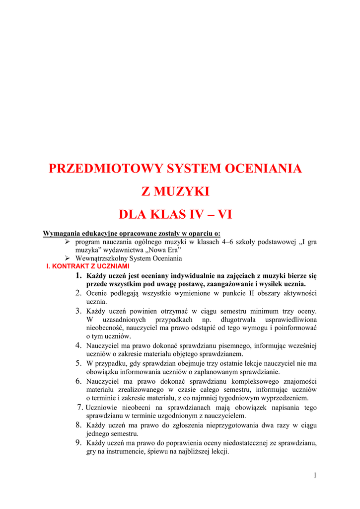 PRZEDMIOTOWY SYSTEM OCENIANIA Z MUZYKI DLA KLAS IV – VI Wymagania edukacyjne opracowane zostały w oparciu o: program nauczania ogólnego muzyki w klasach 4–6 szkoły podstawowej „I gra muzyka” wydawnictwa „Nowa Era” Wewnątrzszkolny System Oceniania I. KONTRAKT Z UCZNIAMI 1. Każdy uczeń jest oceniany indywidualnie na zajęciach z muzyki bierze się przede wszystkim pod uwagę postawę, zaangażowanie i wysiłek ucznia. 2. Ocenie podlegają wszystkie wymienione w punkcie II obszary aktywności ucznia. 3. Każdy uczeń powinien otrzymać w ciągu semestru minimum trzy oceny. W uzasadnionych przypadkach np. długotrwała usprawiedliwiona nieobecność, nauczyciel ma prawo odstąpić od tego wymogu i poinformować o tym uczniów. 4. Nauczyciel ma prawo dokonać sprawdzianu pisemnego, informując wcześniej uczniów o zakresie materiału objętego sprawdzianem. 5. W przypadku, gdy sprawdzian obejmuje trzy ostatnie lekcje nauczyciel nie ma obowiązku informowania uczniów o zaplanowanym sprawdzianie. 6. Nauczyciel ma prawo dokonać sprawdzianu kompleksowego znajomości materiału zrealizowanego w czasie całego semestru, informując uczniów o terminie i zakresie materiału, z co najmniej tygodniowym wyprzedzeniem. 7. Uczniowie nieobecni na sprawdzianach mają obowiązek napisania tego sprawdzianu w terminie uzgodnionym z nauczycielem. 8. Każdy uczeń ma prawo do zgłoszenia nieprzygotowania dwa razy w ciągu jednego semestru. 9. Każdy uczeń ma prawo do poprawienia oceny niedostatecznej ze sprawdzianu, gry na instrumencie, śpiewu na najbliższej lekcji. 1 10.Uczeń ma prawo poprawić proponowaną przez nauczyciela ocenę klasyfikacji rocznej z zajęć obowiązkowych i dodatkowych w ciągu 5 dni od powiadomienia go o tej ocenie. 11.Uczeń składa ustną prośbę o dodatkowe sprawdzenie jego wiedzy i umiejętności do nauczyciela, który ustala zakres, warunki, formę i termin poprawy. 12.Poprawa winna odbywać się w czasie zajęć lub po skończonych przez ucznia i nauczyciela zajęciach, a z jej efektami uczeń zapoznany następnego dnia. 13.Uczniowie mają prawo do dodatkowej oceny za wykonanie pracy nadobowiązkowej lub występy artystyczne. 11.Uczniowie mają obowiązek posiadania zeszytu w pięciolinię, który podlega ocenie cząstkowej. 12. Uczeń ma prawo: być nieprzygotowany do lekcji dwa razy w semestrze/ każde kolejne nieprzygotowanie to ocena niedostateczna; podjąć jednorazową próbę poprawy oceny niedostatecznej, jeżeli uzupełni braki, które tę ocenę spowodowały; poprawić niedostateczną ocenę /na semestr lub roczną/ uczeń przedstawia zeszyt przedmiotowy /uzupełniony/, zalicza wyznaczoną przez nauczyciela partię materiału w tym np. teksty piosenek. II.OBSZARY AKTYWNOSCI Na lekcjach muzyki oceniane są następujące obszary aktywności ucznia: 1. Ekspresja muzyczna: Śpiew, jako źródło przeżyć estetycznych Muzyczne ćwiczenia improwizacyjne, jako forma zaspokojenia potrzeby aktywności i pobudzania myślenia twórczego. 2. Rozwijanie wyobraźni i zdolności muzycznych: Kształcenie poczucia rytmu, uwrażliwienie na dynamikę, tempo i artykulację Rozwijanie słuchu wysokościowego, barwowego i harmonicznego 3. Kształcenie percepcji i estetycznych przeżyć muzycznych: Brzmienie i środki wykonawcze: głosy, instrumenty, zespoły Zasady tworzenia muzyki Treści i funkcje muzyki Odczucie stylu muzycznego III. POZIOM WYMAGAŃ Ocena wyników nauczania w przedmiocie muzyka jest szczególna ze względu na duże różnice uzdolnień uczniów. Uwzględniać należy realne osiągnięcia ucznia oraz jego postawę wobec stawianych zadań i pracę wkładaną w ich wykonanie. IV. NARZĘDZIA POMIARU Sprawdzian wiadomości – w zależności od potrzeb Odpowiedź ustna – może być jedna w semestrze Praca domowa – co najmniej jedna w semestrze. Aktywność ucznia na lekcji Aktywność ucznia pozalekcyjna V. KRYTERIA OCENY POSZCZEGÓLNYCH NARZĘDZI POMIARU 1. Ocena prac pisemnych: 0 – 33% materiału 34– 50 % materiału 51 – 69 % materiału 70 – 89 % materiału 90 – 95% materiału 1 2 3 4 5 2 96- 100% - materiału 6 2.Ocena odpowiedzi ustnych: Samodzielna odpowiedź ucznia bez dodatkowych podpowiedzi nauczyciela 5 Odpowiedź ucznia z minimalną pomocą nauczyciela 4 Odpowiedź ucznia z dużą pomocą nauczyciela 3 Odpowiedź fragmentaryczna z dużą pomocą nauczyciela 2 Całkowity brak odpowiedzi 1 3. Ocena pozostałych narzędzi pomiaru zależy od nauczyciela. VI. KRYTERIUM OCENIANIA Celujący Ocenę celującą może otrzymać uczeń, który: Posiada wiedzę i umiejętności wykraczające poza program nauczania przedmiotu w danej klasie. Samodzielnie i twórczo rozwija indywidualne uzdolnienia artystyczne Szczególnie aktywnie bierze udział w muzycznych konkursach szkolnych i międzyszkolnych, olimpiadach artystycznych, programach artystycznych prezentowanych w szkole i środowisku. Bardzo dobry Ocenę bardzo dobrą może uzyskać uczeń, który: Opanował pełny zakres wiedzy i umiejętności określonych w programie nauczania dla danej klasy Umiejętnie wykorzystuje posiadana wiedzę w ćwiczeniach praktycznych Wykazuje dużą aktywność na lekcjach i w różnych formach zajęć pozalekcyjnych Ocenę dobrą może otrzymać uczeń, który: Nie opanował w pełni wiadomości określonych w programie nauczania dla danej klasy Poprawnie wykorzystuje zdobyte wiadomości w ćwiczeniach praktycznych Bierze czynny udział w zajęciach lekcyjnych Ocenę dostateczną może otrzymać uczeń, który: Częściowo opanował wiadomości zawarte w programie nauczania w danej klasie Potrafi wykonać niektóre zadania z zakresu śpiewu i gry, tworzenia i percepcji przy pomocy nauczyciela Wykazuje małe zainteresowanie przedmiotem Ocenę dopuszczającą może otrzymać uczeń, który: Ma braki w opanowaniu minimum programowego, ale nie przekreślają one możliwości zdobywania wiedzy i umiejętności w dalszej edukacji Nie potrafi samodzielnie wykonać
