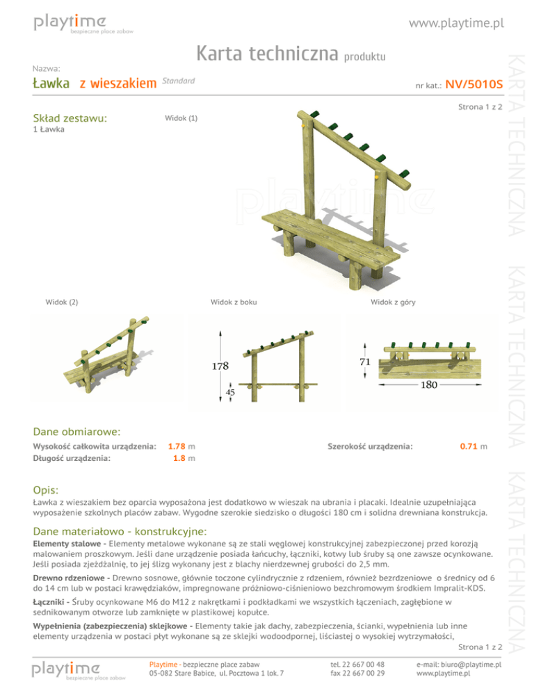 playtime www.playtime.pl bezpieczne place zabaw Ławka z wieszakiem Standard nr kat.: NV/5010S Strona 1 z 2 Skład zestawu: Widok (1) 1 Ławka Widok z boku Widok z góry Dane obmiarowe: Wysokość całkowita urządzenia: Długość urządzenia: 1.78 m 1.8 m Szerokość urządzenia: 0.71 m Ławka z wieszakiem bez oparcia wyposażona jest dodatkowo w wieszak na ubrania i placaki. Idealnie uzupełniająca wyposażenie szkolnych placów zabaw. Wygodne szerokie siedzisko o długości 180 cm i solidna drewniana konstrukcja. Dane materiałowo - konstrukcyjne: Elementy stalowe - Elementy metalowe wykonane są ze stali węglowej konstrukcyjnej zabezpieczonej przed korozją malowaniem proszkowym. Jeśli dane urządzenie posiada łańcuchy, łączniki, kotwy lub śruby są one zawsze ocynkowane. Jeśli posiada zjeżdżalnię, to jej ślizg wykonany jest z blachy nierdzewnej grubości do 2,5 mm. Drewno rdzeniowe - Drewno sosnowe, głównie toczone cylindrycznie z rdzeniem, również bezrdzeniowe o średnicy od 6 do 14 cm lub w postaci krawędziaków, impregnowane próżniowo-ciśnieniowo bezchromowym środkiem Impralit-KDS. Łączniki - Śruby ocynkowane M6 do M12 z nakrętkami i podkładkami we wszystkich łączeniach, zagłębione w sednikowanym otworze lub zamknięte w plastikowej kopułce. Wypełnienia (zabezpieczenia) sklejkowe - Elementy takie jak dachy, zabezpieczenia, ścianki, wypełnienia lub inne elementy urządzenia w postaci płyt wykonane są ze sklejki wodoodpornej, liściastej o wysokiej wytrzymałości, Strona 1 z 2 playtime bezpieczne place zabaw Playtime - bezpieczne place zabaw 05-082 Stare Babice, ul. Pocztowa 1 lok. 7 tel. 22 667 00 48 fax 22 667 00 29 e-mail: [email protected] www.playtime.pl KARTA TECHNICZNA Opis: KARTA TECHNICZNA Widok (2) KARTA TECHNICZNA Karta techniczna produktu Nazwa: playtime www.playtime.pl bezpieczne place zabaw Ławka z wieszakiem Standard nr kat.: NV/5010S Strona 2 z 2 laminowanej filmem melaminowym i malowanej na eliptycznych krawędziach farbami na bazie naturalnych wosków. KARTA TECHNICZNA Karta techniczna produktu Nazwa: KARTA TECHNICZNA playtime bezpieczne place zabaw Powered by TCPDF (www.tcpdf.org) Playtime - bezpieczne place zabaw 05-082 Stare Babice, ul. Pocztowa 1 lok. 7 tel. 22 667 00 48 fax 22 667 00 29 e-mail: [email protected] www.playtime.pl KARTA TECHNICZNA Strona 2 z 2