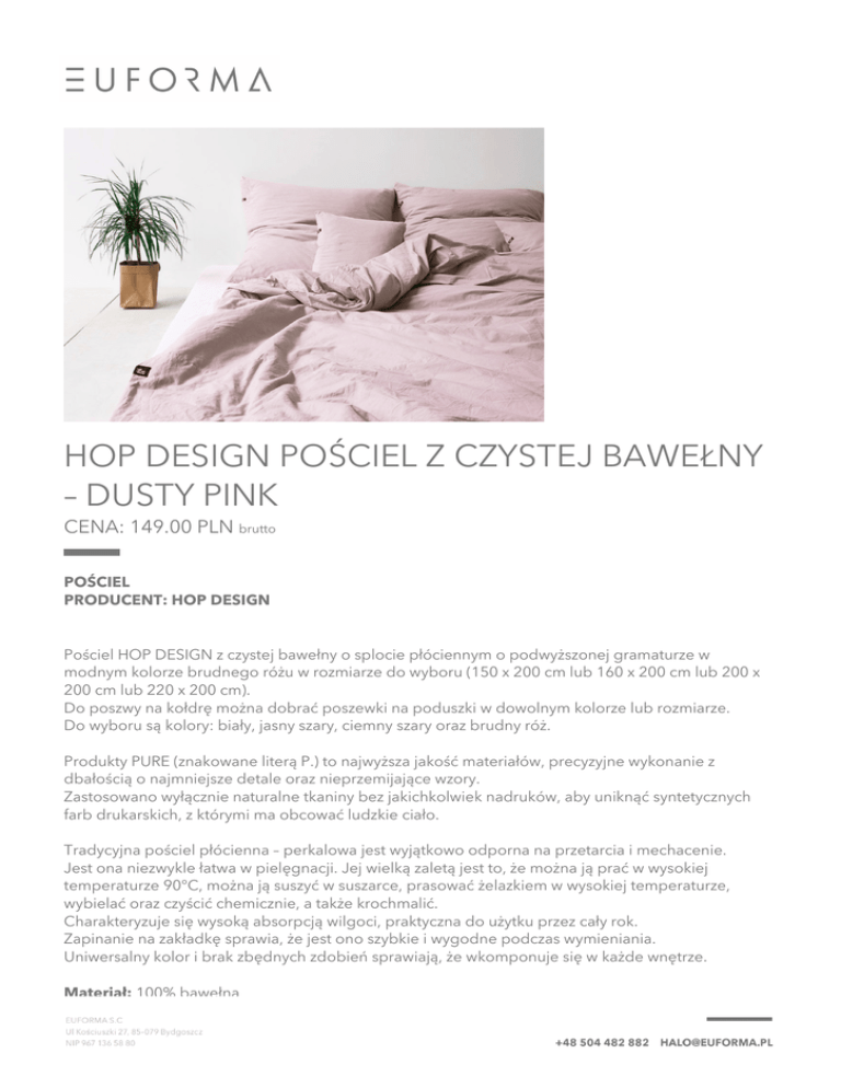HOP DESIGN POŚCIEL Z CZYSTEJ BAWEŁNY – DUSTY PINK CENA: 149.00 PLN brutto POŚCIEL PRODUCENT: HOP DESIGN Pościel HOP DESIGN z czystej bawełny o splocie płóciennym o podwyższonej gramaturze w modnym kolorze brudnego różu w rozmiarze do wyboru (150 x 200 cm lub 160 x 200 cm lub 200 x 200 cm lub 220 x 200 cm). Do poszwy na kołdrę można dobrać poszewki na poduszki w dowolnym kolorze lub rozmiarze. Do wyboru są kolory: biały, jasny szary, ciemny szary oraz brudny róż. Produkty PURE (znakowane literą P.) to najwyższa jakość materiałów, precyzyjne wykonanie z dbałością o najmniejsze detale oraz nieprzemijające wzory. Zastosowano wyłącznie naturalne tkaniny bez jakichkolwiek nadruków, aby uniknąć syntetycznych farb drukarskich, z którymi ma obcować ludzkie ciało. Tradycyjna pościel płócienna – perkalowa jest wyjątkowo odporna na przetarcia i mechacenie. Jest ona niezwykle łatwa w pielęgnacji. Jej wielką zaletą jest to, że można ją prać w wysokiej temperaturze 90°C, można ją suszyć w suszarce, prasować żelazkiem w wysokiej temperaturze, wybielać oraz czyścić chemicznie, a także krochmalić. Charakteryzuje się wysoką absorpcją wilgoci, praktyczna do użytku przez cały rok. Zapinanie na zakładkę sprawia, że jest ono szybkie i wygodne podczas wymieniania. Uniwersalny kolor i brak zbędnych zdobień sprawiają, że wkomponuje się w każde wnętrze. Materiał: 100% bawełna Splot: płócienny Gramatura: 140g/m2 Zawartość:1 x poszwa na kołdrę w rozmiarze do wyboru (150 x 200 cm, 160 x 200 cm lub 200 x 200 cm lub 220 x 200 cm) Do pościeli można dobrać dwie poszewki w dowolnym kolorze i dowolnym rozmiarze w promocyjnej cenie 10 zł za dwie sztuki. Kraj produkcji: Polska Gwarancja: 2 lata Czas oczekiwania: ok 4-5 dni Powered by TCPDF (www.tcpdf.org)