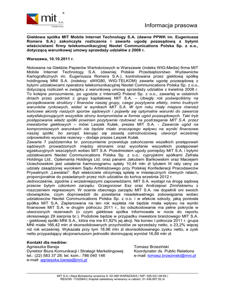 Informacja prasowa Giełdowa spółka MIT Mobile Internet Technology S.A. (dawne PPWK im. Eugeniusza Romera S.A.) zakończyła rozliczenia i zawarła ugodę pozasądową z byłymi właścicielami firmy telekomunikacyjnej Neotel Communications Polska Sp. z o.o., dotyczącą warunkowej umowy sprzedaży udziałów z 2008 r. Warszawa, 10.10.2011 r. Notowana na Giełdzie Papierów Wartościowych w Warszawie (indeks WIG-Media) firma MIT Mobile Internet Technology S.A. (dawniej Polskie Przedsiębiorstwo Wydawnictw Kartograficznych im. Eugeniusza Romera S.A.), kontrolowana przez giełdową spółkę holdingową MNI S.A. (indeksy: sWIG80, WIG-TELKOM) zawarła ugodę pozasądową z byłymi udziałowcami operatora telekomunikacyjnej Neotel Communications Polska Sp. z o.o., dotyczącą rozliczeń w związku z warunkową umową sprzedaży udziałów z kwietnia 2008 r. To kolejne porozumienie, po ugodzie z InternetQ Poland Sp. z o.o., zawartej w ostatnich dniach przez podmiot z grupy kapitałowej MIT S.A. – Ubiegły rok poświęciliśmy na porządkowanie struktury i finansów naszej grupy, czego pozytywne efekty, mimo trudnych warunków rynkowych, widać w wynikach MIT S.A. W tym roku miały miejsce również końcowe akordy naszych sporów sądowych i pojawiły się optymalne warunki do zawarcia satysfakcjonujących wszystkie strony kompromisów w formie ugód pozasądowych. Taki tryb postępowania władz spółki powinien pozytywnie rzutować na postrzeganie MIT S.A. przez inwestorów giełdowych – mówi Leszek Kułak, prezes MIT S.A. - Zawarcie ugód na kompromisowych warunkach nie będzie miało znaczącego wpływu na wyniki finansowe naszej spółki, bo zarząd, kierując się zasadą ostrożnościową, utworzył wcześniej odpowiednio wysokie rezerwy – dodaje prezes Leszek Kułak. Zawarte 7 października br. porozumienie przewiduje zakończenie wszelkich postępowań sądowych prowadzonych między stronami oraz wycofanie wszystkich postępowań egzekucyjnych wszczętych wobec MIT S.A. Przedmiotem ugody pomiędzy MIT S.A. i byłymi udziałowcami Neotel Communications Polska Sp. z o.o.: cypryjskimi spółkami Zefrala Holdings Ltd., Oplemanta Holdings Ltd. oraz panami Jakubem Bańkowskim oraz Maciejem Uciechowskim jest ustalenie harmonogramu spłaty 10,44 mln zł tytułem III raty ceny za udziały zasądzonej wyrokiem Sądu Arbitrażowego przy Polskiej Konfederacji Pracodawców Prywatnych „Lewiatan”. Byli właściciele otrzymają spłatę w miesięcznych równych ratach, proporcjonalnie do posiadanych przez nich udziałów do końca września 2012 r. Jednocześnie, zgodnie z wcześniejszymi zapowiedziami, MIT S.A. wystąpi na drogę sądową przeciw byłym członkom zarządu: Grzegorzowi Esz oraz Andrzejowi Zimińskiemu z roszczeniem regresowym. W ocenie obecnego zarządu MIT S.A. nie dopełnili oni swoich obowiązków, czym doprowadzili do powstania nieadekwatnego zobowiązania wobec udziałowców Neotel Communications Polska Sp. z o.o. i w efekcie szkody, jaką poniosła spółka MIT S.A. Zaplanowana na ten rok wypłata nie będzie miała wpływu na wyniki finansowe MIT S.A. w drugim półroczu 2011 r., bo odszkodowanie ma pełne pokrycie w utworzonych rezerwach (o czym giełdowa spółka informowała w nocie do raportu okresowego 29 sierpnia br.). Podobnie będzie w przypadku inwestora branżowego MIT S.A. - giełdowej spółki MNI S.A., która ma ma 61,82% jej akcji. Na koniec I półrocza 2011 r. grupa MNI miała 166,42 mln zł skonsolidowanych przychodów ze sprzedaży netto, o 23,2% więcej niż rok wcześniej. Wykazała przy tym 18,96 mln zł skonsolidowanego zysku netto, a zysk netto przypadający akcjonariuszom jednostki dominującej wyniósł 16,89 mln zł. Kontakt dla mediów: Agnieszka Bareja Dyrektor Biura Komunikacji i Strategii Marketingowej tel.: (22) 583 37 28; tel. kom.: 786 040 146 e-mail: [email protected] Tomasz Brzeziński Koordynator ds. Public Relations e-mail: [email protected] MIT S.A | Aleja Bohaterów września 9, 02-389 WARSZAWA | NIP: 526-021-09-84 | REGON: 11525843 | Kapitał zakładowy wniesiony w całości: 51.436.957,52 zł