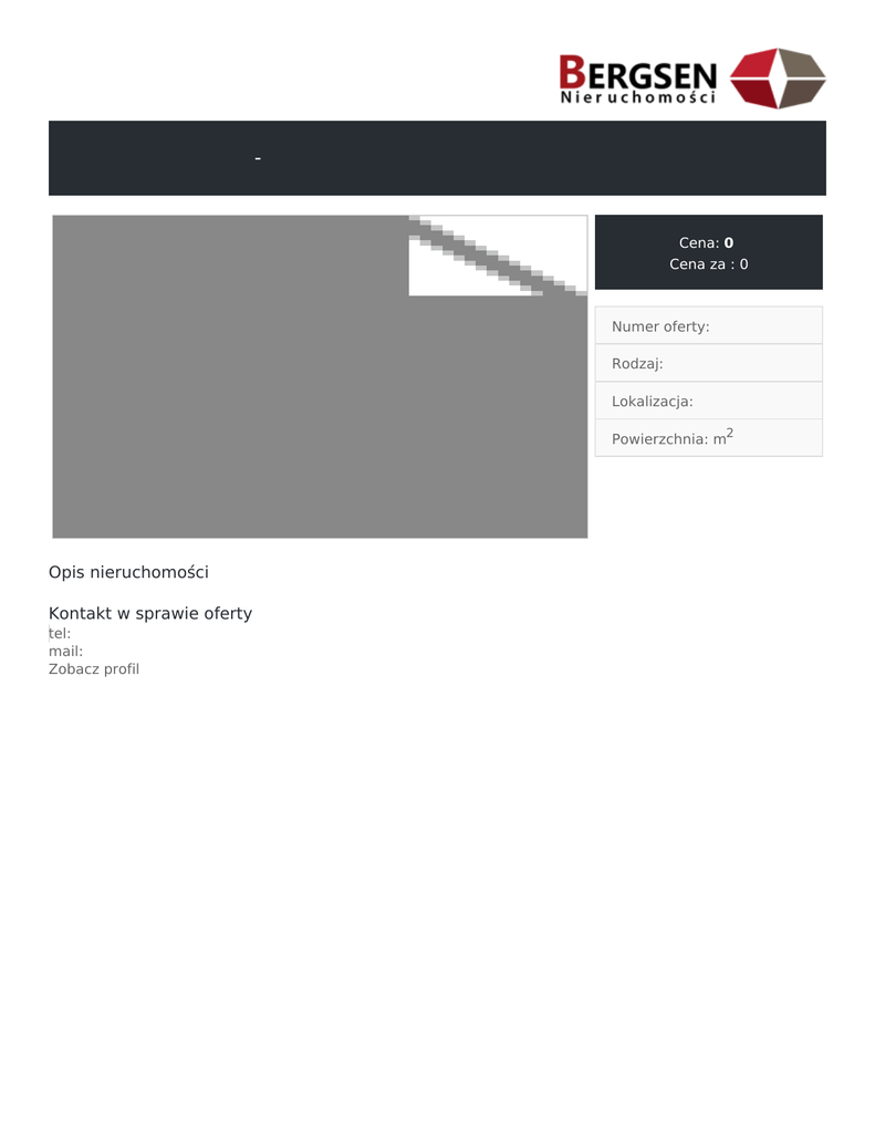 - Cena: 0 Cena za : 0 Numer oferty: Rodzaj: Lokalizacja: Powierzchnia: m2 Opis nieruchomości Kontakt w sprawie oferty tel: mail: Zobacz profil