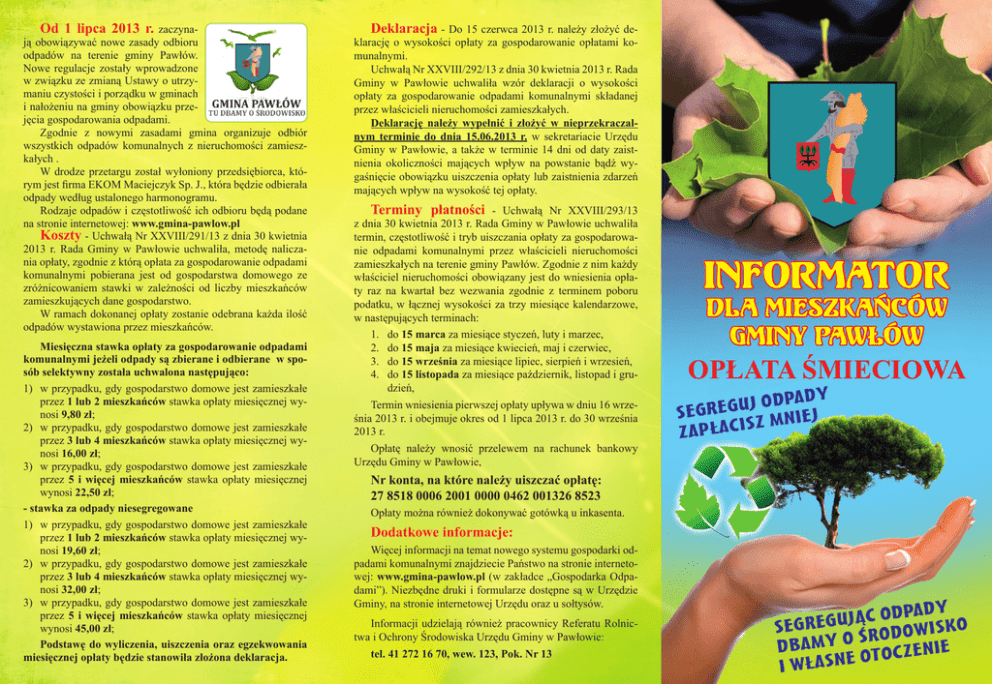 Od 1 lipca 2013 r. zaczynają obowiązywać nowe zasady odbioru odpadów na terenie gminy Pawłów. Nowe regulacje zostały wprowadzone w związku ze zmianą Ustawy o utrzymaniu czystości i porządku w gminach i nałożeniu na gminy obowiązku przejęcia gospodarowania odpadami. Zgodnie z nowymi zasadami gmina organizuje odbiór wszystkich odpadów komunalnych z nieruchomości zamieszkałych . W drodze przetargu został wyłoniony przedsiębiorca, którym jest firma EKOM Maciejczyk Sp. J., która będzie odbierała odpady według ustalonego harmonogramu. Rodzaje odpadów i częstotliwość ich odbioru będą podane na stronie internetowej: www.gmina-pawlow.pl Koszty - Uchwałą Nr XXVIII/291/13 z dnia 30 kwietnia 2013 r. Rada Gminy w Pawłowie uchwaliła, metodę naliczania opłaty, zgodnie z którą opłata za gospodarowanie odpadami komunalnymi pobierana jest od gospodarstwa domowego ze zróżnicowaniem stawki w zależności od liczby mieszkańców zamieszkujących dane gospodarstwo. W ramach dokonanej opłaty zostanie odebrana każda ilość odpadów wystawiona przez mieszkańców. Miesięczna stawka opłaty za gospodarowanie odpadami komunalnymi jeżeli odpady są zbierane i odbierane w sposób selektywny została uchwalona następująco: 1) w przypadku, gdy gospodarstwo domowe jest zamieszkałe przez 1 lub 2 mieszkańców stawka opłaty miesięcznej wynosi 9,80 zł; 2) w przypadku, gdy gospodarstwo domowe jest zamieszkałe przez 3 lub 4 mieszkańców stawka opłaty miesięcznej wynosi 16,00 zł; 3) w przypadku, gdy gospodarstwo domowe jest zamieszkałe przez 5 i więcej mieszkańców stawka opłaty miesięcznej wynosi 22,50 zł; - stawka za odpady niesegregowane 1) w przypadku, gdy gospodarstwo domowe jest zamieszkałe przez 1 lub 2 mieszkańców stawka opłaty miesięcznej wynosi 19,60 zł; 2) w przypadku, gdy gospodarstwo domowe jest zamieszkałe przez 3 lub 4 mieszkańców stawka opłaty miesięcznej wynosi 32,00 zł; 3) w przypadku, gdy gospodarstwo domowe jest zamieszkałe przez 5 i więcej mieszkańców stawka opłaty miesięcznej wynosi 45,00 zł; Podstawę do wyliczenia, uiszczenia oraz egzekwowania miesięcznej opłaty będzie stanowiła złożona deklaracja. Deklaracja - Do 15 czerwca 2013 r. należy złożyć deklarację o wysokości opłaty za gospodarowanie opłatami komunalnymi. Uchwałą Nr XXVIII/292/13 z dnia 30 kwietnia 2013 r. Rada Gminy w Pawłowie uchwaliła wzór deklaracji o wysokości opłaty za gospodarowanie odpadami komunalnymi składanej przez właścicieli nieruchomości zamieszkałych. Deklarację należy wypełnić i złożyć w nieprzekraczalnym terminie do dnia 15.06.2013 r. w sekretariacie Urzędu Gminy w Pawłowie, a także w terminie 14 dni od daty zaistnienia okoliczności mających wpływ na powstanie bądź wygaśnięcie obowiązku uiszczenia opłaty lub zaistnienia zdarzeń mających wpływ na wysokość tej opłaty. Terminy płatności - Uchwałą Nr XXVIII/293/13 z dnia 30 kwietnia 2013 r. Rada Gminy w Pawłowie uchwaliła termin, częstotliwość i tryb uiszczania opłaty za gospodarowanie odpadami komunalnymi przez właścicieli nieruchomości zamieszkałych na terenie gminy Pawłów. Zgodnie z nim każdy właściciel nieruchomości obowiązany jest do wniesienia opłaty raz na kwartał bez wezwania zgodnie z terminem poboru podatku, w łącznej wysokości za trzy miesiące kalendarzowe, w następujących terminach: 1. do 15 marca za miesiące styczeń, luty i marzec, 2. do 15 maja za miesiące kwiecień, maj i czerwiec, 3. do 15 września za miesiące lipiec, sierpień i wrzesień, 4. do 15 listopada za miesiące październik, listopad i grudzień, Termin wniesienia pierwszej opłaty upływa w dniu 16 września 2013 r. i obejmuje okres od 1 lipca 2013 r. do 30 września 2013 r. Opłatę należy wnosić przelewem na rachunek bankowy Urzędu Gminy w Pawłowie, Nr konta, na które należy uiszczać opłatę: 27 8518 0006 2001 0000 0462 001326 8523 Opłaty można również dokonywać gotówką u inkasenta. Dodatkowe informacje: Więcej informacji na temat nowego systemu gospodarki odpadami komunalnymi znajdziecie Państwo na stronie internetowej: www.gmina-pawlow.pl (w zakładce „Gospodarka Odpadami”). Niezbędne druki i formularze dostępne są w Urzędzie Gminy, na stronie internetowej Urzędu oraz u sołtysów. Informacji udzielają również pracownicy Referatu Rolnictwa i Ochrony Środowiska Urzędu Gminy w Pawłowie: tel. 41 272 16 70, wew. 123, Pok. Nr 13 INFORMATOR DLA MIESZKAŃCÓW GMINY PAWŁÓW OPŁATA ŚMIECIOWA PAPIER/TEKTURA/ OPAKOWANIA WIELOMATERIAŁOWE WOREK NIEBIESKI WOREK ŻÓŁTY ODBIÓR RAZ W MIESIĄCU ODBIÓR RAZ W MIESIĄCU WRZUCAJ • gazety, czasopisma, ulotki • książki, zeszyty • torebki papierowe • pudła z tektury • inne opakowania tekturowe • kartony po napojach i mleku WRZUCAJ PAPIER TEKTURA • plastikowe butelki po napojach METAL (tzw. PET) • plastikowe pojemniki po napoPLASTIK jach i produktach • butelki i pojemniki po kosmetykach, chemii gospodarczej • folie i torebki plastikowe oraz folie aluminiowe • puszki po napojach, konserwach • metalowe nakrętki i kapsle i inny złom PAMIĘTAJ!!! Zanim wrzucisz do worka usuń części, które nie są z papieru: zszywki, spinacze, resztki taśmy klejącej; usuń resztki produktów z opakowań papierowych; kartony, torebki złóż na płasko lub wypełnij papierem PAMIĘTAJ!!! Zanim wrzucisz do worka opróżnij z zawartości, umyj i zgnieć przedmioty przed wrzuceniem NIE WRZUCAJ ! NIE WRZUCAJ ! • papieru zabrudzonego, zatłuszczonego • papieru powlekanego folią i woskowanego • papierów higienicznych ODPADY ZMIESZANE POJEMNIK ODBIÓR RAZ W MIESIĄCU WRZUCAMY ! • artykuły higieniczne (patyczki higieniczne, pieluchy dziecięce itp. ) • ścinki tapet i wykładzin podłogowych • porcelana, płytki ceramiczne, potłuczone szyby • worki z odkurzacza, • guma • szczoteczki do zębów, zabawki • negatywy fotograficzne, zdjęcia 