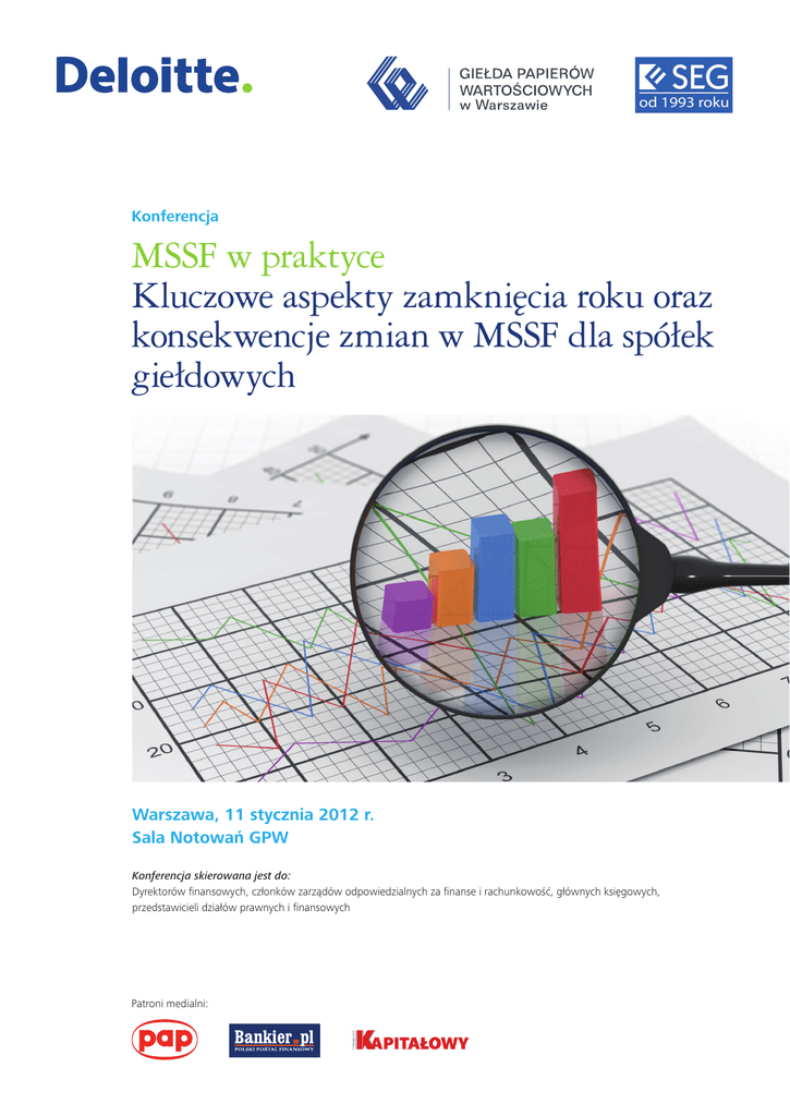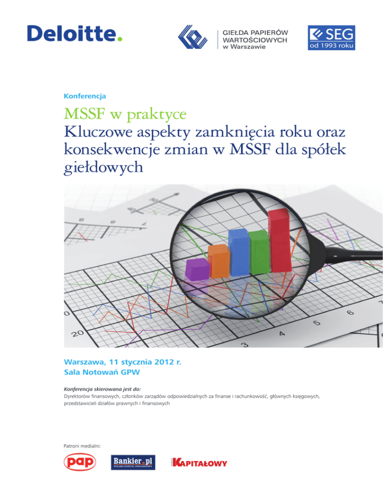 Konferencja MSSF w praktyce Kluczowe aspekty zamknięcia roku oraz konsekwencje zmian w MSSF dla spółek giełdowych Warszawa, 11 stycznia 2012 r. Sala Notowań GPW Konferencja skierowana jest do: Dyrektorów finansowych, członków zarządów odpowiedzialnych za finanse i rachunkowość, głównych księgowych, przedstawicieli działów prawnych i finansowych Patroni medialni: Szanowni Państwo, Zarówno regulatorzy jak i zwykli odbiorcy sprawozdań finansowych coraz większą uwagę przywiązują nie tylko do danych finansowych zawartych w podstawowych sprawozdaniach finansowych, ale również do informacji zawartych w notach uzupełniających sprawozdanie finansowe. Dlatego w bieżącym roku postanowiliśmy w ramach corocznej konferencji dotyczącej kwestii związanych z MRS/MSSF omówić najczęściej pojawiające się i jednocześnie znaczące z punktu widzenia odbiorcy sprawozdań finansowych braki bądź też nieprawidłowości w ujawnieniach wymagane przez standardy. Zapraszamy Państwa do udziału w konferencji, podczas której eksperci firmy Deloitte przedstawią kluczowe kwestie związane z zamknięciem roku fiskalnego, „gorące” tematy roku 2011, jak np. kwestie związane z nieprawidłowościami w ujawnieniach, bądź też specyficzne zagadnienia rachunkowe wymagające interpretacji, jak również przybliżą kolejne zmiany w MSSF istotne z perspektywy spółek notowanych na giełdzie. Uczestnicząc w konferencji zyskają Państwo okazję do bezpośredniej wymiany doświadczeń i poglądów z ekspertami i praktykami biznesu. Będą Państwo mieli również możliwość indywidualnych konsultacji konkretnych problemów z ekspertami firmy Deloitte. Dodatkowo specjalnie dla uczestników konferencji przygotowaliśmy najnowsze wydanie książki „Praktyczny przewodnik po MSSF wraz z porównaniem z PSR”. Prelegenci Monika Jakubczyk Dyrektor w Dziale Audytu Deloitte Aleksander Kot Starszy Menedżer w Dziale Doradztwa Podatkowego Deloitte Marcin Samolik Starszy Menedżer w Dziale Audytu Deloitte Aleksandra Rytko Manager w Dziale Audytu, Biegły Rewident, ACCA Posiada 8 letnie doświadczenie audytorskie zdobyte w Polsce oraz w Stanach. Specjalizuje się w Międzynarodowych Standardach Sprawozdawczości Finansowej oraz Amerykańskich Standardach Sprawozdawczości Finansowej. Obsługuje głównie klientów z branży energetycznej i chemicznej oraz klientów raportujących w zgodności z Amerykańskimi Standardami Sprawozdawczości Finansowej. Jest członkiem Brytyjskiego Stowarzyszenia Biegłych Rewidentów. Posiada dziesięcioletnie doświadczenie w doradztwie podatkowym. Specjalizuje się w kwestiach opodatkowania przedsiębiorstw oraz opodatkowania transakcji międzynarodowych. Jest autorem licznych struktur optymalizacji podatkowej oraz prowadził wiele przeglądów podatkowych i analiz typu due diligence. Poza doradztwem w zakresie CIT Aleksander specjalizuje się także w zagadnieniach związanych z podatkiem odroczonym oraz modelowaniem finansowym umów (SPA Advisory). Jest doradcą podatkowym i członkiem ACCA. Posiada 11-letnie doświadczenie w pracy audytorskiej. Specjalizuje się w badaniu sprawozdań finansowych (w tym sprawozdań skonsolidowanych) i doradztwie księgowym dla przedsiębiorstw produkcyjnych i handlowych działających w różnych sektorach gospodarki. Uczestniczył również w projektach typu due dilligence, opracowywaniu zasad (polityki rachunkowości), badaniu i ocenie sytemu kontroli wewnętrznej oraz projektowaniu systemów raportowania finansowego. Posiada uprawnienia biegłego rewidenta. Posiada wieloletnie doświadczenie audytorskie zdobyte w Deloitte a wcześniej w PwC. Przez kilka lat była także Dyrektorem w firmie BPP Professional Education prowadząc i nadzorując szkolenia z zakresu sprawozdawczości finansowej, w tym szkolenia ACCA, CIMA, CIA i CFA. Specjalizuje się w Międzynarodowych Standardach Sprawozdawczości Finansowej oraz polskim prawie bilansowym. Posiada uprawnienia biegłego rewidenta oraz tytuł członka brytyjskiego stowarzyszenia ACCA. Przemysław Zawadzki Menedżer w Dziale Audytu Deloitte Posiada wieloletnie doświadczenie audytorskie. Posiada uprawnienia biegłego rewidenta. Jest członkiem Brytyjskiego Stowarzyszenia Biegłych Rewidentów (Association of Certified Chartered Accountants).Specjalizuje się w polskim prawie bilansowym oraz Międzynarodowych Standardach Sprawozdawczości Finansowej. Posiada doświadczenie w badaniu Spółek zgodnie z US GAAP. Prowadzi różnorodne szkolenia techniczne. Program konferencji 11:40 – 12:00 Rejestracja uczestników i powitalna kawa 12:00 – 12:10 Otwarcie konferencji Przedstawiciel Deloitte Mirosław Kachniewski, Prezes Zarządu, Stowarzyszenie Emitentów Giełdowych 12:10 – 12:-40 Ujawnianie informacji w sprawozdaniach finansowych – dlaczego może sprawiać trudności? • Częste braki w ujawnieniach dotyczących instrumentów finansowych • Ujawnienia dotyczące zarządzania ryzykiem finansowym • Inne obszary Marcin Samolik, Starszy Menedżer w dziale audytu Deloitte 12:40 – 13:10 MSSF8 Segmenty operacyjne • Identyfikacja segmentów operacyjnych • Segmenty operacyjne a segmenty sprawozdawcze • Zasady wyceny informacji segmentowych • Ujawnienia wymagane przez standard Monika Jakubczyk, Dyrektor w dziale audytu Deloitte 13:10 – 13:40 Wskaźnik „zysk na akcję” i jego rozwodnienie • Zasady prezentacji i ujawniania • Podstawowy zysk na akcję • Rozwodniony zysk na akcję – jak liczyć? Marcin Samolik, Starszy Menedżer w dziale audytu Deloitte 13:40 – 14:00 Przerwa kawowa 14:00 – 14:30 Projekt nowego standardu - jednostki inwestycyjne • Dlaczego powstał projekt nowego standardu • Definicja jednostki inwestycyjnej • Zwolnienie z konsolidacji • Zasady wyceny inwestycji Przemysław Zawadzki, Menedżer w dziale audytu Deloitte 14:30 – 15:30 Dywidenda - ujęcie księgowe z uwzględnieniem skutków podatkowych i prawnych • Uwarunkow