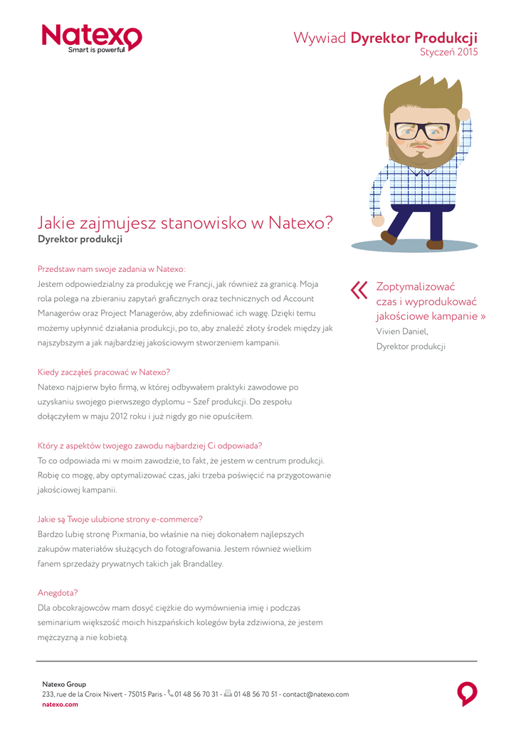 Wywiad Dyrektor Produkcji Styczeń 2015 Jakie zajmujesz stanowisko w Natexo? Dyrektor produkcji Przedstaw nam swoje zadania w Natexo: Jestem odpowiedzialny za produkcję we Francji, jak również za granicą. Moja rola polega na zbieraniu zapytań graficznych oraz technicznych od Account Managerów oraz Project Managerów, aby zdefiniować ich wagę. Dzięki temu « możemy upłynnić działania produkcji, po to, aby znaleźć złoty środek między jak najszybszym a jak najbardziej jakościowym stworzeniem kampanii. Kiedy zacząłeś pracować w Natexo? Natexo najpierw było firmą, w której odbywałem praktyki zawodowe po uzyskaniu swojego pierwszego dyplomu – Szef produkcji. Do zespołu dołączyłem w maju 2012 roku i już nigdy go nie opuściłem. Który z aspektów twojego zawodu najbardziej Ci odpowiada? To co odpowiada mi w moim zawodzie, to fakt, że jestem w centrum produkcji. Robię co mogę, aby optymalizować czas, jaki trzeba poświęcić na przygotowanie jakościowej kampanii. Jakie są Twoje ulubione strony e-commerce? Bardzo lubię stronę Pixmania, bo właśnie na niej dokonałem najlepszych zakupów materiałów służących do fotografowania. Jestem również wielkim fanem sprzedaży prywatnych takich jak Brandalley. Anegdota? Dla obcokrajowców mam dosyć ciężkie do wymównienia imię i podczas seminarium większość moich hiszpańskich kolegów była zdziwiona, że jestem mężczyzną a nie kobietą. Natexo Group 233, rue de la Croix Nivert - 75015 Paris natexo.com 01 48 56 70 31 - 01 48 56 70 51 - [email protected] Zoptymalizować czas i wyprodukować jakościowe kampanie » Vivien Daniel, Dyrektor produkcji