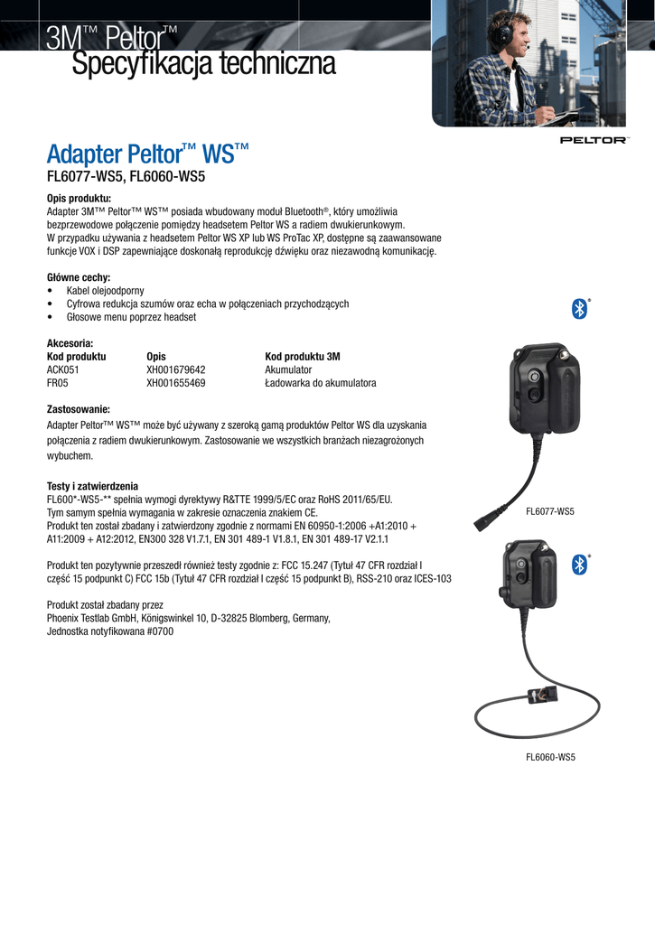 3M™ Peltor™ Specyfikacja techniczna Adapter Peltor™ WS™ FL6077-WS5, FL6060-WS5 Opis produktu: Adapter 3M™ Peltor™ WS™ posiada wbudowany moduł Bluetooth®, który umożliwia bezprzewodowe połączenie pomiędzy headsetem Peltor WS a radiem dwukierunkowym. W przypadku używania z headsetem Peltor WS XP lub WS ProTac XP, dostępne są zaawansowane funkcje VOX i DSP zapewniające doskonałą reprodukcję dźwięku oraz niezawodną komunikację. Główne cechy: • Kabel olejoodporny • Cyfrowa redukcja szumów oraz echa w połączeniach przychodzących • Głosowe menu poprzez headset Akcesoria: Kod produktu ACK051 FR05 Opis XH001679642 XH001655469 Kod produktu 3M Akumulator Ładowarka do akumulatora Zastosowanie: Adapter Peltor™ WS™ może być używany z szeroką gamą produktów Peltor WS dla uzyskania połączenia z radiem dwukierunkowym. Zastosowanie we wszystkich branżach niezagrożonych wybuchem. Testy i zatwierdzenia FL600*-WS5-** spełnia wymogi dyrektywy R&TTE 1999/5/EC oraz RoHS 2011/65/EU. Tym samym spełnia wymagania w zakresie oznaczenia znakiem CE. Produkt ten został zbadany i zatwierdzony zgodnie z normami EN 60950-1:2006 +A1:2010 + A11:2009 + A12:2012, EN300 328 V1.7.1, EN 301 489-1 V1.8.1, EN 301 489-17 V2.1.1 FL6077-WS5 Produkt ten pozytywnie przeszedł również testy zgodnie z: FCC 15.247 (Tytuł 47 CFR rozdział I część 15 podpunkt C) FCC 15b (Tytuł 47 CFR rozdział I część 15 podpunkt B), RSS-210 oraz ICES-103 Produkt został zbadany przez Phoenix Testlab GmbH, Königswinkel 10, D-32825 Blomberg, Germany, Jednostka notyfikowana #0700 FL6060-WS5 3M™ Peltor™ Specyfikacja techniczna Dane techniczne: Rozmiar: PTT: 90x70x40 mm Materiały: Obudowa: polipropylen Kabel: Samowulkanizujca się powłoka poliuretanowa Zasilanie: Adapter zasilany jest przez dwie baterie wielokrotnego ładowania 2xAA 1,2–1,5V, można używać dowolnego typu, NiMH, NiCd, Alkaliczne, Litowe, Manganowe itp. Żywotność baterii: Typowa żywotność baterii alkalicznych 2*AA – 29 h Użytkowanie i przechowywanie: Temperatura przechowywania: -20°C do +55°C, wilgotność <90% Temperatura użytkowania: -20°C do +55°C Maksymalny zalecany okres magazynowania: 5 lat za wyjątkiem baterii: <1 rok. Ograniczenia użytkowania: Nie należy wprowadzać żadnych modyfikacji do tego produktu. Model Kabel Łącznik FL6077-WS5 Kabel olejoodporny Kabel Flex FL6060-WS5 Kabel olejoodporny Złącze 10-cio biegunowe Ilustracja Dostępne kable Flex Kabel FL6U-21 FL6U-28 FL6U-31 FL6U-32 FL6U-35 FL6U-36 FL6U-61 FL6U-63 FL6U-64 FL6U-65 FL6U-66 FL6U-67 FL6U-101 TAA13-T0299 TAA22-T0299 Opis Kabel Flex do Motorola GP300, CP040 Kabel Flex do tel. kom., dect 2,5 mm Stereo Kabel Flex do Icom F3, F4, etc 2,5-3,5 mm Kabel Flex do Motorola GP340, GP328 Kabel Flex do Icom F3G, F4G Kabel Flex do Kenwood 2,5-3,5 mm Kabel Flex do Motorola Visar Kabel Flex do Motorola MOTOTRBO Kabel Flex do Icom F33/F43 F34/F44 Kabel Flex do Motorola GP344, GP328+ Kabel Flex do Iphone/HTC/Samsung 3,5 mm Kabel Flex do Nokia/Sony 3,5 mm Kabel Flex do Sepura seria STP8000 Kabel Flex do Icom-F51/61 Kabel Flex do Vertex VX-160 Ważne informacje: 3M nie bierze na siebie odpowiedzialności, bezpośredniej ani pośredniej(włączając w to, ale nie ograniczając się jedynie do utraty zysków, biznesu i/lub reputacji firmy) wynikającej z zastosowania się do jakiejkolwiek z przedstawionych w tym dokumencie przez 3M informacji. Użytkownik jest odpowiedzialny za określenie zasadności produktów zgodnie z zamierzonym zastosowaniem. Żaden element tego oświadczenia nie może być podstawą do wykluczenia czy ograniczenia odpowiedzialności 3M za śmierć czy zranienie wynikłe z jego zaniedbania. 3M Poland Sp. z o.o. Dział Bezpieczeństwa Pracy Gwarancja: Gwarancja nie uwzględnia szkód spowodowanych błędnym użytkowaniem bądź zaniedbaniami w magazynowaniu. Aby uzyskać więcej informacji na temat użytkowania, proszę zapoznać się z instrukcją produktu. Aby uzyskać pełne informacje o warunkach gwarancji, proszę skontaktować się z lokalnym przedstawicielem 3M. Al. Katowicka 117 Kajetany, 05-830 Nadarzyn tel.: +48 22 739 60 00 fax: +48 22 739 60 01 www.3m.pl/bhp Proszę poddać recyklingowi. Wydrukowane w Polsce. © 3M 2013. Wszelkie prawa zastrzeżone.