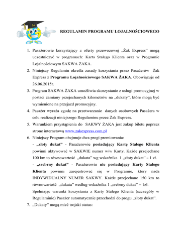 REGULAMIN PROGRAMU LOJALNOŚCIOWEGO 1. Pasażerowie korzystający z oferty przewozowej „Żak Express” mogą uczestniczyć w programach: Karta Stałego Klienta oraz w Programie Lojalnościowym SAKWA ŻAKA. 2. Niniejszy Regulamin określa zasady korzystania przez Pasażerów Żak Express z Programu Lojalnościowego SAKWA ŻAKA. Obowiązuje od 26.06.2015r. 3. Program SAKWA ŻAKA umożliwia skorzystanie z usługi promocyjnej w postaci zamiany przejechanych kilometrów na „dukaty”, które mogą być wymienione na przejazd promocyjny. 4. Pasażer wyraża zgodę na przetwarzanie danych osobowych Pasażera w celu realizacji niniejszego Regulaminu przez Żak Express. 5. Warunkiem przystąpienia do SAKWY ŻAKA jest zakup biletu poprzez stronę internetową www.zakexpress.com.pl 6. Niniejszy Program obejmuje dwa progi premiowania: - „złoty dukat” - Pasażerowie posiadający Kartę Stałego Klienta powinni aktywować w SAKWIE numer w/w Karty. Każde przejechane 100 km to równowartość „dukata” wg wskaźnika 1 „złoty dukat” = 1 zł. - „srebrny dukat” - Pasażerowie nie posiadający Karty Stałego Klienta powinni zarejestrować się w Programie, który nada INDYWIDUALNY NUMER SAKWY. Każde przejechane 150 km to równowartość „dukata” według wskaźnika 1 „srebrny dukat” = 1zł. Spełniając warunki korzystania z Karty Stałego Klienta (szczegóły w Regulaminie) Pasażer automatycznie przechodzi do progu „złoty dukat”. 7. „Dukaty” mogą mieć trojaki status: – „dukaty” do zdobycia – w momencie wyboru przejazdu o danej wartości zostaje podana ilość „dukatów” do zdobycia, – „dukaty” oczekujące – w momencie zakupu biletu „dukaty” do zdobycia nie trafiają do SAKWY Pasażera, oczekują do zakończenia wybranego kursu, – „dukaty” do wykorzystania - „dukaty”, które trafią do SAKWY Pasażera po zrealizowanych przejazdach. 8. Po zgromadzeniu w SAKWIE wymaganej ilości „dukatów” stanowiącej wartość wybranego przejazdu Pasażer może dokonać wymiany na przejazd promocyjny po spełnieniu warunków: - zakup biletu dotyczy tylko jednej osoby, - nie zostały wybrane opcje dodatkowe (np. wybór miejsca w autokarze, dodatkowy bagaż). 9. Nie ma możliwości zmiany ani zwrotu biletu otrzymanego za „dukaty”. 10.Zebrane w ramach Programu Lojalnościowego „dukaty” nie mogą być przekazane osobom trzecim i są ważne bezterminowo. 11.Rezygnacja z Programu Lojalnościowego zgromadzonych dotychczas „dukatów”. powoduje utratę