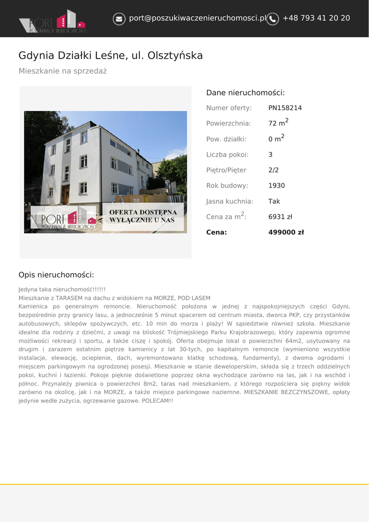 [email protected] +48 793 41 20 20 Gdynia Działki Leśne, ul. Olsztyńska Mieszkanie na sprzedaż Dane nieruchomości: Numer oferty: PN158214 Powierzchnia: 72 m Pow. działki: 0m Liczba pokoi: 3 Piętro/Pięter 2/2 Rok budowy: 1930 Jasna kuchnia: Tak 2 2 2 Cena za m : 6931 zł Cena: 499000 zł Opis nieruchomości: Jedyna taka nieruchomość!!!!!! Mieszkanie z TARASEM na dachu z widokiem na MORZE, POD LASEM Kamienica po generalnym remoncie. Nieruchomość położona w jednej z najspokojniejszych części Gdyni, bezpośrednio przy granicy lasu, a jednocześnie 5 minut spacerem od centrum miasta, dworca PKP, czy przystanków autobusowych, sklepów spożywczych, etc. 10 min do morza i plaży! W sąsiedztwie również szkoła. Mieszkanie idealne dla rodziny z dziećmi, z uwagi na bliskość Trójmiejskiego Parku Krajobrazowego, który zapewnia ogromne możliwości rekreacji i sportu, a także ciszę i spokój. Oferta obejmuje lokal o powierzchni 64m2, usytuowany na drugim i zarazem ostatnim piętrze kamienicy z lat 30-tych, po kapitalnym remoncie (wymieniono wszystkie instalacje, elewację, ocieplenie, dach, wyremontowano klatkę schodową, fundamenty), z dwoma ogrodami i miejscem parkingowym na ogrodzonej posesji. Mieszkanie w stanie deweloperskim, składa się z trzech oddzielnych pokoi, kuchni i łazienki. Pokoje pięknie doświetlone poprzez okna wychodzące zarówno na las, jak i na wschód i północ. Przynależy piwnica o powierzchni 8m2, taras nad mieszkaniem, z którego rozpościera się piękny widok zarówno na okolicę, jak i na MORZE, a także miejsce parkingowe naziemne. MIESZKANIE BEZCZYNSZOWE, opłaty jedynie wedle zużycia, ogrzewanie gazowe. POLECAM!! [email protected] +48 793 41 20 20