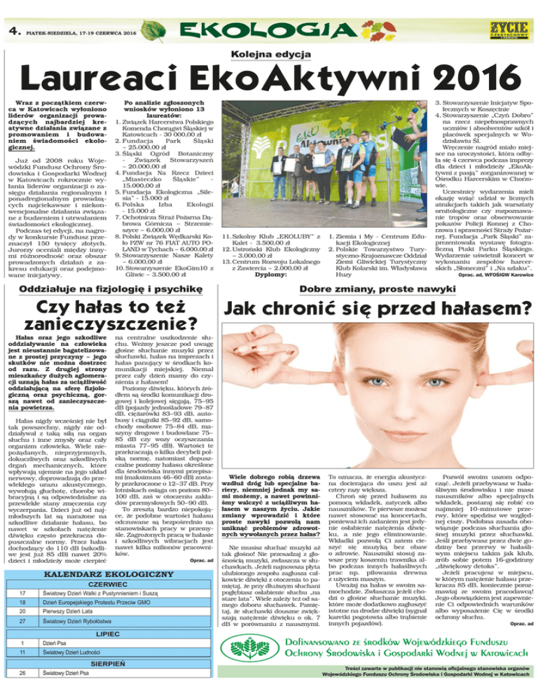 4. PIĄTEK-NIEDZIELA, 17-19 CZERWCA 2016 Kolejna edycja Laureaci EkoAktywni 2016 Po analizie zgłoszonych wniosków wyłoniono 13 laureatów: 1.Związek Harcerstwa Polskiego Komenda Chorągwi Śląskiej w Katowicach - 30 000,00 zł 2.Fundacja Park Śląski – 25.000,00 zł 3.Śląski Ogród Botaniczny - Związek Stowarzyszeń Już od 2008 roku Woje– 20.000,00 zł wódzki Fundusz Ochrony Środowiska i Gospodarki Wodnej 4.Fundacja Na Rzecz Dzieci „Miasteczko Śląskie” w Katowicach rokrocznie wy15.000,00 zł łania liderów organizacji o zasięgu działania regionalnym i 5.Fundacja Ekologiczna „Silesia” - 15.000 zł ponadregionalnym prowadząIzba Ekologii cych najciekawsze i niekon- 6.Polska - 15.000 zł wencjonalne działania związane z budzeniem i utrwalaniem 7.Ochotnicza Straż Pożarna Dąbrowa Górnicza – Strzemieświadomości ekologicznej. szyce – 6.000,00 zł Podczas tej edycji, na nagroCiąg dalszy na str. Związek Wędkarski Ko8.Polski dy w konkursie Fundusz przeDokończenie ze str. ło PZW nr 76 FIAT AUTO POznaczył 150 tysięcy złotych. LAND w Tychach – 6.000,00 zł Jurorzy oceniali między innymi różnorodność oraz obszar 9.Stowarzyszenie Nasze Kalety – 6.000,00 zł prowadzonych działań z zakresu edukacji oraz podejmo- 10.Stowarzyszenie EkoGim10 z Gliwic – 3.500,00 zł wane inicjatywy. Wraz z początkiem czerwca w Katowicach wyłoniono liderów organizacji prowadzących najbardziej kreatywne działania związane z promowaniem i budowaniem świadomości ekologicznej. 11.Szkolny Klub „EKOLUBY” z Kalet - 3.500,00 zł 12.Ustroński Klub Ekologiczny – 3.000,00 zł 13.Centrum Rozwoju Lokalnego z Zawiercia – 2.000,00 zł Dyplomy: 1.Ziemia i My - Centrum Edukacji Ekologicznej 2.Polskie Towarzystwo Turystyczno-Krajoznawcze Oddział Ziemi Gliwickiej Turystyczny Klub Kolarski im. Władysława Huzy 3.Stowarzyszenie Inicjatyw Społecznych w Koszęcinie 4.Stowarzyszenie „Czyń Dobro” na rzecz niepełnosprawnych uczniów i absolwentów szkół i placówek specjalnych w Wodzisławiu Śl. Wręczenie nagród miało miejsce na uroczystości, która odbyła się 4 czerwca podczas imprezy dla dzieci i młodzieży „EkoAktywni z pasją” zorganizowanej w Ośrodku Harcerskim w Chorzowie. Uczestnicy wydarzenia mieli okazję wziąć udział w licznych atrakcjach takich jak warsztaty ornitologiczne czy rozpoznawanie tropów oraz obserwowanie pokazów Policji Konnej z Chorzowa i sprawności Straży Pożarnej. Fundacja „Park Śląski” zaprezentowała wystawę fotograficzną Ptaki Parku Śląskiego. Wydarzenie uświetnił koncert w wykonaniu zespołów harcerskich „Słoneczni” i „Na szlaku”. Oprac. ad, WFOŚIGW Karowice Oddziałuje na fizjologię i psychikę Dobre zmiany, proste nawyki Czy hałas to też zanieczyszczenie? Jak chronić się przed hałasem? Hałas oraz jego szkodliwe oddziaływanie na człowieka jest nieustannie bagatelizowane z prostej przyczyny – jego skutków nie można dostrzec od razu. Z drugiej strony mieszkańcy dużych aglomeracji uznają hałas za uciążliwość oddziałującą na sferę fizjologiczną oraz psychiczną, gorszą nawet od zanieczyszczenia powietrza. Hałas nigdy wcześniej nie był tak powszechny, nigdy nie oddziaływał z taką siłą na organ słuchu i inne zmysły oraz cały organizm człowieka. Wiele niepożądanych, nieprzyjemnych, dokuczliwych oraz szkodliwych drgań mechanicznych, które wpływają ujemnie na jego układ nerwowy, doprowadzają do przewlekłego urazu akustycznego, wywołują głuchotę, chorobę wibracyjną i są odpowiedzialne za przewlekłe stany zmęczenia czy wyczerpania. Dzieci już od najmłodszych lat są narażone na szkodliwe działanie hałasu, bo nawet w szkołach natężenie dźwięku często przekracza dopuszczalne normy. Przez hałas dochodzący do 110 dB (szkodliwe jest już 85 dB) nawet 20% dzieci i młodzieży może cierpieć na centralne uszkodzenie słuchu. Weźmy jeszcze pod uwagę głośne słuchanie muzyki przez słuchawki, hałas na imprezach i hałas panujący w środkach komunikacji miejskiej. Niemal przez cały dzień mamy do czynienia z hałasem! Poziomy dźwięku, których źródłem są środki komunikacji drogowej i kolejowej sięgają, 75–95 dB (pojazdy jednośladowe 79–87 dB, ciężarówki 83–93 dB, autobusy i ciągniki 85–92 dB, samochody osobowe 75–84 dB, maszyny drogowe i budowlane 75– 85 dB czy wozy oczyszczania miasta 77–95 dB). Wartości te przekraczają o kilka decybeli polską normę, natomiast dopuszczalne poziomy hałasu określone dla środowiska innymi przepisami (maksimum 46–60 dB) zostały przekroczone o 12–37 dB. Przy lotniskach osiąga on poziom 80– 100 dB, zaś w otoczeniu zakładów przemysłowych 50–90 dB. To zresztą bardzo niepokojące, że podobne wartości hałasu odczuwane są bezpośrednio na stanowiskach pracy w przemyśle. Zagrożonych pracą w hałasie i szkodliwych wibracjach jest nawet kilka milionów pracowników. KALENDARZ EKOLOGICZNY CZERWIEC 17 Światowy Dzień Walki z Pustynnieniem i Suszą 18 Dzień Europejskiego Protestu Przeciw GMO 20 Pierwszy Dzień Lata 27 Światowy Dzień Rybołóstwa Oprac. ad Wiele dobrego robią drzewa wzdłuż dróg lub specjalne bariery, niemniej jednak my sami możemy, a nawet powinniśmy walczyć z uciążliwym hałasem w naszym życiu. Jakie zmiany wprowadzić i które proste nawyki pozwolą nam uniknąć problemów zdrowotnych wywołanych przez hałas? Nie musisz słuchać muzyki aż tak głośno! Nie przesadzaj z głośnością muzyki, zwłaszcza w słuchawkach. Jeżeli najnowsza płyta ulubionego zespołu zagłusza całkowicie dźwięki z otoczenia to pamiętaj, że przy dłuższym słuchani pogłębiasz osłabienie słuchu „na stare lata”. Wiele zależy też od samego doboru słuchawek. Pamiętaj, że słuchawki douszne zwiększają natężenie dźwięku o ok. 7 dB w porównaniu z nausznymi. To oznacza, że energia akustyczna docierająca do uszu jest aż cztery r