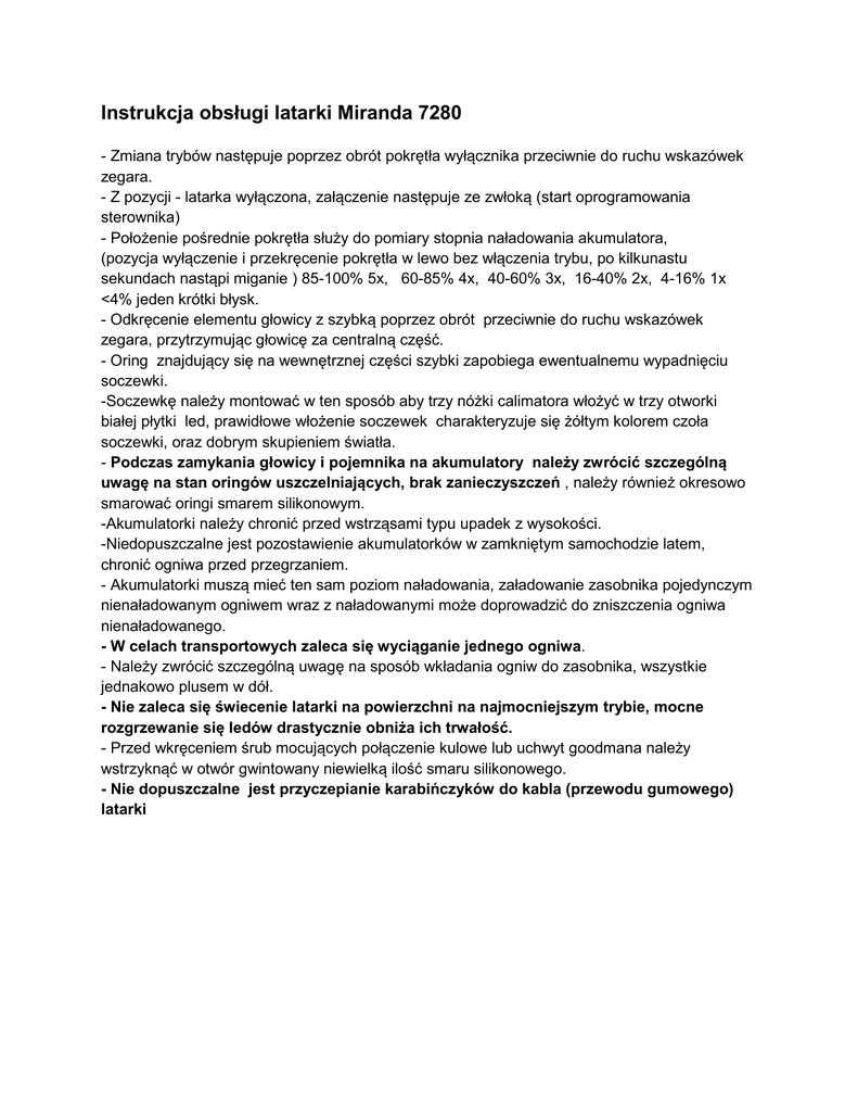 Instrukcja obsługi latarki Miranda 7280 - Zmiana trybów następuje poprzez obrót pokrętła wyłącznika przeciwnie do ruchu wskazówek zegara. - Z pozycji - latarka wyłączona, załączenie następuje ze zwłoką (start oprogramowania sterownika) - Położenie pośrednie pokrętła służy do pomiary stopnia naładowania akumulatora, (pozycja wyłączenie i przekręcenie pokrętła w lewo bez włączenia trybu, po kilkunastu sekundach nastąpi miganie ) 85-100% 5x, 60-85% 4x, 40-60% 3x, 16-40% 2x, 4-16% 1x <4% jeden krótki błysk. - Odkręcenie elementu głowicy z szybką poprzez obrót przeciwnie do ruchu wskazówek zegara, przytrzymując głowicę za centralną część. - Oring znajdujący się na wewnętrznej części szybki zapobiega ewentualnemu wypadnięciu soczewki. -Soczewkę należy montować w ten sposób aby trzy nóżki calimatora włożyć w trzy otworki białej płytki led, prawidłowe włożenie soczewek charakteryzuje się żółtym kolorem czoła soczewki, oraz dobrym skupieniem światła. - Podczas zamykania głowicy i pojemnika na akumulatory należy zwrócić szczególną uwagę na stan oringów uszczelniających, brak zanieczyszczeń , należy również okresowo smarować oringi smarem silikonowym. -Akumulatorki należy chronić przed wstrząsami typu upadek z wysokości. -Niedopuszczalne jest pozostawienie akumulatorków w zamkniętym samochodzie latem, chronić ogniwa przed przegrzaniem. - Akumulatorki muszą mieć ten sam poziom naładowania, załadowanie zasobnika pojedynczym nienaładowanym ogniwem wraz z naładowanymi może doprowadzić do zniszczenia ogniwa nienaładowanego. - W celach transportowych zaleca się wyciąganie jednego ogniwa. - Należy zwrócić szczególną uwagę na sposób wkładania ogniw do zasobnika, wszystkie jednakowo plusem w dół. - Nie zaleca się świecenie latarki na powierzchni na najmocniejszym trybie, mocne rozgrzewanie się ledów drastycznie obniża ich trwałość. - Przed wkręceniem śrub mocujących połączenie kulowe lub uchwyt goodmana należy wstrzyknąć w otwór gwintowany niewielką ilość smaru silikonowego. - Nie dopuszczalne jest przyczepianie karabińczyków do kabla (przewodu gumowego) latarki Utylizacja Produkt Utylizację zużytego urządzenia należy obowiązującymi przepisami prawa. przeprowadzić zgodnie z Utylizacja zużytych baterii/akumulatorów Jako użytkownik końcowy jesteś prawnie zobowiązany (rozporządzenie dotyczące baterii) do zwrotu wszystkich zużytych baterii/akumulatorów. Wyrzucanie z odpadami domowymi jest zabronione! Baterie/akumulatory zawierające substancje szkodliwe są oznaczone poniższymi symbolami wskazującymi, że wyrzucanie z odpadami domowymi jest zabronione. Symbole niebezpiecznych składników z metali ciężkich to: Cd = kadm, Hg = rtęć, Pb = ołów. Zużyte baterie/akumulatory możesz bezpłatnie oddać do dowolnego upoważnionego lokalnego punktu utylizacji lub dowolnego punktu sprzedaży baterii/akumulatorów. Tym samym spełnisz swój prawny obowiązek i przyczynisz się do ochrony środowiska.