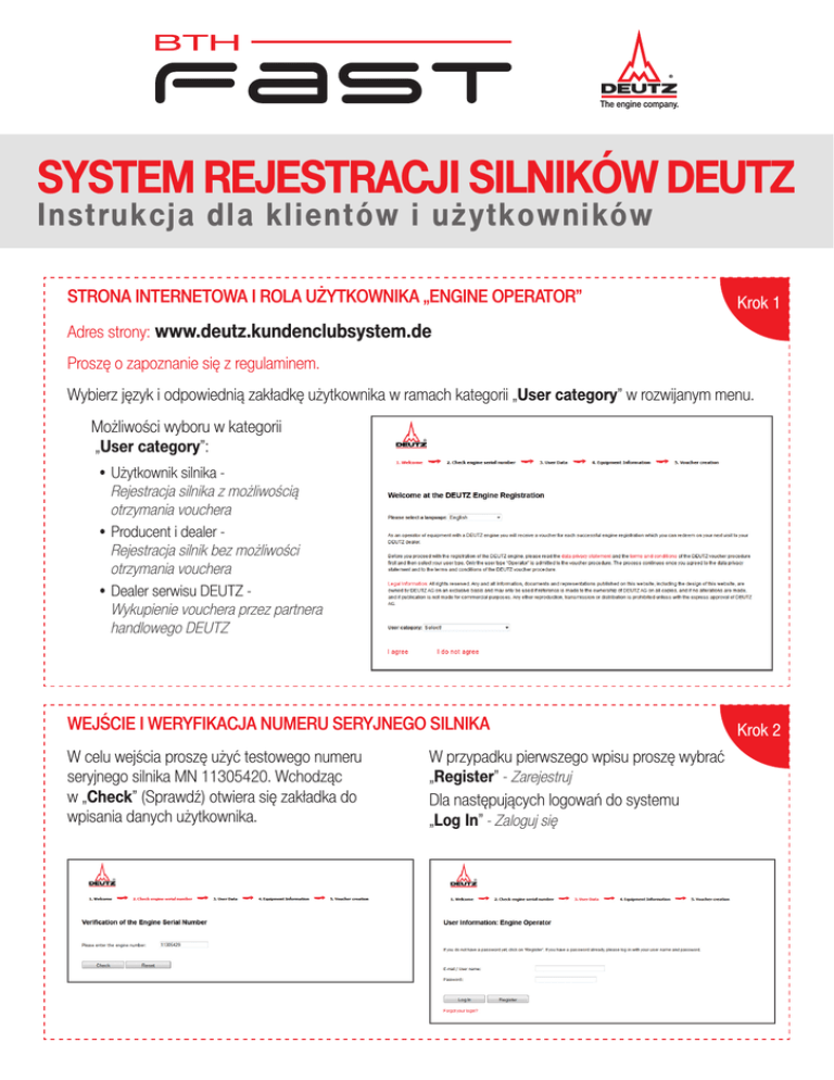 SYSTEM REJESTRACJI SILNIKÓW DEUTZ Instrukcja dla klientów i użytkowników STRONA INTERNETOWA I ROLA UŻYTKOWNIKA „ENGINE OPERATOR” Krok 1 Adres strony: www.deutz.kundenclubsystem.de Proszę o zapoznanie się z regulaminem. Wybierz język i odpowiednią zakładkę użytkownika w ramach kategorii „User category” w rozwijanym menu. Możliwości wyboru w kategorii „User category”: •Użytkownik silnika Rejestracja silnika z możliwością otrzymania vouchera •Producent i dealer Rejestracja silnik bez możliwości otrzymania vouchera •Dealer serwisu DEUTZ Wykupienie vouchera przez partnera handlowego DEUTZ WEJŚCIE I WERYFIKACJA NUMERU SERYJNEGO SILNIKA W celu wejścia proszę użyć testowego numeru seryjnego silnika MN 11305420. Wchodząc w „Check” (Sprawdź) otwiera się zakładka do wpisania danych użytkownika. W przypadku pierwszego wpisu proszę wybrać „Register” - Zarejestruj Dla następujących logowań do systemu „Log In” - Zaloguj się Krok 2 REJESTRACJA UŻYTKOWNIKA Krok 3 WPROWADZENIE INFORMACJI NA TEMAT DANYCH URZĄDZENIA Krok 4 Należy wprowadzić tu informacje takie jak: ilość przepracowanych godzin, data uruchomienia oraz miejsca postoju maszyny. Dane nie zostaną przyjęte dla późniejszych logowań w P Systemie. INFORMACJA Z SYSTEMU „VOUCHER GRANTED” PRZYZNANIE VOUCHERA Krok 5 INFORMACJA Z SYSTEMU Krok 6 „VOUCHER CANNOT BE CREATED” Kiedy voucher nie może być utworzony •Silnik miał lub ma jakieś aktywne zgłoszenie gwarancyjne. - W takim przypadku voucher nie może zostać utworzony. •Bardzo dziękujemy za rejestracje Państwa silnika! Po rejestracji pojawiają się następujące informacje. • „Dziękujemy za rejestrację silnika DEUTZ” - zostaniesz poproszony o zachowanie albo natychmiastowy wydruk vouchera. •„Czy chcesz zarejestrować inny silnik proszę wybrać „New engine” (Nowy silnik), w przeciwnym razie proszę kliknąć „Log out” (Wyloguj) - Voucher został już wystawiony. Utworzenie kolejnego vouchera dla tego silnika jest wykluczone. Czy chcecie Państwo zarejestrować kolejny silnik? W przeciwnym razie kliknij „Log out” •Kupon nie może zostać utworzony: gdy wskazana data uruchomienia silnika jest dłuższa niż 12 miesięcy lub gdy różni się od daty magazynowania w systemie lub wychodzi po za maksymalny dopuszczalny okres dla uruchomienia silnika po dostawie. •Wprowadzenie danych nie powiodło się. Prosimy spróbować ponownie później.