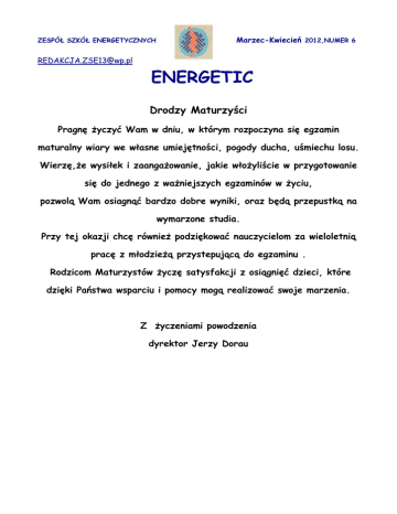 ZESPÓŁ SZKÓŁ ENERGETYCZNYCH Marzec-Kwiecień 2012,NUMER 6 [email protected] ENERGETIC Drodzy Maturzyści Pragnę życzyć Wam w dniu, w którym rozpoczyna się egzamin maturalny wiary we własne umiejętności, pogody ducha, uśmiechu losu. Wierzę,że wysiłek i zaangażowanie, jakie włożyliście w przygotowanie się do jednego z ważniejszych egzaminów w życiu, pozwolą Wam osiagnąć bardzo dobre wyniki, oraz będą przepustką na wymarzone studia. Przy tej okazji chcę również podziękować nauczycielom za wieloletnią pracę z młodzieżą przystepującą do egzaminu . Rodzicom Maturzystów życzę satysfakcji z osiągnięć dzieci, które dzięki Państwa wsparciu i pomocy mogą realizować swoje marzenia. Z życzeniami powodzenia dyrektor Jerzy Dorau Nowe otwarcie, nowe wyzwania, nowa szkoła Dwie gdańskie szkoły z tradycjami, decyzją miejskich radnych, połączą się tworząc zupełnie nową jakość w trójmiejskiej przestrzeni edukacyjnej. Zespół Szkół Energetycznych, który w tym roku obchodzi 50. rocznicę swego powstania, połączy się ze Szkołami Elektrycznymi i Elektronicznymi, powołanymi w latach 50. ubiegłego wieku. Nowa szkoła to powrót do najlepszych tradycji gdańskiego kształcenia zawodowego i technicznego, którego najlepsze czasy przypadły na okres powołania pięcioletniego Technikum Energetycznego Elektrowni Jądrowej Żarnowiec w budowie, a następnie Zespołu Szkół Zawodowych Północnego Okręgu Energetycznego w Gdańsku. Absolwenci z tego okresu pracują w największych grupach energetycznych (ENERGA, EDF), instytutach badawczych (IMP PAN) i uczelniach technicznych (Politechnika Gdańska). Decyzja o połączeniu szkół z tak wielkimi tradycjami to dla nas wielkie wyróżnienie, ale przede wszystkim ogromne wyzwanie. Zdajemy sobie sprawę ile pracy przed nami, by stworzyć spójną ofertę edukacyjną wychodzącą naprzeciw potrzebom rynku pracy, stojącą na najwyższym poziomie. Naszą siłą jest doświadczenie i kompetencje dwóch zespołów pedagogicznych, świetne zaplecze edukacyjne (szkoła dysponuje 10 pracowniami komputerowymi połączonymi z Internetem siecią światłowodową, biblioteką z czytelnią multimedialną, basenem, salą gimnastyczną z trybunami, siłownią, aulą widowiskową) i innowacyjne narzędzia (szkoła jako jedna z pierwszych w Trójmieście wdrożyła dziennik elektroniczny, który na bieżąco dostarcza informacji zainteresowanym i ich rodzicom). Połączenie ze Szkołami Elektrycznymi i Elektronicznymi da nam dodatkową bazę warsztatową dla profilu kształcenia związanego z przetwarzaniem energii. Naszym celem jest stworzenie najlepszej szkoły technicznej na Pomorzu i cel ten osiągniemy systematyczną pracą i ciągłym doskonaleniem zarówno jakości kształcenia, jak również oferty edukacyjnej powiedział Jerzy Dorau, Dyrektor nowej, połączonej szkoły. Placówka przejmująca (Zespół Szkół Energetycznych) szczyci się bardzo dobrymi wynikami egzaminów zewnętrznych: maturalnego i zawodowego. Absolwenci kontynuują naukę na uczelniach Trójmiasta. Technicy nie mają problemów ze znalezieniem pracy. Połączenie spowoduje rozszerzenie oferty edukacyjnej szkoły. Do informatyków i energetyków dołączą elektronicy i elektrycy. Zachęcamy młodzież do nauki w zawodzie technik urządzeń i systemów energetyki odnawialnej. Przedstawiony przez Komisję Europejską i przyjęty w grudniu 2008 r. przez Parlament Europejski i Radę UE tzw. Pakiet energetyczno-klimatyczny nakłada na Polskę ambitne cele, szczególnie w obszarze wykorzystania odnawialnych źródeł energii. Te twarde wymogi prawne sprawiają, że sektor energetyki odnawialnej jest i będzie jednym z najdynamiczniej rozwijających się sektorów polskiej gospodarki, stwarzając tym samym specjalistom z tego obszaru gwarancję ciekawej i dobrze płatnej pracy. W dzisiejszych czasach nie można wyobrazić sobie sprawnie funkcjonującej firmy, administracji samorządowej i rządowej, czy instytucji międzynarodowych bez skutecznych narzędzi i systemów informatycznych. Dla gimnazjalistów, którzy od dziecka interesują się komputerami, mamy klasy w zawodzie technika informatyka. Coraz powszechniejsza automatyzacja i nasycenie elektroniką zarówno w domu, jak również w przemyśle i administracji, stwarza szansę dla specjalistów potrafiących sprawnie poruszać się w tej skomplikowanej dla zwykłych użytkowników materii. Ciekawi wiedzy i zasad działania urządzeń elektronicznych zdobędą tajniki wiedzy w zawodzie technika elektronika. Polski Krajowy System Elektroenergetyczny przechodzi głęboką metamorfozę. Przed operatorem systemu przesyłowego, operatorami systemów dystrybucyjnych i eksploatatorami sieci i instalacji elektroenergetycznych w zakładach przemysłowych i obiektach użytkowych i mieszkalnych stoi wiele wyzwań. Dzisiaj rozumiany system elektroenergetyczny, to nie tylko zbiór obiektów, urządzeń i maszyn służących do wytwarzania, przesytu, rozdziału i dostawy energii elektrycznej odbiorcom. To także idea inteligentnych sieci (ang. smart grid) łącząca najnowszą wiedzę z obszaru elektrotechniki, informatyki i telekomunikacji, stworzona, by bardziej efektywnie i taniej móc dostarczać usługi energetyczne (już nie tylko energię elektryczną) oraz zintegrować rozproszone źródła energii, w tym także odnawialnej. Ta idea jest szeroko rozwijana przez gdańską Grupę ENERGA i wspierana przez regulatora rynku – Prezesa Urzędu Regulacji Energetyki. Dla osób ciekawych zagadnień związanych z przetwarzaniem i dystrybucją energii elektrycznej oferujemy dwa profile kształcenia w zawodzie technika elektryka i technika energetyka. Najlepsi uczniowie mają szansę na stypendia fundowane przez Grupę ENERGA. Młodzieży, pragnącej szybko się usamodzielnić i zdobyć dobry zawód, proponujemy szkołę zawodową z klasami monterów elektroników i elektryków. W szkole panuje świe
