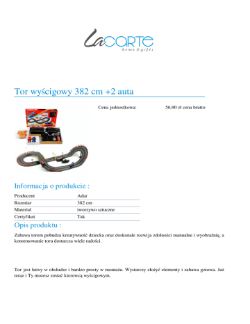 Tor wyścigowy 382 cm +2 auta Cena jednostkowa: 56,90 zł cena brutto Informacja o produkcie : Producent Rozmiar Material Certyfikat Adar 382 cm tworzywo sztuczne Tak Opis produktu : Zabawa torem pobudza kreatywność dziecka oraz doskonale rozwija zdolności manualne i wyobraźnię, a konstruowanie toru dostarcza wiele radości. Tor jest łatwy w obsłudze i bardzo prosty w montażu. Wystarczy złożyć elementy i zabawa gotowa. Już teraz i Ty mozesz zostać kierowcą wyścigowym. Świetna zabawa dla dzieci i rodziców. Wymiary: 382 cm W zestawie: - 2 piloty, - 2 samochody - zasilacz Wymiary opakowania:43x30x6cm Zasilanie Wiek : 4x1.5V (zestaw nie zawiera baterii) : 4 lata+ Pilot na baterie: Tak Powered by TCPDF (www.tcpdf.org)