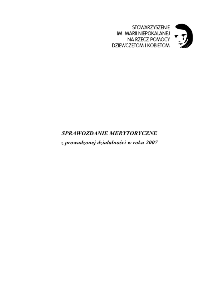 SPRAWOZDANIE MERYTORYCZNE z prowadzonej działalności w roku 2007 Sprawozdanie merytoryczne 2007 rok Stowarzyszenie im. Marii Niepokalanej na Rzecz Pomocy Dziewczętom i Kobietom Organizacja Pożytku Publicznego Adres: ul. Krasińskiego 21 40-019 Katowice tel./fax 032 / 255 38 69 e-mail: [email protected] http: www.magdalena-katowice.eu Numer w Krajowym Rejestrze Sądowym i data wpisu lub rejestracji KRS 0000055205 – 23.10.2001r. Numer Identyfikacji Podatkowej NIP: 954-23-92- 573 Numer REGON: 277651228 Konto Bankowe PKO BP SA Oddział I Katowice Nr rachunku: 39 1020 2313 0000 3202 0118 4043 Zarząd Stowarzyszenia: • Anna Bałchan - Przewodniczący Zarządu, zam. Katowice, ul. Krasińskiego 21 • Barbara Zawiła - Z-ca Przewodniczącego Zarządu, zam. Katowice, ul. Krasińskiego 21 • Aneta Leś - Członek Zarządu, zam. Siemianowice Śląskie, ul. Zgrzebnioka 2/2 • Zbigniew Rojowski - Członek Zarządu, zam. Wojkowice, ul. Karłowicza 26 Strona 2 z 7 Sprawozdanie merytoryczne 2007 rok HISTORIA STOWARZYSZENIA Inicjatorem tego dzieła jest Zgromadzenie Sióstr Maryi Niepokalanej, które powstało w XIX wieku we Wrocławiu. 1998 rok - ówczesny Prezydent Katowic w imieniu Zarządu Miasta zwrócił się do Matki Generalnej Zgromadzenia Sióstr Maryi Niepokalanej z prośbą o wydelegowanie siostry do pracy z żeńską młodzieżą, która znalazła się w niebezpieczeństwie prostytucji lub w innych zorganizowanych formach wykorzystania seksualnego. Zgromadzenie oddelegowało do tego zadania Siostrę Annę Bałchan, która wcześniej pracowała w duszpasterstwie dzieci i młodzieży. Od początku 1999 roku Siostra Anna zdobywała doświadczenia pracy ulicznej w Ośrodku Rehabilitacyjno - Wychowawczym dla Dzieci i Młodzieży "Dom Aniołów Stróżów" zajmującym się dziećmi ulicy. 2001 rok - powstaje Stowarzyszenie im. Marii Niepokalanej Na Rzecz Pomocy Dziewczętom i Kobietom. Jego celem jest pomoc ofiarom przymuszonej prostytucji, handlu ludźmi, przemocy domowej, nadużyć i wykorzystań seksualnych oraz kobietom będących w sytuacji kryzysowej. 2001 rok - pracownicy i wolontariusze Stowarzyszenia rozpoczynają pracę na ulicach Katowic, wychodząc naprzeciw kobietom, które mogłyby potrzebować pomocy. 2002 rok - Urząd Miasta Katowice przekazuje Stowarzyszeniu budynek, w którym powstaje Ośrodek Rehabilitacyjno-Wychowawczy. 2004 rok - oficjalne otwarcie Ośrodka. 2004 rok – prowadzenie punktu konsultacyjnego z pomocą prawną, terapeutyczną i aktywizującą zawodowo. 2005 rok - pracownicy Stowarzyszenia rozpoczynają realizację programu profilaktycznego wśród młodzieży, dotyczącego zagrożeń związanych z handlem ludźmi. 2006 rok – modernizacja i doposażenie siedziby Stowarzyszenia - pomieszczenia biurowego i pokoju terapeutycznego. CELE STATUTOWE ¾ pomoc dziewczętom i kobietom zagrożonym i dotkniętym przemocą seksualną, ¾ fizyczną i psychiczną, ofiarom handlu kobietami oraz ich rodzinom (zwanych dalej grupą docelowa); ¾ wychowanie, rehabilitacja i wyrównywanie szans grupy docelowej w zakresie wyrównywania deficytów rozwojowych, umiejętności społecznych; ¾ przeciwdziałanie patologiom społecznym; ¾ prowadzenie działań szkoleniowych, informacyjnych oraz profilaktycznych odnośnie problematyki przeciwdziałania przemocy i handlu kobietami; ¾ ochrona i promocja zdrowia rozumianego jako dobrostan fizyczny, psychiczny i społeczny; ¾ promocja zatrudnienia i aktywizacja zawodowa grupy docelowej, organizowanie miejsc pracy; ¾ edukacja w zakresie praw kobiet; ¾ działalność charytatywna na rzecz osób z grupy docelowej; ¾ promocja i organizacja wolontariatu; ¾ integracja i współpraca europejska w zakresie rozwiązywania problemów przemocy i handlu kobietami. Strona 3 z 7 Sprawozdanie merytoryczne 2007 rok METODY I OBSZARY DZIAŁANIA Stowarzyszenie pełni opiekę wychowawczo-społeczną z lub bez zakwaterowania w Ośrodku Rehabilitacyjno - Wychowawczym, w którym posiada 15 miejsc. Udziela również porad psychologiczno-terapeutycznych, prawnych, aktywizacji zawodowej, które w dużej mierze wspomagają fachowcy z tych dziedzin w ramach wolontariatu. Stowarzyszenie prowadzi działania szkoleniowe, warsztaty profilaktyczne, które zwiększają poziom wiedzy odnośnie problematyki przeciwdziałania przemocy i handlu ludźmi wśród młodzieży, pedagogów, wychowawców, specjalistów instytucji pomocowych. Działalność prowadzona jest w obszarach: 1. Profilaktyka – działalność prewencyjna z problematyki handlu ludźmi. 2. Ośrodek Rehabilitacyjno - Wychowawczy „MAGDALENA” dla ofiar przemocy. 3. Punkt konsultacyjny – biuro Stowarzyszenia. 4. Street-working - dyżury na ulicach miasta Katowice wśród osób prostytuujących się. Profilaktyka Prewencja, w działaniach Stowarzyszenia, to ogół środków zapobiegających powstawaniu zjawiska handlu ludźmi. Prowadzone szkolenia i warsztaty prewencyjne w katowickich szkołach stanowią bardzo ważny aspekt działalności Stowarzyszenia. Nie tylko zwiększają świadomość i wiedzę uczestników, ale również bezpieczeństwo młodzieży w zakresie wyjazdów za granicę, podejmowania skutecznych kroków i poszukiwania pomocy, oraz poszerzają grono osób udzielającej profesjonalnej pomocy psychologicznej i wsparcia ofiarom handlu ludźmi. Wykorzystuje się w nich aktywne metody pracy z uczestnikami. Ośrodek Rehabilitacyjno – Wychowawczy „Magdalena” W Ośrodku mogą uzyskać schronienie kobiety i kobiety z dziećmi, które z różnych przyczyn znajdują się w sytuacji kryzysowej, w szczególności kobiety, których dotyczy problem szeroko rozumianej przemocy. Ośrodek oferuje: - całodobową opiekę socjalną i materialną, - zajęcia terapeutyczno - rehabilitacyjne prowadzone przez pedagogów i psychologów, - zajęcia przygotowujące do samodzielnego radzenia sobie w różnych, także trudnych sytuacjach życiowych, - możliwość uczestniczenia w grupie wsparcia, - po