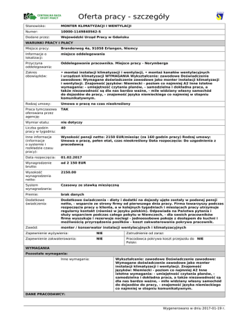 Oferta pracy - szczegóły Stanowisko: MONTER KLIMATYZACJI I WENTYLACJI Numer: 10000-1149840562-S Dodane przez: Wojewódzki Urząd Pracy w Gdańsku WARUNKI PRACY I PŁACY Miejsce pracy: Branderweg 4a, 91058 Erlangen, Niemcy Informacje o lokalizacji: miejsce oddelegowania Przyczyna oddelegowania: Oddelegowanie pracownika. Miejsce pracy - Norymberga Zakres obowiązków: • montaż instalacji klimatyzacji i wentylacji, • montaż kanałów wentylacyjnych i urządzeń klimatyzacji WYMAGANIA Wykształcenie: zawodowe Doświadczenie zawodowe: Wymagane doświadczenie zawodowe jako monter instalacji klimatyzacji i wentylacji. Znajomość języków: Niemiecki - poziom co najmniej A2 Inne istotne wymagania: - umiejętność czytania planów, - samodzielna i dokładna praca, a także niezawodność są dla nas bardzo ważne, - mile widziany własny samochód do dojazdów do pracy, - znajomość języka niemieckiego co najmniej w stopniu komunikatywnym. Rodzaj umowy: Umowa o pracę na czas nieokreślony Praca tymczasowa oferowana przez agencję: TAK Wymiar etatu: nie dotyczy Liczba godzin pracy w tygodniu: 40 Inne informacje (informacje o systemie i rozkładzie czasu pracy): Wysokość pensji netto: 2150 EUR/miesiąc (za 160 godzin pracy) Rodzaj umowy: Umowa o pracę, pełen etat, czas nieokreślony Data rozpoczęcia: Do uzgodnienia z pracodawcą Data rozpoczęcia: 01.02.2017 Wynagrodzenie brutto: od 2 150 EUR Wysokość wynagrodzenia netto: 2150.00 System wynagradzania: Czasowy ze stawką miesięczną Premie: brak danych Dodatkowe świadczenia: Dodatkowe świadczenia - diety i dodatki na dojazdy ujęte zostały w podanej pensji netto, - wsparcie ze strony firmy od pierwszego dnia pracy. Firma towarzyszy podczas rozpoczęcia pracy u klienta, a w kolejnych tygodniach i miesiącach pracy utrzymuje regularny kontakt (również w języku polskim). Odpowiada na Państwa pytania i służy wsparciem podczas całego pobytu w Niemczech, - dla swoich pracowników firma wyszukuje i rezerwuje noclegi - jednoosobowe pokoje z dostępem do kuchni i możliwością przyrządzenia posiłków - koszt zakwaterowania pokrywa pracownik. Zawód: monter / konserwator instalacji wentylacyjnych i klimatyzacyjnych Zapewnienie wyżywienia: NIE Zatrudnienie od zaraz: Zapewnienie zakwaterowania: NIE Pracodawca pokrywa koszt przejazdu do NIE Polski: WYMAGANIA Pozostałe wymagania: Inne wymagania: Wykształcenie: zawodowe Doświadczenie zawodowe: Wymagane doświadczenie zawodowe jako monter instalacji klimatyzacji i wentylacji. Znajomość języków: Niemiecki - poziom co najmniej A2 Inne istotne wymagania: - umiejętność czytania planów, samodzielna i dokładna praca, a także niezawodność są dla nas bardzo ważne, - mile widziany własny samochód do dojazdów do pracy, - znajomość języka niemieckiego co najmniej w stopniu komunikatywnym. DANE PRACODAWCY: Wygenerowano w dniu 2017-01-19 r. Pracodawca: Persontura GmbH & Co. KG Krótki opis działalności gospodarczej: Firmę Persontura cechuje długoletnie doświadczenie, kompetencje i bezpośrednia oraz osobista opieka nad klientem. Firma zarządzana jest osobiście przez właścicieli, priorytetem jest kontakt osobisty z pracownikami. Agencja pracy tymczasowej Persontura GmbH & Co. KG oświadczyła, że prowadzi działalność zgodnie z przepisami obowiązującymi na terenie Niemiec. Nr KRAZ: Adres www: http://www.persontura.de/pl/ Sposób aplikowania: bezpośrednio do pracodawcy Adres: [email protected] oraz do widomości do WUP Gdańsk: [email protected] W tytule maila proszę wpisać „ŚLUSARZ” Pracodawca przewiduje organizację spotkania rekrutacyjnego w Katowicach na początku lutego br. Wybrani przez pracodawcę kandydaci zostaną poinformowani o dokładnym miejscu i terminie spotkania. W przypadku zebrania niewielkiej liczby kandydatów, pracodawca zastrzega możliwość odwołania spotkania. Osoba do kontaktu: Numer telefonu: E-mail: Język aplikacji: niemiecki Wymagane dokumenty: CV Sposób kontaktu / przekazania dokum.: drogą elektroniczną e-mail Dodatkowe informacje dotyczące aplikowania: Więcej informacji udziela p. Zygmunt Potocki, tel.: 00 49 9131 / 68 777-19, e-mail: [email protected] POZOSTAŁE DANE: Liczba miejsc pracy: 1 Przeznaczone wyłącznie dla osób zarejestrowanych w urzędzie pracy: NIE w tym dla niepełnosprawnych: 0 Przeznaczone dla osób niepełnosprawnych (finansowanie z PFRON): NIE Data dodania: 05.01.2017 Możliwe przekazanie do realizacji przez inny PUP: NIE Data aktualizacji: 11.01.2017 Data udostępnienia na portalu Europejskich Służb Zatrudnienia: Data ważności: W przypadku zagranicznych ofert pracy umowa z zagranicznym pracodawcą jest, co do zasady, zawierana zgodnie z prawem obowiązującym w kraju zatrudnienia. Wszystkie roszczenia odnośnie warunków wynikających z umowy można kierować do odpowiedniego sądu w kraju zatrudnienia. Ministerstwo Pracy i Polityki Społecznej, wojewódzkie i powiatowe urzędy pracy, Ochotnicze Hufce Pracy oraz podmioty akredytowane do prowadzenia pośrednictwa pracy w ramach sieci EURES w Polsce, nie mogą pośredniczyć ani reprezentować poszkodowanego w sądzie kraju zatrudnienia, w przypadku zaistnienia sporu z pracodawcą zagranicznym. Wygenerowano w dniu 2017-01-19 r.