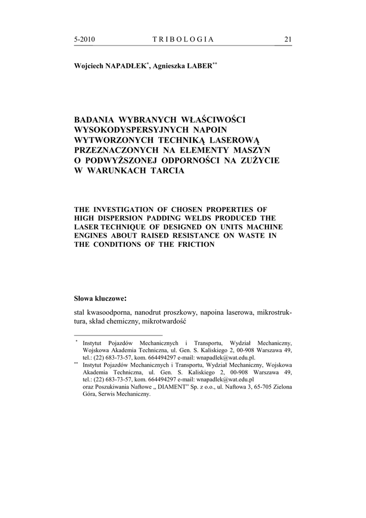 5-2010 TRIBOLOGIA 21 Wojciech NAPADŁEK∗, Agnieszka LABER∗∗ BADANIA WYBRANYCH WŁAŚCIWOŚCI WYSOKODYSPERSYJNYCH NAPOIN WYTWORZONYCH TECHNIKĄ LASEROWĄ PRZEZNACZONYCH NA ELEMENTY MASZYN O PODWYśSZONEJ ODPORNOŚCI NA ZUśYCIE W WARUNKACH TARCIA THE INVESTIGATION OF CHOSEN PROPERTIES OF HIGH DISPERSION PADDING WELDS PRODUCED THE LASER TECHNIQUE OF DESIGNED ON UNITS MACHINE ENGINES ABOUT RAISED RESISTANCE ON WASTE IN THE CONDITIONS OF THE FRICTION Słowa kluczowe: stal kwasoodporna, nanodrut proszkowy, napoina laserowa, mikrostruktura, skład chemiczny, mikrotwardość ∗ ∗∗ Instytut Pojazdów Mechanicznych i Transportu, Wydział Mechaniczny, Wojskowa Akademia Techniczna, ul. Gen. S. Kaliskiego 2, 00-908 Warszawa 49, tel.: (22) 683-73-57, kom. 664494297 e-mail: [email protected]. Instytut Pojazdów Mechanicznych i Transportu, Wydział Mechaniczny, Wojskowa Akademia Techniczna, ul. Gen. S. Kaliskiego 2, 00-908 Warszawa 49, tel.: (22) 683-73-57, kom. 664494297 e-mail: [email protected] oraz Poszukiwania Naftowe „ DIAMENT” Sp. z o.o., ul. Naftowa 3, 65-705 Zielona Góra, Serwis Mechaniczny. 22 TRIBOLOGIA 5-2010 Key words: acid resistant steel, pulveraceous nanowire, laser padd weld, microstructure, chemical composition, microhardness Streszczenie W pracy przedstawiono wybrane wyniki badań laboratoryjnych w zakresie wytwarzania wysokodyspersyjnych napoin z nanodrutu proszkowego Castolin EnDOtec DO390N na stali kwasoodpornej 0H18N9 z wykorzystaniem techniki laserowej. Przedstawiono topografię powierzchni lica napoin dla wybranych parametrów obróbki laserowej. Ze względu na specyficzny skład chemiczny stali kwasoodpornej oraz materiału napoiny, a takŜe duŜy szok termiczny, jaki powstał w procesie napawania laserowego stwierdzono liczne makro- i mikropęknięcia napoiny. Badania mikrostruktury wykazały wysokodyspersyjną mikro- i nanostrukturę, w której cząstki faz węglików (MC) o duŜej objętości, węglików boru M23(BC) oraz borków M2B są rozmieszczone w drobnoziarnistej osnowie Ŝelaza. Ze względu na kilkukrotne przetapianie laserowe warstwy napoiny stwierdzono duŜe zróŜnicowanie składu chemicznego w mikroobszarach oraz duŜą niejednorodność mikrostruktury. Twardość powierzchni ww. napoiny wynosiła 68–72 HRC. Pomiary mikrotwardości w przekroju poprzecznym wykazały bardzo wysokie wartości wynoszące nawet 990–1100 HV0,1. Uzyskane wyniki nie są zadowalające ze względu na liczne mikropęknięcia, dlatego naleŜy prowadzić dalsze badania laboratoryjne nad opracowaniem technologii mikroonapawania laserowego z uŜyciem nanodrutów proszkowych o małych średnicach (0,6–0,8 mm). WPROWADZENIE Dynamiczny rozwój przemysłu wymusza wytwarzanie nowoczesnych materiałów inŜynierskich w celu optymalizacji własności, a co za tym idzie wydłuŜenia czasu eksploatacji elementów maszyn i urządzeń, zminimalizowania powstawania odpadów i zanieczyszczenia środowiska. Taką perspektywę rozwoju stwarza szybko rozwijająca się nanotechnologia obejmująca naukę i inŜynierię dotyczącą wytwarzania materiałów, struktur funkcjonalnych i urządzeń uporządkowanych w skali nanometrycznej. 5-2010 TRIBOLOGIA 23 W technice przedrostek „nano” odpowiada 10-9 [m], więc nanostrukturalne materiały mogą zawierać do kilkudziesięciu tysięcy atomów [L. 1]. Nanostrukturalne materiały wymagają zatem precyzyjnego lokowania atomów lub ich grup oraz kontrolowania wielkości i składu utworzonych ziaren lub bloków, co skutkuje poszukiwaniem unikatowych metod technologicznych. Materiały nanostrukturalne to przykładowo kropki i druty kwantowe, cząstki, nanorurki, nanopręty, nanokryształy, metale, fazy międzymetaliczne, półprzewodniki, minerały, kompozyty, stopy, materiały organiczne, polimery, struktury i urządzenia funkcjonalne. Wymienione materiały mają zastosowanie m.in. w kosmonautyce, lotnictwie, przemyśle samochodowym, optoelektronice, medycynie oraz farmacji, na narzędzia skrawające, powłoki oraz systemy mikro- i nanomechaniczne MEMS/ NEMS. Trzeba nadmienić, Ŝe materiały nanostrukturalne wykazują odmienne własności mechaniczne, elektryczne, magnetyczne oraz optyczne od materiałów konwencjonalnych. Przykładowo ziarna miedzi wielkości 6 nm mają twardość pięciokrotnie większą od miedzi konwencjonalnej. Wśród materiałów nanostrukturalnych istotne miejsce zajmują materiały metalowe otrzymywane wskutek krystalizacji szkieł metalicznych [L. 2]. PowyŜsze materiały otrzymywane są metodą odlewania na szybko wirujący walec miedziany a następnie poddawane nanokrystalizacji cieplnej w trakcie wygrzewania w odpowiedniej temperaturze. Podczas nanokrystalizacji w wyniku zarodkowania i wzrostu w amorficznej osnowie stopu wydzielają się nanokrystaliczne cząstki roztworu o składzie osnowy, np. Alα, Ni(Mo)γ, Feα, Fe(Si)α, Coα, jak równieŜ faz międzymetalicznych odpowiadających składowi stopu, np. TiCo, TiNi, Fe14Nd2B, Fe14Pr2B, Co3B, Co2B. W zaleŜności od składu chemicznego w ten sposób powstałego materiału nanostrukturalnego uzyskuje się poprawę własności mechanicznych lub fizycznych. [L. 2]. Znaczne miejsce w inŜynierii materiałowej zajmują nanodruty metalowe. W porównaniu z innymi systemami niskowymiarowymi mają dwa kierunki kwantowo ograniczone, w wyniku czego pozostaje jeden moŜliwy kierunek przewodnictwa elektrycznego. Ze względu na cechującą je wyjątkową gęstość stanów elektronowych, nanodruty wykazują odmienne własności optyczne, elektryczne i magnetyczne od ich trójwymiarowych, litych odpowiedników krystalicznych [L. 1, 2]. W technice spawalniczej dąŜy się równieŜ do nakładania cienkich, precyzyjnych powłok napawanych. Pozwala to na uzyskanie bardzo wy- 24 TRIBOLOGIA 5-2010 sokiej odporności na ścieranie i korozję, bardzo wysokiej twardości warstw napawanych, utrzymanie wysokich własności mechanicznych w wysokich temperaturach oraz bardzo niski współc