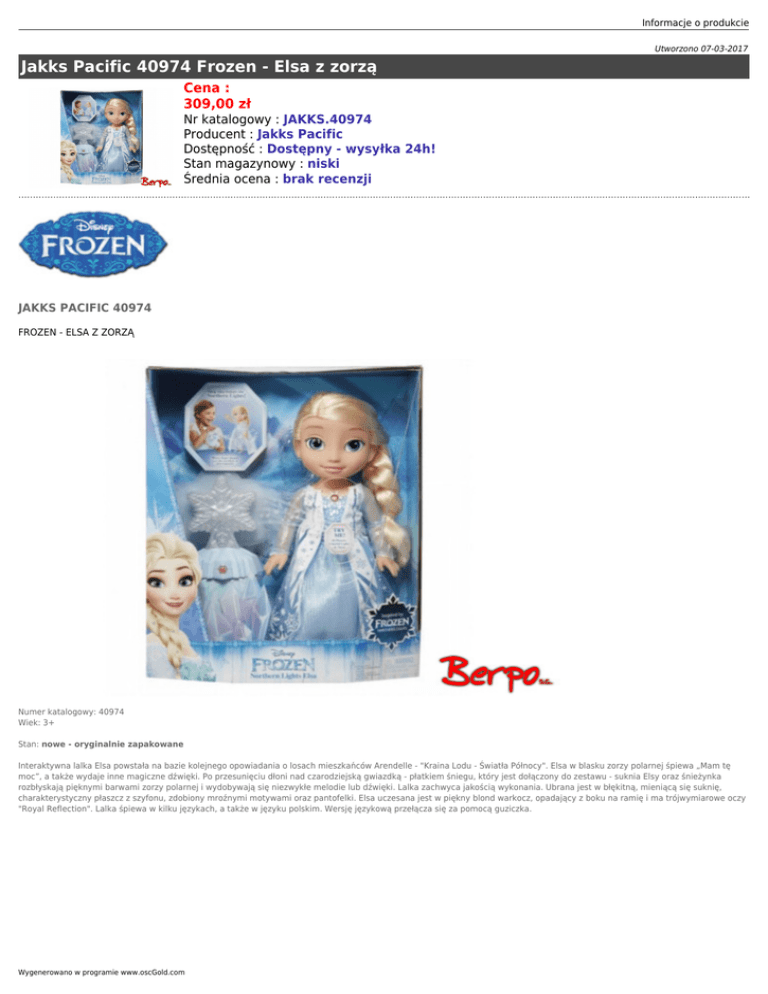 Informacje o produkcie Utworzono 07-03-2017 Jakks Pacific 40974 Frozen - Elsa z zorzą Cena : 309,00 zł Nr katalogowy : JAKKS.40974 Producent : Jakks Pacific Dostępność : Dostępny - wysyłka 24h! Stan magazynowy : niski Średnia ocena : brak recenzji JAKKS PACIFIC 40974 FROZEN - ELSA Z ZORZĄ Numer katalogowy: 40974 Wiek: 3+ Stan: nowe - oryginalnie zapakowane Interaktywna lalka Elsa powstała na bazie kolejnego opowiadania o losach mieszkańców Arendelle - "Kraina Lodu - Światła Północy". Elsa w blasku zorzy polarnej śpiewa „Mam tę moc”, a także wydaje inne magiczne dźwięki. Po przesunięciu dłoni nad czarodziejską gwiazdką - płatkiem śniegu, który jest dołączony do zestawu - suknia Elsy oraz śnieżynka rozbłyskają pięknymi barwami zorzy polarnej i wydobywają się niezwykłe melodie lub dźwięki. Lalka zachwyca jakością wykonania. Ubrana jest w błękitną, mieniącą się suknię, charakterystyczny płaszcz z szyfonu, zdobiony mroźnymi motywami oraz pantofelki. Elsa uczesana jest w piękny blond warkocz, opadający z boku na ramię i ma trójwymiarowe oczy "Royal Reflection". Lalka śpiewa w kilku językach, a także w języku polskim. Wersję językową przełącza się za pomocą guziczka. Wygenerowano w programie www.oscGold.com Informacje o produkcie Dostępność w salonach: Ilość: Sklep - Złotniki: 1 Sklep - zlikwidowany: 0 Sklep - Szczepankowo: 0 Dostępne opcje Jakks Pacific 40974 Frozen - Elsa z zorzą » Wiek: 3 - 4 lat, 5 - 7 lat. Wygenerowano w programie www.oscGold.com