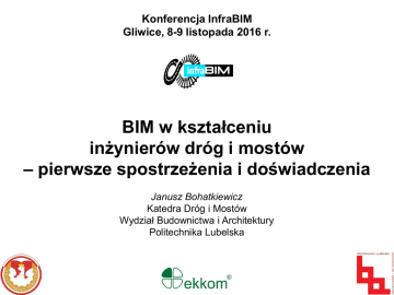 Konferencja InfraBIM Gliwice, 8-9 listopada 2016 r. BIM w kształceniu inżynierów dróg i mostów – pierwsze spostrzeżenia i doświadczenia Janusz Bohatkiewicz Katedra Dróg i Mostów Wydział Budownictwa i Architektury Politechnika Lubelska Plan prezentacji 1. BIM w edukacji – jak powinien być kształcony inżynier dróg i mostów 2. BIM w nowej specjalności prowadzonej przez Katedrę Dróg i Mostów - założenia 3. Wnioski – kiedy BIM zaistnieje na uczelniach technicznych? Jak powinien być kształcony inżynier budownictwa drogowego i mostowego? Źródło: Muzeum Techniki Drogowej i Mostowej w Zamościu. Artur Kühnel – Profesor Politechniki Lwowskiej – 1921 r. Historia projektowania Początek systemów CAD – III w. p. n. e. „Elementy” Euklidesa z Aleksandrii – podstawy geometrii wykorzystywanej w systemach CAD Źródło: Wikipedia Historia projektowania XVIII-XIX w. (rewolucja przemysłowa) – początek standaryzacji rysunków (a nawet norm) wymusił rozwój prawa patentowego i zwiększająca się liczba wniosków patentowych. 1824 r. Źródło: Szlaki trakty autostrady. GDDKiA, Warszawa, 2009 Historia projektowania II połowa XX w.: • powstają systemy komputerowe typu CAD (2D), • nadal używane są „ręczne” narzędzia kreślarskie. Historia projektowania Projektowanie współczesne W dużej części przypadków praca projektanta została sprowadzona do tego, żeby na zamówienie dostarczyć „płaską” 2D dokumentację • za jak najniższą cenę (coś drgnęło!) • z jak najmniejszą liczbą błędów • w jak najkrótszym czasie Zasady zarządzania projektami się nie zmieniły… zakres zakres zakres BIM w edukacji …skuteczne włączanie BIM do programu edukacji w budownictwie będzie krytycznym elementem w przygotowaniu przyszłych pracowników budownictwa… Obecnie (w 2014 r.) żadna polska uczelnia nie ma w swoim programie kompleksowego nauczania tej technologii … w naszym kraju większość projektantów BIM kojarzy z odgłosem bicia dzwonów („bim-bom”) Andrzej Tomana. BIM Innowacyjna technologia w budownictwie. Kraków, 2015 Jaka definicja BIM w edukacji drogowców i mostowców? BIM to PROCES TWÓRCZY generowania i wykorzystania danych o budowli, jej projektowania, budowy i eksploatacji w trakcie pełnego cyklu funkcjonowania. BIM pozwala, aby wszyscy zainteresowani uczestnicy inwestycji mieli dostęp do tych samych informacji, w tym samym czasie, przez interoperacyjność platform technologicznych. Dorna S., Glema A. Zastosowanie techniki skanowania dla geotechnicznych, architektonicznych, konstrukcyjnych oraz instalacyjnych aspektów tworzenia modelu BIM budynku. Licheń 2014. [w] Andrzej Tomana. BIM Innowacyjna technologia w budownictwie. Kraków, 2015 Jaka definicja BIM w edukacji drogowców i mostowców? BIM to PROCES TWÓRCZY generowania i wykorzystania danych o budowli, jej projektowania, budowy itoeksploatacji Interoperacyjność w trakcie pełnego cyklu funkcjonowania. zdolność systemów i organizacji do współpracy BIM pozwala, aby wszyscy zainteresowani uczestnicy inwestycji mieli dostęp do tych samych informacji, w tym samym czasie, przez interoperacyjność platform technologicznych. Dorna S., Glema A. Zastosowanie techniki skanowania dla geotechnicznych, architektonicznych, konstrukcyjnych oraz instalacyjnych aspektów tworzenia modelu BIM budynku. Licheń 2014. [w] Andrzej Tomana. BIM Innowacyjna technologia w budownictwie. Kraków, 2015 W jakim stopniu można wprowadzić BIM na Politechnice? aktualna siatka przedmiotów I stopień studiów – 2625 h – 120 h (9 %) to przedmioty drogowomostowe Przedmioty kierunkowe: Budownictwo komunikacyjne (45 h) – sem. III (W-2, P-1) Przedmioty specjalistyczne do wyboru: Podstawy mostownictwa (75 h) – sem. V (W-2, P-1) Konstrukcje mostowe Wykonawstwo nawierzchni drogowych (60 h) – sem. VI (W-2, L-2) Technologia robót drogowych Drogi i ulice (60 h) – sem. VI (W-2, P-2) Budownictwo drogowe W jakim stopniu można wprowadzić BIM na Politechnice? aktualna siatka godzin specjalności „Drogi i mosty” II stopień studiów – 1140 h – 630 h (55 %) to przedmioty drogowomostowe Grupa treści podstawowych i kierunkowych: brak przedmiotów drogowo-mostowych Grupa treści specjalistycznych: 1. Fotogrametria 2. Mosty betonowe 3. Mosty metalowe 4. Technologia i organizacja robót drogowych 5. Inżynieria ruchu drogowego 6. Lotniska 7. Nawierzchnie drogowe 8. Drogi kolejowe 9. Mechanika nawierzchni 10. Wzmacnianie i remonty nawierzchni 11. Projektowanie dróg 12. Skrzyżowania i węzły Przedmioty do wyboru: 13. Dynamika i reologia konstrukcji mostowych Diagnostyka utrzymania i remonty mostów 14. Fundamenty i podpory mostów Posadowienie mostów Założenia do wprowadzenia nowej specjalności i BIM Nie jesteśmy w stanie wprowadzić BIM na wszystkich poziomach i wyłącznie jako specjalność Stan docelowy Do tej pory większość projektów Poziom 0 Jednobranżowe nieskoordynowane projekty 2D Po uruchomieniu nowej specjalności Poziom 1 Jednobranżowe skoordynowane projekty 2D i 3D ??? Poziom 3 Model zintegrowany Poziom 2 3D, 4D, 5D, 6D, (7D). Wspólny Zarządzanie cyklem wielobranżowy model życia projektowy 3D (elementy 4D i 5D) Założenia do wprowadzenia nowej specjalności i BIM Do specjalności „Drogi i mosty” wprowadzamy specyfikę dotyczącą urządzeń ochrony środowiska – nowa specjalność „Drogi, mosty i ekoinfrastruktura” Zagadnienia drogowe Zagadnienia mostowe Zagadnienia OŚ – oddziaływania ilościowe Zagadnienia OŚ – oddziaływania jakościowe wiedza ochrony środowiska kompetencje społeczne umiejętności wiedza budowlana BIM Kompetencje absolwenta specjalności: Drogi, mosty i ekoinfrastruktura Konferencja konsultacyjna Polskiego Kongresu Drogowego pt. „Propozycje optymalizacji realizacji inwestycji drogowych” Warszawa, 26.04.2016 r. W latach 2007-13 łączne nakłady inwestycyjne wyniosły 57 mld zł w zakresie budowy dróg