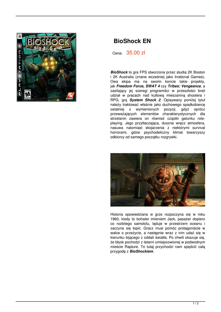 BioShock EN Cena: 35.00 zł BioShock to gra FPS stworzona przez studia 2K Boston i 2K Australia (znane wcześniej jako Irrational Games). Owa ekipa ma na swoim koncie takie projekty, jak Freedom Force, SWAT 4 czy Tribes: Vengeance, a zasilający jej szeregi programiści w przeszłości brali udział w pracach nad kultową mieszaniną shootera i RPG, grą System Shock 2. Opisywany poniżej tytuł należy traktować właśnie jako duchowego spadkobiercę ostatniej z wymienionych pozycji, gdyż oprócz przeważających elementów charakterystycznych dla strzelanin zawiera on również cząstki gatunku roleplaying. Jego przytłaczająca, duszna wręcz atmosfera, nasuwa natomiast skojarzenia z niektórymi survival horrorami, gdzie psychodeliczny klimat towarzyszy odbiorcy od samego początku rozgrywki. Historia opowiedziana w grze rozpoczyna się w roku 1960, kiedy to bohater imieniem Jack, pasażer dopiero co rozbitego samolotu, ląduje w przestrzeni oceanu i zaczyna się topić. Gracz musi pomóc protagoniście w walce o przeżycie, a następnie wraz z nim udać się w kierunku bijącego z oddali światła. Po chwili okazuje się, że błysk pochodzi z latarni umiejscowionej w podwodnym mieście Rapture. To tutaj przychodzi nam spędzić całą przygodę z BioShockiem. 1/2 Metropolia stanowi ogromny kompleks, zbudowany w 1946 roku przez amerykańskiego biznesmena, Andrew Ryana, po to, by stworzyć schron dla najwybitniejszych przedstawicieli ludzkiego gatunku (naukowców, artystów itp.). W kilka lat po II wojnie światowej projekt został zarzucony, a ukryte w głębinach oceanu miasto porzucone. W międzyczasie jednak dwaj badacze zamieszkujący Rapture dokonali przełomowego odkrycia. Na dnie morza znaleźli nieznany wcześniej gatunek ślimaków, mogący zmieniać ludzkie tkanki w komórki macierzyste. Stworzenia stały się źródłem substancji o nazwie ADAM, która przy właściwym stosowaniu zwiększa możliwości organizmu wykorzystujących ją osób, umożliwiając nawet osiągnięcie nieśmiertelności. Niezwykłe cechy chemicznej mieszaniny stały się przedmiotem licznych kontrowersji i doprowadziły nawet do konfliktu pomiędzy dystrybuującymi ją frakcjami. Rapture ogarnęła wojna, a w czasie jej trwania odkryto, że ADAM przyczynia się także do powstawania mutacji i uzależnień. W trakcie walk podwodna metropolia została całkowicie zrujnowana, a ci, którzy przeżyli toczoną w niej batalię, stracili resztki człowieczeństwa i ich egzystencja ograniczyła się głównie do poszukiwania ślimaczej substancji. Zobacz wideo: 2/2 Powered by TCPDF (www.tcpdf.org)