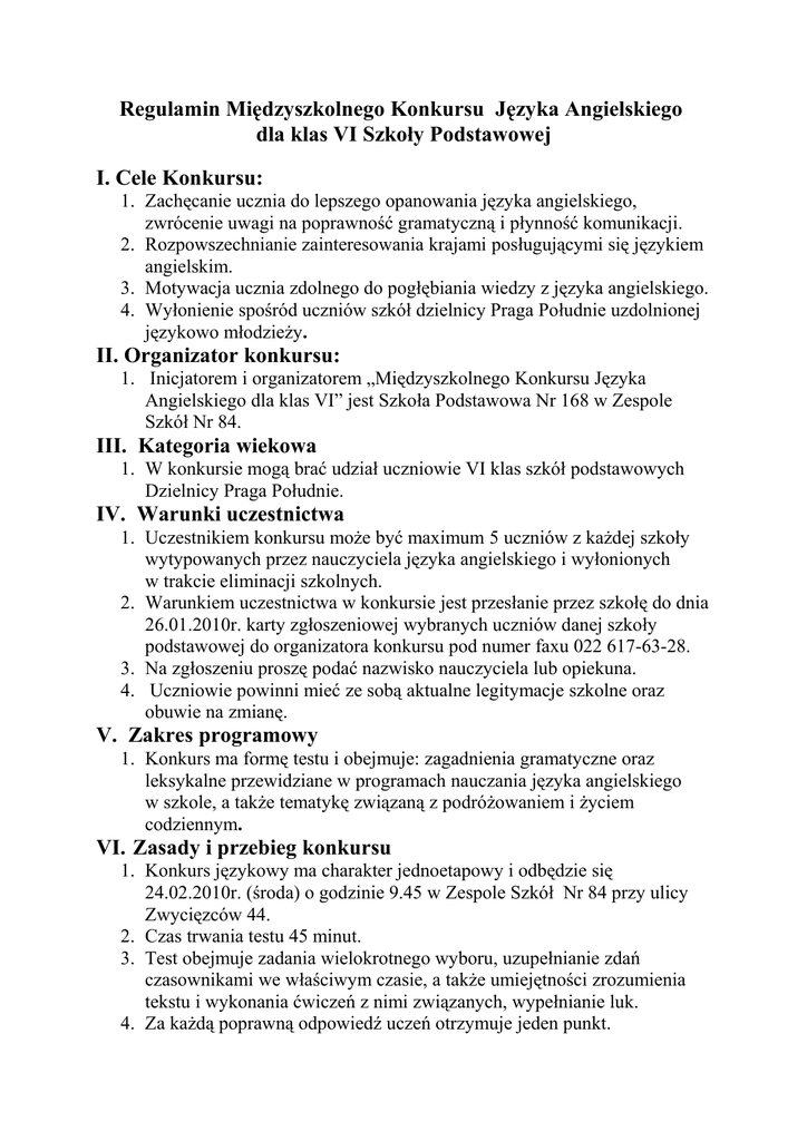 Regulamin Międzyszkolnego Konkursu Języka Angielskiego dla klas VI Szkoły Podstawowej I. Cele Konkursu: 1. Zachęcanie ucznia do lepszego opanowania języka angielskiego, zwrócenie uwagi na poprawność gramatyczną i płynność komunikacji. 2. Rozpowszechnianie zainteresowania krajami posługującymi się językiem angielskim. 3. Motywacja ucznia zdolnego do pogłębiania wiedzy z języka angielskiego. 4. Wyłonienie spośród uczniów szkół dzielnicy Praga Południe uzdolnionej językowo młodzieży. II. Organizator konkursu: 1. Inicjatorem i organizatorem „Międzyszkolnego Konkursu Języka Angielskiego dla klas VI” jest Szkoła Podstawowa Nr 168 w Zespole Szkół Nr 84. III. Kategoria wiekowa 1. W konkursie mogą brać udział uczniowie VI klas szkół podstawowych Dzielnicy Praga Południe. IV. Warunki uczestnictwa 1. Uczestnikiem konkursu może być maximum 5 uczniów z każdej szkoły wytypowanych przez nauczyciela języka angielskiego i wyłonionych w trakcie eliminacji szkolnych. 2. Warunkiem uczestnictwa w konkursie jest przesłanie przez szkołę do dnia 26.01.2010r. karty zgłoszeniowej wybranych uczniów danej szkoły podstawowej do organizatora konkursu pod numer faxu 022 617-63-28. 3. Na zgłoszeniu proszę podać nazwisko nauczyciela lub opiekuna. 4. Uczniowie powinni mieć ze sobą aktualne legitymacje szkolne oraz obuwie na zmianę. V. Zakres programowy 1. Konkurs ma formę testu i obejmuje: zagadnienia gramatyczne oraz leksykalne przewidziane w programach nauczania języka angielskiego w szkole, a także tematykę związaną z podróżowaniem i życiem codziennym. VI. Zasady i przebieg konkursu 1. Konkurs językowy ma charakter jednoetapowy i odbędzie się 24.02.2010r. (środa) o godzinie 9.45 w Zespole Szkół Nr 84 przy ulicy Zwycięzców 44. 2. Czas trwania testu 45 minut. 3. Test obejmuje zadania wielokrotnego wyboru, uzupełnianie zdań czasownikami we właściwym czasie, a także umiejętności zrozumienia tekstu i wykonania ćwiczeń z nimi związanych, wypełnianie luk. 4. Za każdą poprawną odpowiedź uczeń otrzymuje jeden punkt. VII. Kryteria oceny 1. Zwycięzcą konkursu zostaje uczeń, który zdobędzie najwyższą liczę punktów. VIII. Nagrody 1. Laureaci otrzymują nagrody książkowe oraz dyplomy. Pierwsze 3 miejsca będą nagrodzone dodatkową punktacją ubiegając się o przyjęcie do Gimnazjum Nr 25 z Oddziałami Dwujęzycznymi.