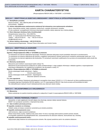 KARTA CHARAKTERYSTYKI (ROZPORZĄDZENIE (WE) n° 1907/2006 - REACH) KOL DENTALINE ACTIVSPA BUR 2 - 2586000 Wersja 1.1 (09-07-2015) - Strona 1/5 KARTA CHARAKTERYSTYKI (Rozporządzenie REACH (WE) nr 1907/2006 - nr 2015/830) SEKCJA 1 : IDENTYFIKACJA SUBSTANCJI/MIESZANINY I IDENTYFIKACJA SPÓŁKI/PRZEDSIĘBIORSTWA 1.1. Identyfikator produktu Nazwa produktu : KOL DENTALINE ACTIVSPA BUR 2 Kod produktu : 2586000. 1.2. Istotne zidentyfikowane zastosowania substancji lub mieszaniny oraz zastosowania odradzane Mycie i dezynfekcja wierteł, części zestawów medycznych, narzędzi obrotowych i kanałów W celu uzyskania szczegółowych informacji dotyczących produktu należy zapoznać się z treścią etykiety. 1.3. Dane dotyczące dostawcy karty charakterystyki Zarejestrowana nazwa firmy : KOL-DENTAL. Adres : ul. Cylichowska 6.04-769.Warszawa.Polska. Telefon : +48 22 514 62 91. Fax : +48 22 514 62 24. [email protected] 1.4. Numer telefonu alarmowego : +48 22 619 66 54. Stowarzyszenie/Organizacja : Warsaw Poison Information and Control Centre. SEKCJA 2 : IDENTYFIKACJA ZAGROŻEŃ 2.1. Klasyfikacja substancji lub mieszaniny Zgodnie z Rozporządzeniem (WE) nr 1272/2008 ze zmianami. Ta mieszanina nie stanowi zagrożenia fizycznego. Porównać zalecenia dotyczące innych produktów obecnych w pomieszczeniu. Ta mieszanina nie stwarza zagrożenia dla zdrowia z wyjątkiem ewentualnych wartości granicznych narażenia zawodowego (patrz par. 3 i 8). Ta mieszanina nie stanowi zagrożenia dla środowiska. W normalnych warunkach użytkowania nie są znane ani przewidywane żadne skutki dla środowiska. 2.2. Elementy oznakowania Mieszanina jest środkiem czyszczącym (patrz sekcja 15). Mieszanina ta jest przeznaczona wyłącznie do użytku profesjonalnego i z tego względu informacje o składzie zgodnie z rozporządzeniem dotyczącym detergentów nie znajdują się na etykiecie, ale są podane w sekcji 15. Zgodnie z Rozporządzeniem (WE) nr 1272/2008 ze zmianami. Zwroty wskazujące środki ostrożności - Ogólne : P102 Chronić przed dziećmi. Zwroty wskazujące środki ostrożności - Zapobieganie : P280 Stosować rękawice ochronne. 2.3. Inne zagrożenia Mieszanina nie zawiera 'Substancji wzbudzających szczególnie duże obawy' (SVHC) )>= 0.1% obecnych na liście opublikowanej przez Europejską Agencję Chemikaliów (ECHA) zgodnie z art. 57 rozporządzenia REACH: http://echa.europa.eu/fr/candidate-list-table Nie zidentyfikowano żadnych innych niebezpieczeństw przy obecnym stanie wiedzy. SEKCJA 3 : SKŁAD/INFORMACJA O SKŁADNIKACH 3.2. Mieszaniny Żadna substancja nie spełnia kryteriów podanych w załączniku II część A rozporządzenia REACH (WE) nr 1907/2006. SEKCJA 4 : ŚRODKI PIERWSZEJ POMOCY Generalnie, w razie wątpliwości lub jeśli objawy się utrzymują, zawsze należy wezwać lekarza. NIGDY nie wywoływać wymiotów u nieprzytomnej osoby. 4.1. Opis środków pierwszej pomocy W wypadku narażenia na inhalację : Oddalić osobę od miejsca narażenia i przenieść ją na świeże powietrze. W wypadku zanieczyszczenia oczu : Jeśli konieczne, zdjąć soczewki kontaktowe. Płukać dużą ilością czystej, miękkiej wody przez około 15 minut, trzymając jednocześnie powieki szeroko otwarte. W przypadku pojawienia się jakiegokolwiek bólu, zaczerwienienia lub zaburzeń widzenia, skonsultować się z okulistą. W wypadku zanieczyszczenia skóry : Natychmiast zdjąć skażone lub zanieczyszczone ubranie. Nie używać powtórnie zanim nie zostanie odkażone. Made under licence of European Label System, Software of INFODYNE (http://www.infodyne.fr) Quick-FDS [17886-29672-30392-018348] - 2016-12-19 - 08:14:33 KARTA CHARAKTERYSTYKI (ROZPORZĄDZENIE (WE) n° 1907/2006 - REACH) KOL DENTALINE ACTIVSPA BUR 2 - 2586000 Wersja 1.1 (09-07-2015) - Strona 2/5 Natychmiast wypłukać dużą ilością wody. W przypadku podrażnienia skóry, zasięgnąć porady lekarskiej. W wypadku połknięcia : Przepłukać usta, nie wywoływać wymiotów, uspokoić osobę, Natychmiast odprowadzić ją do szpitala lub do lekarza. Pokazać lekarzowi etykietkę. 4.2. Najważniejsze ostre i opóźnione objawy oraz skutki narażenia Proszę zobaczyć sekcję 11 4.3. Wskazania dotyczące wszelkiej natychmiastowej pomocy lekarskiej i szczególnego postępowania z poszkodowanym Proszę uwzględnić zalecenia lekarza SEKCJA 5 : POSTĘPOWANIE W PRZYPADKU POŻARU 5.1. Środki gaśnicze Odpowiednie środki gaśnicze Wszystki substancje gaszące ogień są dozwolone: piana, piasek, dwutlenek węgla, woda, proszek. 5.2. Szczególne zagrożenia związane z substancją lub mieszaniną W wyniku pożaru często powstaje gęsty, czarny dym. Narażenie na działanie produktów rozkładu może być niebezpieczne dla zdrowia. Nie wdychać dymu. 5.3. Informacje dla straży pożarnej Używać autonomicznego aparatu ochrony dróg oddechowych i kompletnego kombinezonu ochronnego. SEKCJA 6 : POSTĘPOWANIE W PRZYPADKU NIEZAMIERZONEGO UWOLNIENIA DO ŚRODOWISKA 6.1. Indywidualne środki ostrożności, sprzęt ochronny i procedury w sytuacjach awaryjnych Zapoznać się ze środkami bezpieczeństwa wymienionymi w punktach 7 i 8. 6.2. Środki ostrożności w zakresie ochrony środowiska Powstrzymać i zebrać wyciek lub rozlany materiał przy pomocy niepalnego absorbującego materiału jak piasek, ziemia, vermiculit, ziemia okrzemkowa, w beczkach do utylizacji. Nie wyrzucać do środowiska naturalnego. 6.3. Metody i materiały zapobiegające rozprzestrzenianiu się skażenia i służące do usuwania skażenia Rozproszoną substancję wchłaniać przy pomocy niepalnego materiału absorbującego, i zmieść lub usunąć szufelką. Odpady włożyć do beczek w celu ich usunięcia. Nie mieszać ich z innymi odpadami. Zanieczyszczoną powierzchnię myć dużą ilością wody. Nie odzyskiwać substancji w celu powtórnego użycia. 6.4. Odniesienia do innych sekcji Zalecenia dotyczące usuwania produktu : sekcja 13. SEKCJA 7 : POSTĘPOWANIE Z SUBSTANCJAMI I MIESZAN