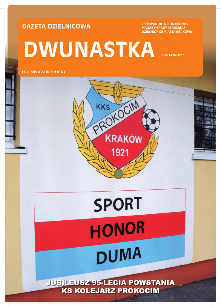 LISTOPAD 2016, ROK XXI, NR 7 MAGAZYN RADY I ZARZĄDU DZIELNICY XII MIASTA KRAKOWA ISSN 1426-3211 JUBILEUSZ 95-LECIA POWSTANIA KS KOLEJARZ PROKOCIM Miejsca gdzie znajdziesz naszą „Dwunastkę” WYDAWCA: Dzielnica XII Bieżanów-Prokocim REDAGUJE ZESPÓŁ: TOMASZ GUZIK - Redaktor Naczelny MIECZYSŁAW LASOTA RAFAŁ BUCHELT BARBARA LEŚNIAK ELŻBIETA MATYKIEWICZ PIOTR FĄFARA GRAŻYNA FIJAŁKOWSKA JOANNA GRZESZCZUK - korektor ADRES REDAKCJI: ul. Kurczaba 3, 30-868 Kraków tel./fax 012 658 26 11 e-mail: [email protected] SKŁAD, ŁAMANIE, DRUK: Drukarnia Kolejowa Kraków Sp. z o.o. Redakcja zastrzega sobie prawo do skracania i korekty artykułów oraz opatrzenia ich własnymi tytułami. Artykułów nie zamówionych redakcja nie zwraca. Za treść artykułów i prawa autorskie wykorzystanych zdjęć odpowiadają autorzy tekstów. Wydawca nie ponosi odpowiedzialności za treść reklam. Rada Dzielnicy XII Bieżanów-Prokocim ul. Kurczaba 3 tel./fax: 12 658 26 11 e-mail: [email protected] www.dzielnica12.krakow.pl Sekretariat przyjmuje: Poniedziałek 1200–1500 Wtorek 1400–1700 Środa 1200–1500 Czwartek 1200–1500 Piątek 1200–1500 DYŻURY CZŁONKÓW ZARZĄDU DZIELNICY XII BIEŻANÓW - PROKOCIM ZBIGNIEW KOŻUCH – Przewodniczący Rady i Zarządu Dzielnicy XII, piątek od 10:00 - 12:00 MARKOWICZ WIESŁAW – Zastępca Przewodniczącego Zarządu środa od 16:30 -18:00 KINGA WITKOWSKA – członek Zarządu poniedziałek od 10:00 -11:00 RAFAŁ BUCHELT – członek Zarządu wtorek od 17:00 - 18:30 MIECZYSŁAW LASOTA – członek Zarządu czwartek od godz. 17:00 - 18:00 Dyżury Radnych Miasta Krakowa GRAŻYNA FIJAŁKOWSKA – Radna Miasta Krakowa piątek od godz. 10:00 - 11:00 2 Nowy Prokocim: Sklep Rarytas ul. Ściegiennego Przychodnia ul. Teligi 8 SM Nowy Prokocim ul. Kurczaba 25 Kościół pw. Miłosierdzia Bożego Punkt Totolotka Plac Targowy Boisko Orlik ul. Jerzmanow skiego 4 Firma MJM ul. Teligi 34D Basen ul. Kurczaba 29 KRD Dyliniarnia ul. Wallenroda 55/56 Sklep spożywczy ul. Republiki Korczakowskiej 11 Salon fryzjerski ul. Republiki Korczakowskiej Biblioteka ul. Spółdzielców Przychodnia ul. Na Kozłówce Wypożyczalnia DVD Tip Top Stowarzyszenie Siemacha ul. Na kozłówce Bieżanów: Stowarzyszenie Rodzin Katolickich EDEN Przychodnia ul. Popiełuszki Sklep ul. Pruszyńskiego Sklep ul. Złocieniowa Dwór Czeczów Auto Robot System ul. Mała Góra 56 Zakład fryzjerski ul. Stacyjna Market Spar ul. Drożdżowa 2 Sklep przy Skwerze 800 lecia Bieżanowa Prokocim i Kozłówek: Sklep Lewiatan na Rynku Prokocimiskim SM Na Kozłówce ul. Spółdzielców Kaplica OO. Augustianów Nowy Bieżanów: Kościół pw. Najświętszej Rodziny Kiosk na deptaku ul. Aleksandry Przychodnia ul. Heleny Kiosk ul. Mała Góra 16 Kiosk przy deptaku (obok marketu Biedronka) Sklep Markiz ul. Ćwiklińskiej Kiosk ul. Aleksandry 23 Samorządowe Przedszkole nr 176 Złocień: SM Śnieżka Przychodnia Sklepy osiedlowe Rżąka: Mini market Oleńka Sklep Kak Zakład fryzjerski Anna Kościół pw. Najświętszej Maryji Panny Zespół Szkół nr 15 Sklep Zielony Smok Sklep ABC Avita ul. Schweitzera 13 Jadłodajnia DoMati ul. Rydygiera 31 Dyżury przedstawicieli Straży Miejskiej będą w każdą pierwszą środę miesiąca od 17.00 do 18.00 w siedzibie Rady Dzielnicy XII. Słowo Redaktora Naczelnego Trzymają Państwo w ręku kolejny numer „Dwunastki”. Ta gazeta pokazuje, że Dzielnica XII sportem stoi. W ostatnim czasie odbyło się 95-lecie KS Kolejarz Prokocim i wiele imprez sportowych organizowanych przez dzielnicowe szkoły. Postaramy się Państwu przedstawić również fotoreportaż z lokalnych obchodów Dnia Niepodległości. Przed nami w tym roku jeszcze dwa numery, grudniowy i noworoczny. Tradycyjnie zapraszamy do pisania do ,,Dwunastki”. W imieniu Zespołu Redakcyjnego Tomasz Guzik Redaktor Naczelny Spis treści Wydarzyło się . . . . . . . . . . . . . . . . . . . . . . . . . . . . . . . . . . . . . . . . . . . . . . . . . . . . . . . . . . . . . . . . . . . . . . . . . . . . . . . . . . . . . . . . . . . . . . . . . . 3-7 Najpiękniejsza rabata przed blokiem – lato 2016”. . . . . . . . . . . . . . . . . . . . . . . . . . . . . . . . . . . . . . . . . . . . . . . . . . . . . . . . . . . . . . . . . 8 Zadanie z polskiego. . . . . . . . . . . . . . . . . . . . . . . . . . . . . . . . . . . . . . . . . . . . . . . . . . . . . . . . . . . . . . . . . . . . . . . . . . . . . . . . . . . . . . . . . . . . . . 9 Widoczne są mury przyszłego przedszkola. . . . . . . . . . . . . . . . . . . . . . . . . . . . . . . . . . . . . . . . . . . . . . . . . . . . . . . . . . . . . . . . . . . . . . . . 9 Z Prac Rady. . . . . . . . . . . . . . . . . . . . . . . . . . . . . . . . . . . . . . . . . . . . . . . . . . . . . . . . . . . . . . . . . . . . . . . . . . . . . . . . . . . . . . . . . . . . . . . . . . . . 10 WIADOMOŚCI DLA MIESZKAŃCÓW. . . . . . . . . . . . . . . . . . . . . . . . . . . . . . . . . . . . . . . . . . . . . . . . . . . . . . . . . . . . . . . . . . . . . . . . . . . . . 10 95-lecie powstania KS Kolejarz Prokocim. . . . . . . . . . . . . . . . . . . . . . . . . . . . . . . . . . . . . . . . . . . . . . . . . . . . . . . . . . . . . . . . . . . . . . . . 11 Wydarzyło się... Ślubowanie w Zespole Szkół Ogólnokształcących Integracyjnych nr 4 im. Polskich Noblistów w Krakowie W dniu 13 października 2016r. składali uroczyste ślubowanie pierwszoklasiści zarówno szkoły podstawowej jak i gimnazjum. Uczniowie Gimnazjum z Oddziałami Integracyjnym nr 32 im. Polskich Noblistów rozpoczęli uroczystość mszą św. w parafialnym kościele pw. Miłosierdzia Bożego. Prowadzący ją ksiądz Piotr Pietruszka w kazaniu nawiązał, zarówno do zbliżającej się rocznicy 30 - lecia funkcjonowania szkoły ,,na Żabiej”, jak i do sytuacji biblijnego ogrodnika mającego drzewo figowe, jego cierpliwości i nadziei, z jaką czekał na owoce. Podobnie jest z nauczycielem, który nigdy nie podej