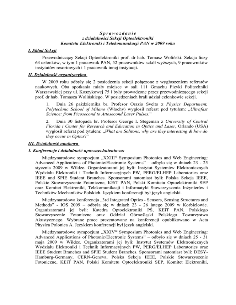 Sprawozdanie z działalności Sekcji Optoelektroniki Komitetu Elektroniki i Telekomunikacji PAN w 2009 roku I. Skład Sekcji Przewodniczący Sekcji Optoelektroniki prof. dr hab. Tomasz Woliński. Sekcja liczy 63 członków, w tym 1 pracownik PAN, 52 pracowników szkół wyższych, 9 pracowników instytutów resortowych i 1 pracownik innej instytucji. II. Działalność organizacyjna W 2009 roku odbyły się 2 posiedzenia sekcji połączone z wygłoszeniem referatów naukowych. Oba spotkania miały miejsce w sali 111 Gmachu Fizyki Politechniki Warszawskiej przy ul. Koszykowej 75 i były prowadzone przez przewodniczącego sekcji prof. dr hab. Tomasza Wolińskiego. W posiedzeniach brali udział członkowie sekcji. 1. Dnia 26 października br. Profesor Orazio Svelto z Physics Department, Polytechnic School of Milano (Włochy) wygłosił referat pod tytułem: „Ultrafast Science: from Picosecond to Attosecond Laser Pulses.” 2. Dnia 30 listopada br. Profesor George I. Stegeman z University of Central Florida i Center for Research and Education in Optics and Laser, Orlando (USA) wygłosił referat pod tytułem: „What are Solitons, why are they interesting & how do they occur in Optics?” III. Działalność naukowa 1. Konferencje i działalność upowszechnieniowa: Międzynarodowe sympozjum „XXIIIrd Symposium Photonics and Web Engineering: Advanced Applications of Photonic/Electronic Systems” – odbyło się w dniach 23 - 25 stycznia 2009 w Wildze. Organizatorami jej byli: Instytut Systemów Elektronicznych Wydziału Elektroniki i Technik Informacyjnych PW, PERG/ELHEP Laboratories oraz IEEE and SPIE Student Branches. Sponsorami natomiast byli: Polska Sekcja IEEE, Polskie Stowarzyszenie Fotoniczne, KEiT PAN, Polski Komitetu Optoelektroniki SEP oraz Komitet Elektroniki, Telekomunikacji i Informatyki Stowarzyszenia Inżynierów i Techników Mechaników Polskich. Językiem konferencji był język angielski. Międzynarodowa konferencja „3rd Integrated Optics - Sensors, Sensing Structures and Methods” - IOS 2009 – odbyła się w dniach 23 - 26 lutego 2009 w Korbielowie. Organizatorami jej byli: Katedra Optoelektroniki PŚ, KEiT PAN, Polskiego Stowarzyszenie Fotoniczne oraz Oddział Górnośląski Polskiego Towarzystwa Akustycznego. Wybrane prace prezentowane na konferencji opublikowano w Acta Physica Polonica A. Językiem konferencji był język angielski. Międzynarodowe sympozjum „XXIVrd Symposium Photonics and Web Engineering: Advanced Applications of Photonic/Electronic Systems” – odbyło się w dniach 25 - 31 maja 2009 w Wildze. Organizatorami jej byli: Instytut Systemów Elektronicznych Wydziału Elektroniki i Technik Informacyjnych PW, PERG/ELHEP Laboratories oraz IEEE Student Branches and SPIE Student Branches. Sponsorami natomiast byli: DESYHamburg-Germany, CERN-Geneva, Polska Sekcja IEEE, Polskie Stowarzyszenie Fotoniczne, KEiT PAN, Polski Komitetu Optoelektroniki SEP, Komitet Elektroniki, Telekomunikacji i Informatyki Stowarzyszenia Inżynierów i Techników Mechaników Polskich oraz IEEE Region 8 SAC. Językiem konferencji był język angielski. VIII Krajowa Konferencja Elektroniki – odbyła się w dniach 7 - 10 czerwca 2009 w Darłówku Wschodnim. Organizatorami jej byli: Wydział Elektroniki i Informatyki Politechniki Koszalińskiej oraz Polskie Towarzystwo Elektrotechniki Teoretycznej i Stosowanej. Pierwsza Polska Konferencja Optyczna – PKO 2009 – odbyła się w dniach 27 czerwca – 1 lipca 2009 w Będlewie koło Poznania. Organizatorami jej byli: Sekcja Optyki Polskiego Towarzystwa Fizycznego oraz Zakład Telekomunikacji Optycznej i Fotoniki Wydziału Elektrycznego Zachodniopomorskiego Uniwersytetu Technologicznego w Szczecinie. Międzynarodowa konferencja „XVIII Conference on Liquid Crystals: Chemistry, Physics and Applications” – odbyła się w dniach 14 - 18 września 2009 w Augustowie. Jej organizatorem był Instytut Fizyki Technicznej Wydziału Nowych Technologii i Chemii WAT. Językiem konferencji był język angielski. IX Krajowe Sympozjum Techniki Laserowej - STL 2009 – odbyło się w dniach 21 25 września 2009 w Świnoujściu. Organizatorami sympozjum byli: Instytut Elektroniki Telekomunikacji i Informatyki Wydziału Elektrycznego Zachodniopomorskiego Uniwersytetu Technologicznego w Szczecinie, Instytut Mikroelektroniki i Optoelektroniki PW oraz WAT. Międzynarodowa szkoła „X International Workshop Nonlinear Optics Applications” NOA 2009 – odbyła się w dniach 23 - 26 września 2009 w Zakopanem. Była organizowana przez Politechnikę Warszawską oraz Zachodniopomorski Uniwersytet Technologiczny w Szczecinie. Językiem szkoły był język angielski. XII krajowa konferencja i II szkoła „Światłowody i Ich Zastosowania” - TAL 2009 – odbyły się w dniach 14 - 17 października 2009 w Lublinie i Krasnobrodzie pod auspicjami KEiT PAN,, Polskiego Komitetu Optoelektroniki SEP i Polskiego Stowarzyszenia Fotonicznego. Organizatorami TAL 2009 byli: Zakład Technologii Światłowodów Uniwersytetu Marii Curie-Skłodowskiej oraz Katedra Elektroniki PL. III 2. Inicjatywy Komitetu w sprawie np. ocen stanu rozwoju uprawianych dyscyplin naukowych lub problemu, formułowania priorytetów badawczych w zakresie uprawianych dyscyplin naukowych objętej zakresem właściwości Komitetu Członkowie Sekcji Optoelektroniki brali udział w opracowaniu Studium wykonalności dla Strategicznego Programu Badawczego „Fotoniczne technologie i systemy pomiarowe w medycynie i innowacyjnej gospodarce – FOTEC”. Program ten miał być realizowany w latach 2009 – 2013. Wnioskodawcą projektu FOTEC była Politechnika Warszawska występująca w imieniu Konsorcjum Naukowego FOTEC. W skład konsorcjum wchodziło 20 jednostek naukowych. Celem projektu była realizacja strategicznego programu badawczego wykorzystującego unikalny potencjał naukowy polskich jednostek badawczych w dziedzinie nowoczesnych technologii fotonicznych. Projekt miał kompleksowy ch