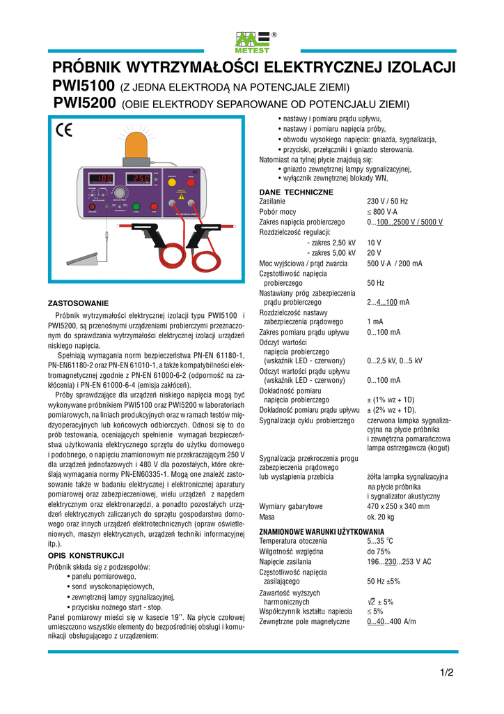 R PRÓBNIK WYTRZYMA£OŒCI ELEKTRYCZNEJ IZOLACJI PWI5100 (Z JEDNA ELEKTROD¥ NA POTENCJALE ZIEMI) PWI5200 (OBIE ELEKTRODY SEPAROWANE OD POTENCJA£U ZIEMI) PRZEBICIE mA · nastawy i pomiaru pr¹du up³ywu, · nastawy i pomiaru napiêcia próby, · obwodu wysokiego napiêcia: gniazda, sygnalizacja, · przyciski, prze³¹czniki i gniazdo sterowania. Natomiast na tylnej p³ycie znajduj¹ siê: · gniazdo zewnêtrznej lampy sygnalizacyjnej, · wy³¹cznik zewnêtrznej blokady WN, PRÓBA kV 50 mA NAPIĘCI E PROBIERCZE 100 mA ZAB. PRĄDOWE NAPIĘCIE PRÓBY ZEW. ZASILANIE WEW. STEROWANIE START STOP PRÓBNIK IZOLACJI PWI5200 Un = 10 kV D C / 8 k V AC In =1 A SW 1 SW 1 Un = 10k V D C / 8 kV A C In = 1 A ZASTOSOWANIE Próbnik wytrzyma³oœci elektrycznej izolacji typu PWI5100 i PWI5200, s¹ przenoœnymi urz¹dzeniami probierczymi przeznaczonym do sprawdzania wytrzyma³oœci elektrycznej izolacji urz¹dzeñ niskiego napiêcia. Spe³niaj¹ wymagania norm bezpieczeñstwa PN-EN 61180-1, PN-EN61180-2 oraz PN-EN 61010-1, a tak¿e kompatybilnoœci elektromagnetycznej zgodnie z PN-EN 61000-6-2 (odpornoœæ na zak³ócenia) i PN-EN 61000-6-4 (emisja zak³óceñ). Próby sprawdzaj¹ce dla urz¹dzeñ niskiego napiêcia mog¹ byæ wykonywane próbnikiem PWI5100 oraz PWI5200 w laboratoriach pomiarowych, na liniach produkcyjnych oraz w ramach testów miêdzyoperacyjnych lub koñcowych odbiorczych. Odnosi siê to do prób testowania, oceniaj¹cych spe³nienie wymagañ bezpieczeñstwa u¿ytkowania elektrycznego sprzêtu do u¿ytku domowego i podobnego, o napiêciu znamionowym nie przekraczaj¹cym 250 V dla urz¹dzeñ jednofazowych i 480 V dla pozosta³ych, które okreœlaj¹ wymagania normy PN-EN60335-1. Mog¹ one znaleŸæ zastosowanie tak¿e w badaniu elektrycznej i elektronicznej aparatury pomiarowej oraz zabezpieczeniowej, wielu urz¹dzeñ z napêdem elektrycznym oraz elektronarzêdzi, a ponadto pozosta³ych urz¹dzeñ elektrycznych zaliczanych do sprzêtu gospodarstwa domowego oraz innych urz¹dzeñ elektrotechnicznych (opraw oœwietleniowych, maszyn elektrycznych, urz¹dzeñ techniki informacyjnej itp.). OPIS KONSTRUKCJI Próbnik sk³ada siê z podzespo³ów: · panelu pomiarowego, · sond wysokonapiêciowych, · zewnêtrznej lampy sygnalizacyjnej, · przycisku no¿nego start - stop. Panel pomiarowy mieœci siê w kasecie 19''. Na p³ycie czo³owej umieszczono wszystkie elementy do bezpoœredniej obs³ugi i komunikacji obs³uguj¹cego z urz¹dzeniem: DANE TECHNICZNE Zasilanie Pobór mocy Zakres napiêcia probierczego Rozdzielczoœæ regulacji: - zakres 2,50 kV - zakres 5,00 kV Moc wyjœciowa / pr¹d zwarcia Czêstotliwoœæ napiêcia probierczego Nastawiany próg zabezpieczenia pr¹du probierczego Rozdzielczoœæ nastawy zabezpieczenia pr¹dowego Zakres pomiaru pr¹du up³ywu Odczyt wartoœci napiêcia probierczego (wskaŸnik LED - czerwony) Odczyt wartoœci pr¹du up³ywu (wskaŸnik LED - czerwony) Dok³adnoœæ pomiaru napiêcia probierczego Dok³adnoœæ pomiaru pr¹du up³ywu Sygnalizacja cyklu probierczego Sygnalizacja przekroczenia progu zabezpieczenia pr¹dowego lub wyst¹pienia przebicia Wymiary gabarytowe Masa 230 V / 50 Hz 800 VA 0...100...2500 V / 5000 V 10 V 20 V 500 VA / 200 mA 50 Hz 2...4...100 mA 1 mA 0...100 mA 0...2,5 kV, 0...5 kV 0...100 mA ± (1% wz + 1D) ± (2% wz + 1D). czerwona lampka sygnalizacyjna na p³ycie próbnika i zewnêtrzna pomarañczowa lampa ostrzegawcza (kogut) ¿ó³ta lampka sygnalizacyjna na p³ycie próbnika i sygnalizator akustyczny 470 x 250 x 340 mm ok. 20 kg ZNAMIONOWE WARUNKI U¯YTKOWANIA Temperatura otoczenia 5...35 oC Wilgotnoœæ wzglêdna do 75% Napiêcie zasilania 196...230...253 V AC Czêstotliwoœæ napiêcia zasilaj¹cego 50 Hz ±5% Zawartoœæ wy¿szych harmonicznych Wspó³czynnik kszta³tu napiecia Zewnêtrzne pole magnetyczne 2 ± 5% 5% 0...40...400 A/m 1/2 R PWI 5100 Próbnik wytrzyma³oœci elektrycznej izolacji PWI 5200 Próbnik wytrzyma³oœci elektrycznej izolacji - nastawa p³ynna napiêcia probierczego: 0...100 V...2,5/ 5 kV, - start w zerze sinusoidy - nastawa p³ynna progu zabezpieczenia pr¹du probierczego: 2...4...100 mA, - odczyt wartoœci napiêcia probierczego (wskaŸnik LED 20 mm) - pomiar pr¹du up³ywu (wskaŸnik LED 20 mm). - zewnêtrzna blokada funkcji start Elementy wyposa¿enia: - zewnêtrzna lapma ostrzegawcza typu (kogut), - no¿ny wy³¹cznik steruj¹cy, - sonda probiercza z przewodem HI, - przewód pomiarowy LO + krokodylek (akcesoria) - nastawa p³ynna napiêcia probierczego: 0...100 V...2,5/ 5 kV, - start w zerze sinusoidy - nastawa p³ynna progu zabezpieczenia pr¹du probierczego: 2...4...100 mA, - odczyt wartoœci napiêcia probierczego (wskaŸnik LED 20 mm) - pomiar pr¹du up³ywu (wskaŸnik LED 20 mm). - zewnêtrzna blokada funkcji start Elementy wyposa¿enia: - zewnêtrzna lapma ostrzegawcza typu (kogut), - no¿ny wy³¹cznik steruj¹cy, - dwie sondy probiercze z przewodem HI, PRZEBICIE mA mA 50 mA ZAB. PRĄDOWE NAPIĘCIE PRÓBY ZEW. WEW. STEROWANIE NAPIĘCIE PROBIERCZE 100 mA NAPIĘCIE PRÓBY ZEW. ZASILANIE HI START PRÓBA kV 50 mA NAPIĘCIE PROBIERCZE LO 100 mA ZAB. PRĄDOWE PRZEBICIE PRÓBA kV ZASILANIE STOP WEW. STEROWANIE START STOP PRÓBNIK IZOLACJI PWI5200 PRÓBNIK IZOLACJI PWI5100 SW1 Un = 10 kV DC/ 8 kV A C In =1A Un = 10 kV DC / 8 kV A C In = 1 A SW 1 S W1 Un = 10 kV DC / 8 kV A C In = 1 A PROBIERCZE Elementy steruj¹ce znajduj¹ce sie na p³ycie tylnej próbnika PWI5100 oraz PWI5200 Kluczyk do zał. / wył. zewnętrznej blokady funkcji START Zewnę trzna blokada funk cji START ZAŁ. WYŁ. u Lampa sygnalizacyjna u 4 A / 250 V Zewnętrzna blokada. Element pośredni: styk zwierny np. wyłącznik krańcowy 1,6 A/ 250 V 230 V / 50 Hz Zewnętrzna lampa ostrzegawcza W wykonaniach specjalnych próbnik PWI5100, PWI5200 mo¿e byæ wykonany z dodatow¹ funkcj¹: - timeru (ustawiania czasu próby), - przepalania, - do pracy ci¹g³ej np. w linii produkcyjnej - ze sterowaniem zewnêtrznym R WYKAZ NORM OKREŚLAJĄCYCH WARUNK