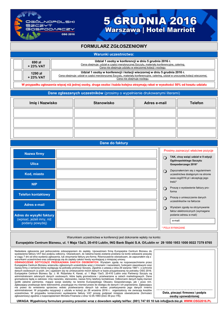 FORMULARZ ZGŁOSZENIOWY Warunki uczestnictwa: Udział 1 osoby w konferencji w dniu 5 grudnia 2016 r. 690 zł + 23% VAT Cena obejmuje: udział w części merytorycznej Szczytu, materiały konferencyjne, catering. Cena nie obejmuje udziału w wieczornej kolacji i noclegu. 1290 zł + 23% VAT Cena obejmuje: udział w części merytorycznej Szczytu, materiały konferencyjne, catering, udział w uroczystej kolacji wieczornej. Cena nie obejmuje noclegu. Udział 1 osoby w konferencji i kolacji wieczornej w dniu 5 grudnia 2016 r. W przypadku zgłoszenia więcej niż jednej osoby, druga osoba i każda kolejna otrzymają rabat w wysokości 50% od kosztu udziału Dane zgłaszanych uczestników (prosimy o wypełnienie drukowanymi literami) Imię i Nazwisko Stanowisko Adres e-mail Telefon Dane do faktury Prosimy zaznaczyć właściwe pozycje Nazwa firmy TAK, chcę wziąć udział w II edycji Ogólnopolskiego Szczytu Gospodarczego 2016* Zapoznałem/am się z regulaminem uczestnictwa dostępnym na stronie www.osg2016.pl i akceptuję jego treść* Proszę o wystawienie faktury proforma Proszę o umieszczenie danych uczestnika/ów na fakturze Wyrażam zgodę na otrzymywanie faktur elektronicznych (wymagane podanie adresu e-mail) Ulica Kod, miasto NIP Telefon kontaktowy Adres e-mail Adres do wysyłki faktury (wpisać, jeżeli inny, niż podany powyżej) e-mail: * POLA WYMAGANE Warunkiem uczestnictwa w konferencji jest dokonanie wpłaty na konto: Europejskie Centrum Biznesu, ul. 1 Maja 13a/3, 20-410 Lublin, ING Bank Śląski S.A. O/Lublin nr 29 1050 1953 1000 0022 7379 8765 Nadesłane zgłoszenie jest jednocześnie zobowiązaniem do zapłaty. Upoważniam firmę Europejskie Centrum Biznesu do wystawienia faktury VAT bez podpisu odbiorcy. Oświadczam, że należna kwota zostanie przelana na konto wskazane powyżej w ciągu 7 dni od dnia wysłania zgłoszenia, lub otrzymania faktury pro-forma. Równocześnie oświadczam, że zapoznałem się z warunkami uczestnictwa oraz zobowiązuję się do zapłaty całości kwoty wynikającej z niniejszej umowy. OŚWIADCZENIE DOTYCZĄCE PRZEKAZANIA DANYCH OSOBOWYCH: Wyrażam zgodę na rozpowszechnianie przez Europejskie Centrum Biznesu wizerunku zgłoszonych uczestników wraz z imionami i nazwiskami, funkcjami zawodowymi oraz nazwą firmy z ramienia której występują na potrzeby promocji Szczytu. Zgodnie z ustawą z dnia 29 sierpnia 1997 r. o ochronie danych osobowych (z późń. zm.) zgadzam się na umieszczenie moich danych w bazie przygotowanej na potrzeby OSG 2016. Europejskie Centrum Biznesu Sp. J. M. Różańska K. Karaś, ul. 1 Maja 13a/3, 20-410 Lublin oraz Partnerzy Szczytu są administratorami zebranych danych osobowych, które będą gromadzone i przetwarzane w celach marketingowych. Dane gromadzone będą w zakresie: imię nazwisko, stanowisko, nazwa firmy telefony kontaktowe. Odbiorcami danych będą również spółki zależne partnerów, mające swoje siedziby na terenie Europejskiego Obszaru Gospodarczego, jak i poza nim. Zgłaszający przekazuje dane dobrowolnie, przysługuje mu również prawo do dostępu do danych i ich poprawiania. Zgłaszający ma prawo do wniesienia sprzeciwu wobec przetwarzania danych lub wobec przekazywania jego danych innemu administratorowi. W przypadku rezygnacji z udziału w kolacji po 26 września 2016 r. organizatorzy nie zwracają kosztów uczestnictwa. W przypadku konieczności wystawienia faktury VAT proszę podpisać niniejsze oświadczenie (formularz zgłoszeniowy) zgodnie z rozporządzeniem Ministra Finansów z dnia 12.05.1993 (DzU 39 poz.176). …………………………......... Data, pieczęć firmowa i podpis osoby upoważnionej UWAGA: Wypełniony formularz prosimy przesłać wraz z dowodem wpłaty tel/fax: (081) 747 65 10 lub [email protected]. WWW.OSG2016.PL