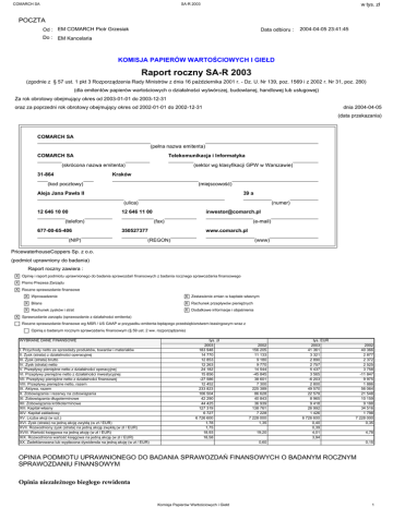 COMARCH SA w tys. zł SA-R 2003 POCZTA Od : EM COMARCH Piotr Grzesiak Data odbioru : 2004-04-05 23:41:45 Do : EM Kancelaria KOMISJA PAPIERÓW WARTOŚCIOWYCH I GIEŁD Raport roczny SA-R 2003 (zgodnie z § 57 ust. 1 pkt 3 Rozporządzenia Rady Ministrów z dnia 16 października 2001 r. - Dz. U. Nr 139, poz. 1569 i z 2002 r. Nr 31, poz. 280) (dla emitentów papierów wartościowych o działalności wytwórczej, budowlanej, handlowej lub usługowej) Za rok obrotowy obejmujący okres od 2003-01-01 do 2003-12-31 oraz za poprzedni rok obrotowy obejmujący okres od 2002-01-01 do 2002-12-31 dnia 2004-04-05 (data przekazania) COMARCH SA (pełna nazwa emitenta) COMARCH SA Telekomunikacja i Informatyka (skrócona nazwa emitenta) 31-864 (sektor wg klasyfikacji GPW w Warszawie) Kraków (kod pocztowy) (miejscowość) Aleja Jana Pawła II 39 a (ulica) 12 646 10 00 (numer) 12 646 11 00 (telefon) 677-00-65-406 [email protected] (fax) (e-mail) 350527377 (NIP) www.comarch.pl (REGON) (www) PricewaterhouseCoppers Sp. z o.o. (podmiot uprawniony do badania) Raport roczny zawiera : X Opinię i raport podmiotu uprawnionego do badania sprawozdań finansowych z badania rocznego sprawozdania finansowego X Pismo Prezesa Zarządu X Roczne sprawozdanie finansowe X Wprowadzenie X Zestawienie zmian w kapitale własnym X Bilans X Rachunek przepływów pieniężnych X Rachunek zysków i strat X Dodatkowe informacje i objaśnienia X Sprawozdanie zarządu (sprawozdanie z działalności emitenta) Roczne sprawozdanie finansowe wg MSR / US GAAP w przypadku emitenta będącego przedsiębiorstwem leasingowym wraz z Opinią o badanym rocznym sprawozdaniu finansowym (§ 59 ust. 2 ww. rozporządzenia) WYBRANE DANE FINANSOWE I. Przychody netto ze sprzedaży produktów, towarów i materiałów II. Zysk (strata) z działalności operacyjnej III. Zysk (strata) brutto IV. Zysk (strata) netto V. Przepływy pieniężne netto z działalności operacyjnej VI. Przepływy pieniężne netto z działalności inwestycyjnej VII. Przepływy pieniężne netto z działalności finansowej VIII. Przepływy pieniężne netto, razem IX. Aktywa, razem X. Zobowiązania i rezerwy na zobowiązania XI. Zobowiązania długoterminowe XII. Zobowiązania krótkoterminowe XIII. Kapitał własny XIV. Kapitał zakładowy XV. Liczba akcji (w szt.) XVI. Zysk (strata) na jedną akcję zwykłą (w zł / EUR) XVII. Rozwodniony zysk (strata) na jedną akcję zwykłą (w zł / EUR) XVIII. Wartość księgowa na jedną akcję (w zł / EUR) XIX. Rozwodniona wartość księgowa na jedną akcję (w zł / EUR) XX. Zadeklarowana lub wypłacona dywidenda na jedną akcję (w zł / EUR) tys. zł 2003 183 948 14 770 12 853 12 263 24 182 15 856 -27 586 12 452 233 823 106 504 42 290 44 425 127 319 6 727 6 726 600 1,78 1,75 18,93 18,58 2002 156 205 11 133 9 180 9 770 14 544 -45 845 38 601 7 300 225 389 86 628 40 843 36 939 138 761 7 228 7 228 000 1,35 19,20 tys. EUR 2003 41 361 3 321 2 890 2 757 5 437 3 565 -6 203 2 800 49 570 22 579 8 965 9 418 26 992 1 426 6 726 600 0,40 0,39 4,01 3,94 2002 40 366 2 877 2 372 2 525 3 758 -11 847 9 975 1 886 56 064 21 548 10 159 9 188 34 516 1 798 7 228 000 0,35 0,60 4,78 0,15 OPINIA PODMIOTU UPRAWNIONEGO DO BADANIA SPRAWOZDAŃ FINANSOWYCH O BADANYM ROCZNYM SPRAWOZDANIU FINANSOWYM Opinia niezależnego biegłego rewidenta Komisja Papierów Wartościowych i Giełd 1 COMARCH SA SA-R 2003 w tys. zł Dla Akcjonariuszy i Rady Nadzorczej ComArch S.A. Przeprowadziliśmy badanie załączonego sprawozdania finansowego Spółki ComArch S.A. (zwanej dalej „Spółką”) z siedzibą w Krakowie przy Al. Jana Pawła II 39a, obejmującego: (a) wprowadzenie; (b) bilans sporządzony na dzień 31 grudnia 2003 r., który po stronie aktywów i pasywów wykazuje sumę 233.823 tys. zł; (c) rachunek zysków i strat za rok obrotowy od 1 stycznia do 31 grudnia 2003 r. wykazujący zysk netto w kwocie 12.263 tys. zł; (d) zestawienie zmian w kapitale własnym za rok obrotowy od 1 stycznia do 31 grudnia 2003 r. wykazujące zmniejszenie kapitału własnego o kwotę 11.442 tys. zł; (e) rachunek przepływów pieniężnych za rok obrotowy od 1 stycznia do 31 grudnia 2003 r. wykazujący wpływy pieniężne netto w kwocie 12.452 tys. zł; (f) dodatkowe informacje i objaśnienia. Za sporządzenie zgodnego z obowiązującymi przepisami sprawozdania finansowego oraz sprawozdania z działalności odpowiedzialny jest Zarząd Spółki. Naszym zadaniem było wyrażenie, na podstawie przeprowadzonego badania, opinii o sprawozdaniu finansowym. Badanie przeprowadziliśmy stosownie do obowiązujących na terytorium Rzeczypospolitej Polskiej: (a) przepisów rozdziału 7 Ustawy z dnia 29 września 1994 r. o rachunkowości („Ustawa” - tekst jednolity - Dz.U. z 2002 r. Nr 76 poz. 694 z późniejszymi zmianami); (b) norm wykonywania zawodu biegłego rewidenta, wydanych przez Krajową Radę Biegłych Rewidentów w Polsce. Badanie zostało zaplanowane i przeprowadzone tak, aby uzyskać wystarczającą pewność, że sprawozdanie finansowe nie zawiera istotnych błędów i przeoczeń. Badanie obejmowało między innymi sprawdzenie, na podstawie wybranej próby, dowodów potwierdzających kwoty i informacje wykazane w sprawozdaniu finansowym. Badanie obejmowało również ocenę zasad rachunkowości stosowanych przez Spółkę oraz istotnych oszacowań dokonywanych przy sporządzeniu sprawozdania finansowego, a także ogólną ocenę jego prezentacji. Uważamy, że nasze badanie stanowiło wystarczającą podstawę dla wyrażenia opinii. Informacje zawarte w sprawozdaniu z działalności Spółki za rok obrotowy od 1 stycznia do 31 grudnia 2003 r. uwzględniają przepisy Rozporządzenia Rady Ministrów z dnia 16 października 2001 r. w sprawie informacji bieżących i okresowych przekazywanych przez emitentów papierów wartościowych (Dz.U. z 2001 r. nr 139, poz. 1569 z późniejszymi zmianami) i są zgodne z informacjami zawartymi w zbadanym sprawozdaniu finansowym. Naszym zdaniem, załączone sp